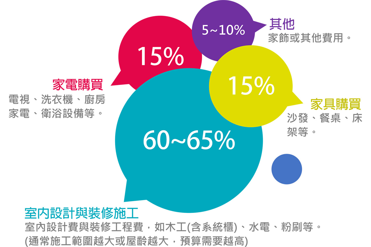 燈具:全室燈具裝潢預算約抓$25,000~$50,000左右,費用會依照室內坪數大小、所選品牌、所需要的燈光設計配置而有所不同。