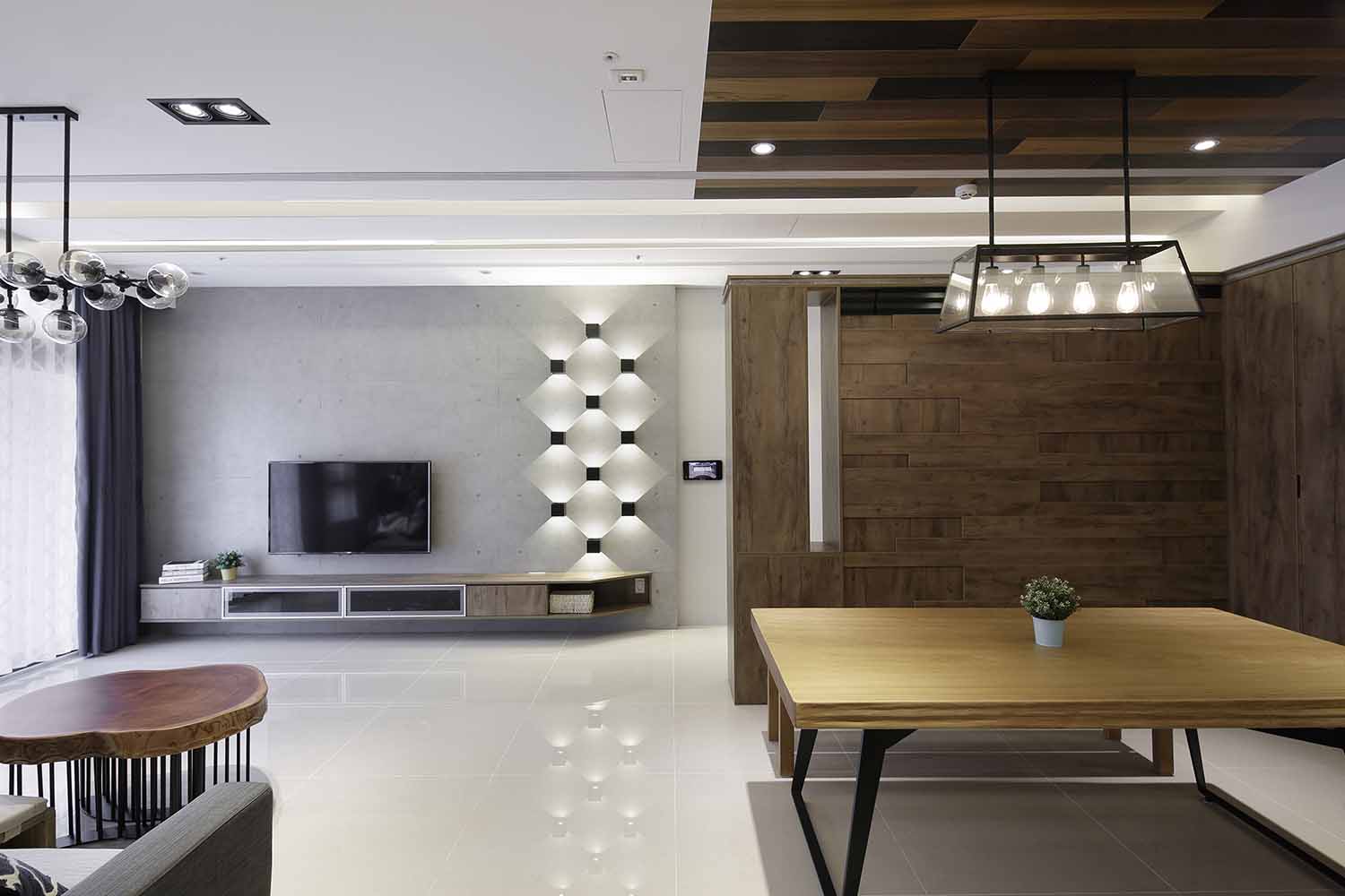 ▲借助天花的起伏,景深再一次帶來張弛的變化,沙發背牆延續玄關的中性灰,為區域間的轉換達到統一的平衡。