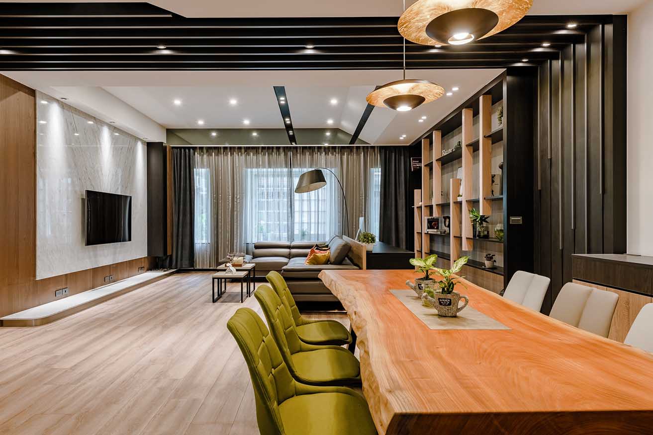 ▲天花板梁柱使用圓弧造型虛化,並結合燈光、畫軌與風琴廉設計。