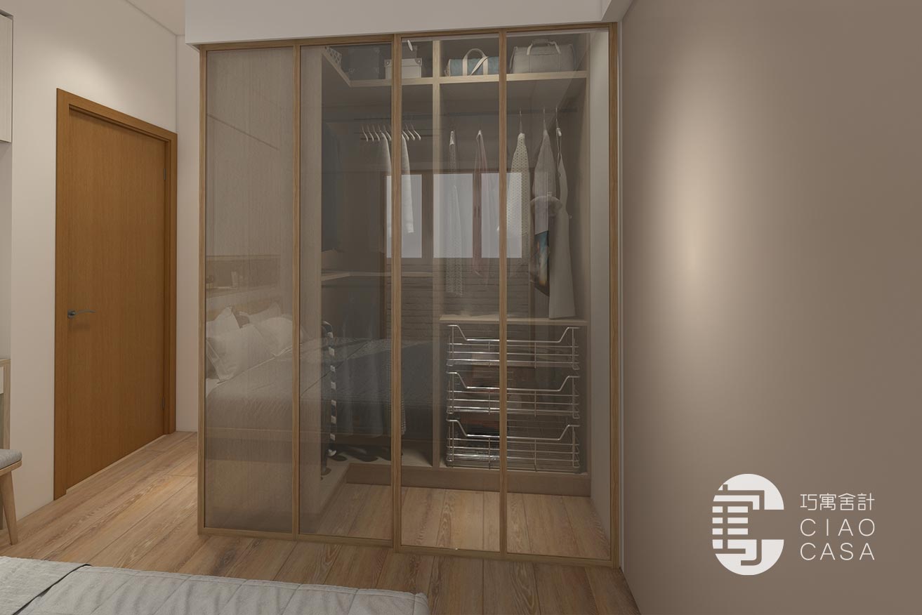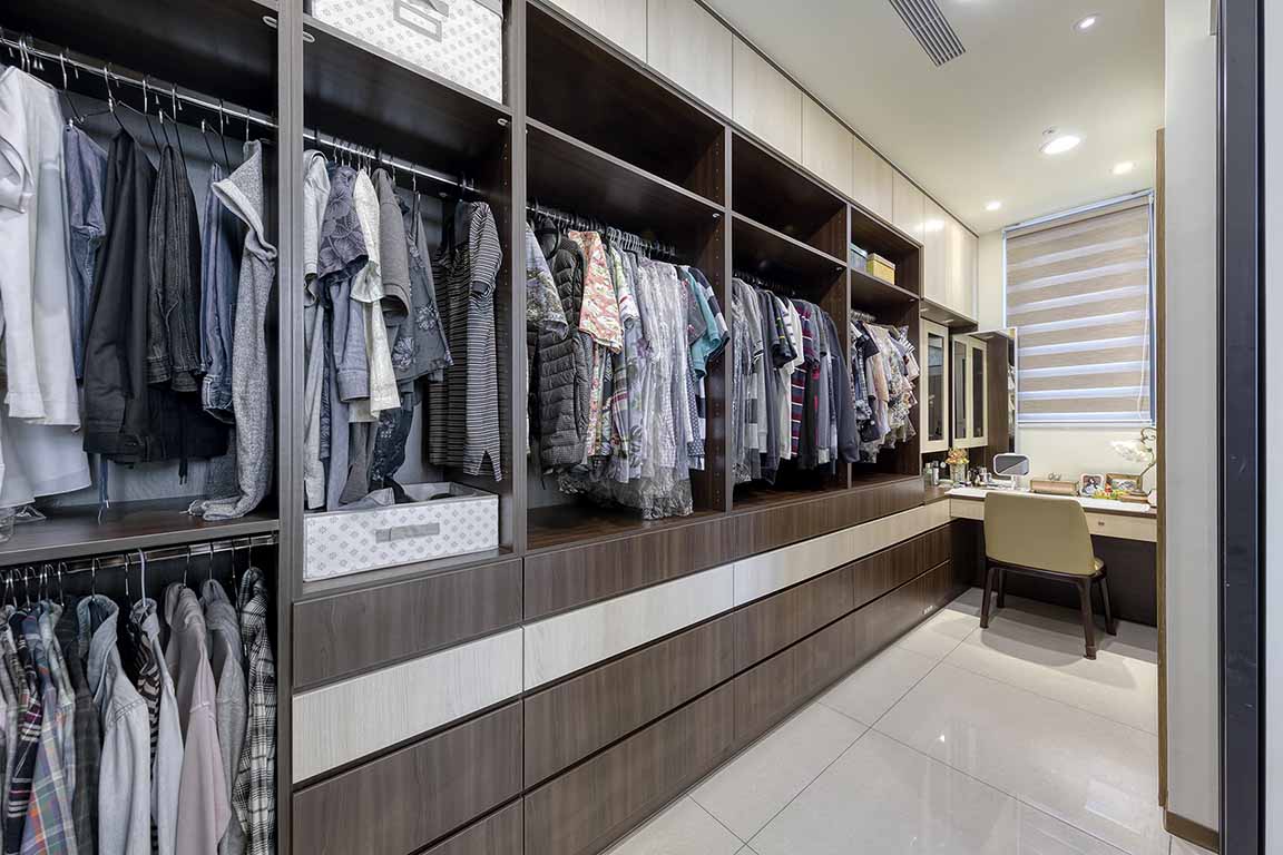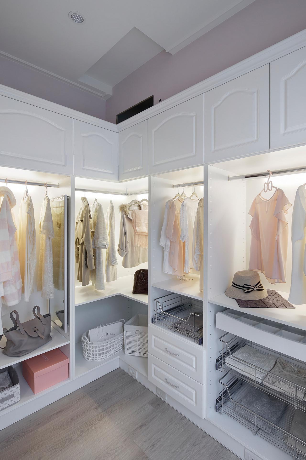 衣櫃的寬度建議至少100公分以上,女主人若衣物較多,建議保留200公分以上的空間,並依照衣物的長短來分配衣櫃內部區域,記得設計抽屜機能,放置貼身衣物、襪子等。