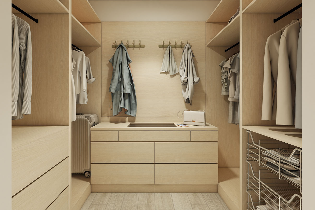 衣櫃內部設計,諮詢屋主的收納習慣後,完美融合日常需求與優雅風格。左側的專屬盥洗備品櫃,讓屋主用品整齊井然;下方的開放櫃格設計方便就手,讓待洗衣物也有個優雅的居所。化妝桌上方,細心設計了格櫃,無論是您的珍藏化妝品還是日常保養品,都能一目瞭然、取放自如。至於右側,更是衣物的完美天堂。不論是長短衣服、大衣外套,還是需要隱藏起來的貼身小物,這裡都有專屬的空間。每一個細節,都是為了讓您的生活更加優雅而設計。
