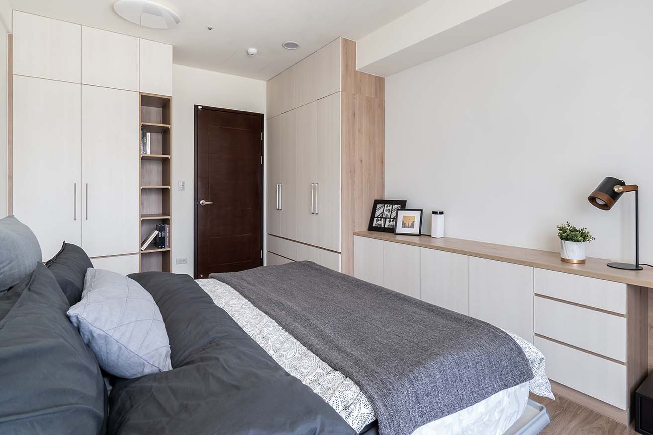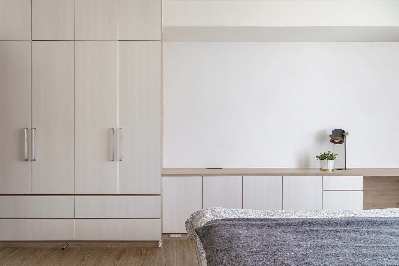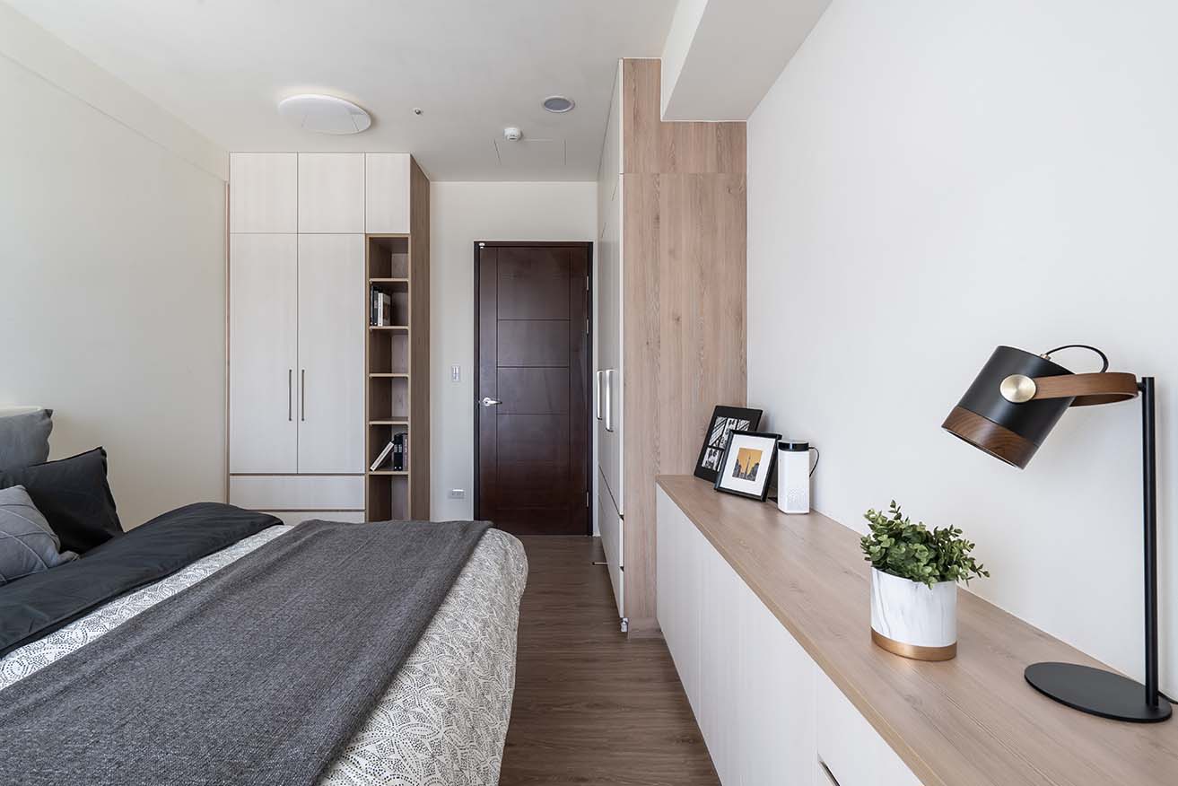 寢臥同樣藉由白、灰、木頭色調,鋪述柔和而舒緩的基底情調,為維持臥房的整潔度僅放置一張舒適大床,具有設計感的燈具在點亮空間的同時,也將生活品味輕巧置入其中,讓臥室場域充滿都會質感,而其餘的房間作為孝親房及客房,便於北上的雙親在此休息。屋主一家的東西不多,只採基本收納為主,且盡量保有自然簡單的收納空間,臥房衣櫥聰明搭配開放式層架,可將常運用到的物件放置於顯眼處,滿足日常穿搭的需求。
