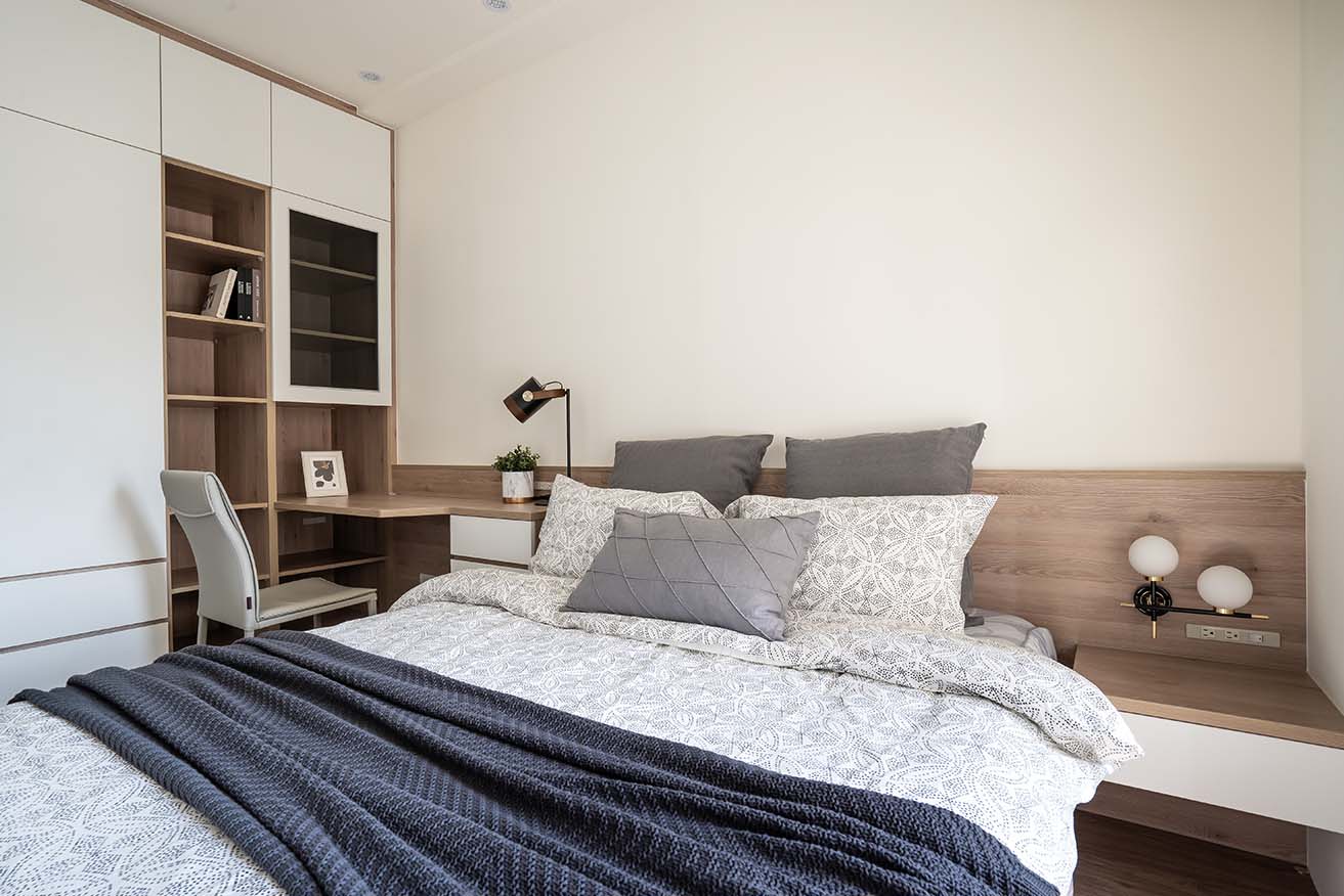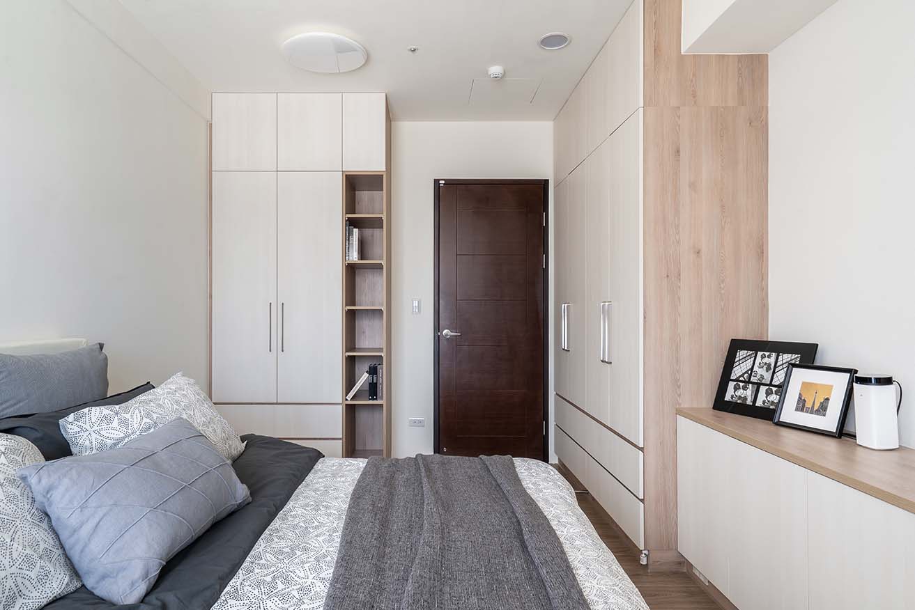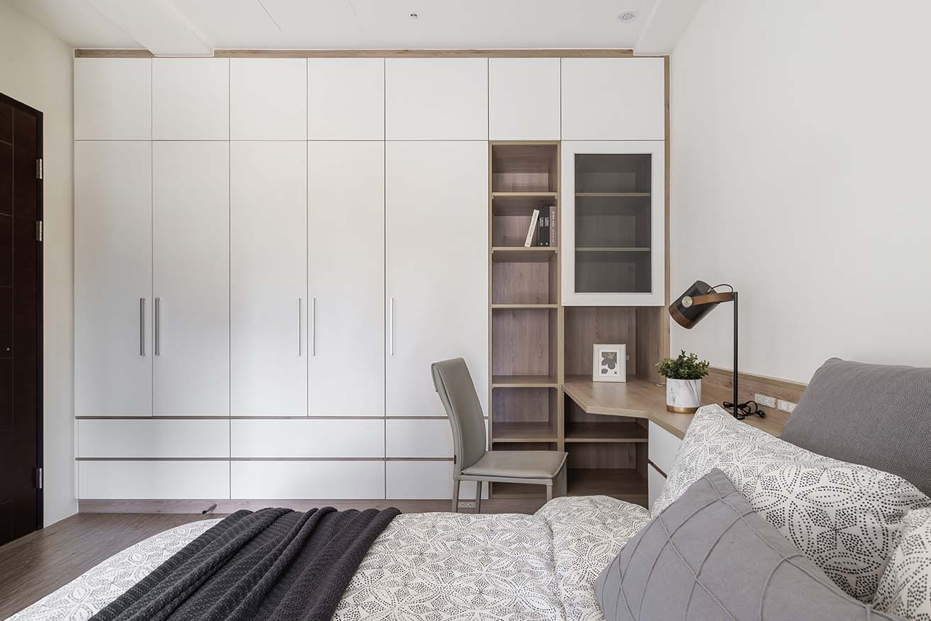 寢臥同樣藉由白、灰、木頭色調,鋪述柔和而舒緩的基底情調,為維持臥房的整潔度僅放置一張舒適大床,具有設計感的燈具在點亮空間的同時,也將生活品味輕巧置入其中,讓臥室場域充滿都會質感,而其餘的房間作為孝親房及客房,便於北上的雙親在此休息。屋主一家的東西不多,只採基本收納為主,且盡量保有自然簡單的收納空間,臥房衣櫥聰明搭配開放式層架,可將常運用到的物件放置於顯眼處,滿足日常穿搭的需求。