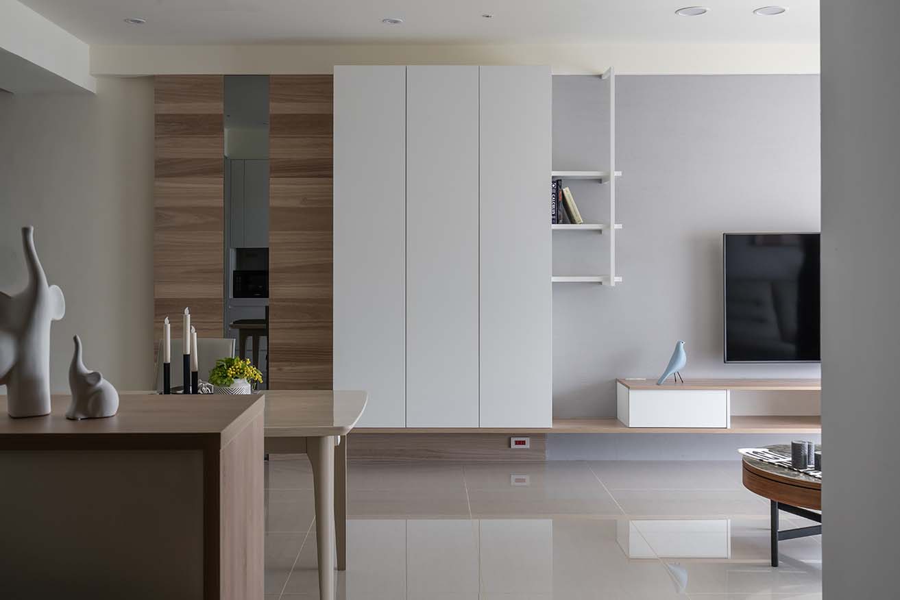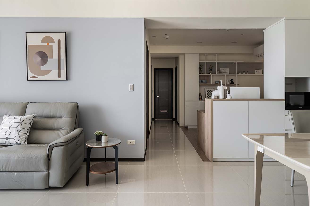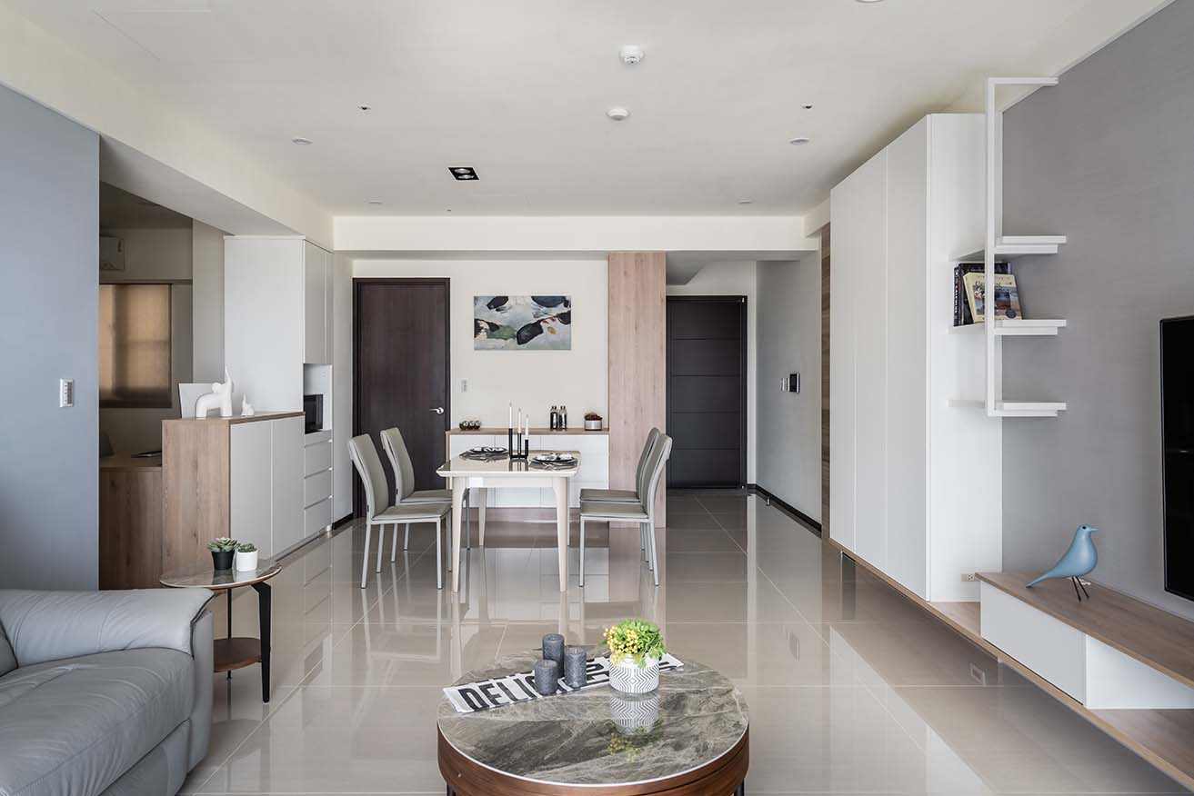 風格演繹上,設計從男主人喜愛的淺色木紋與石材元素為主軸,搭配大理石紋、白色鐵件、簡約現代燈飾及北歐藝術品等材質與軟裝,烘托獨有自然清新氛圍。回到家打開門第一眼就是清爽有序的空間,穿衣鏡結合木作櫃體,營造出充滿便利與明亮的使用效能,且巧妙遮飾後方配電箱。客廳以電視牆為中心的配置規劃,以拼接撞色讓主牆充滿視覺張力,帶有紋理的灰色調珪藻土,輔搭溫潤淺木質,使其在光影折射下富含優雅層次律動,塑造現代意象,活動家具建構出生活重心區域,並以可移動式家具為主,讓客廳更能靈活運用。用餐區延續客廳的木質感,想要來杯咖啡享受悠閒氛圍,也可轉移至此換個地方換個心情。