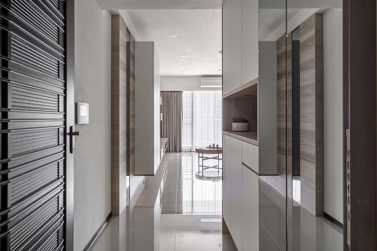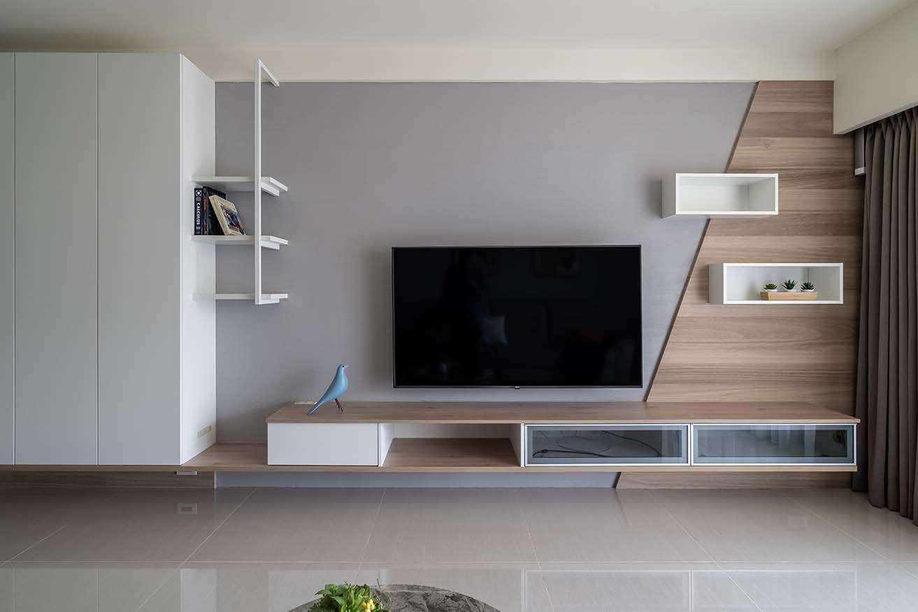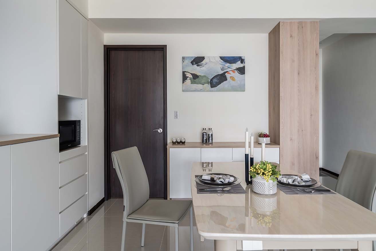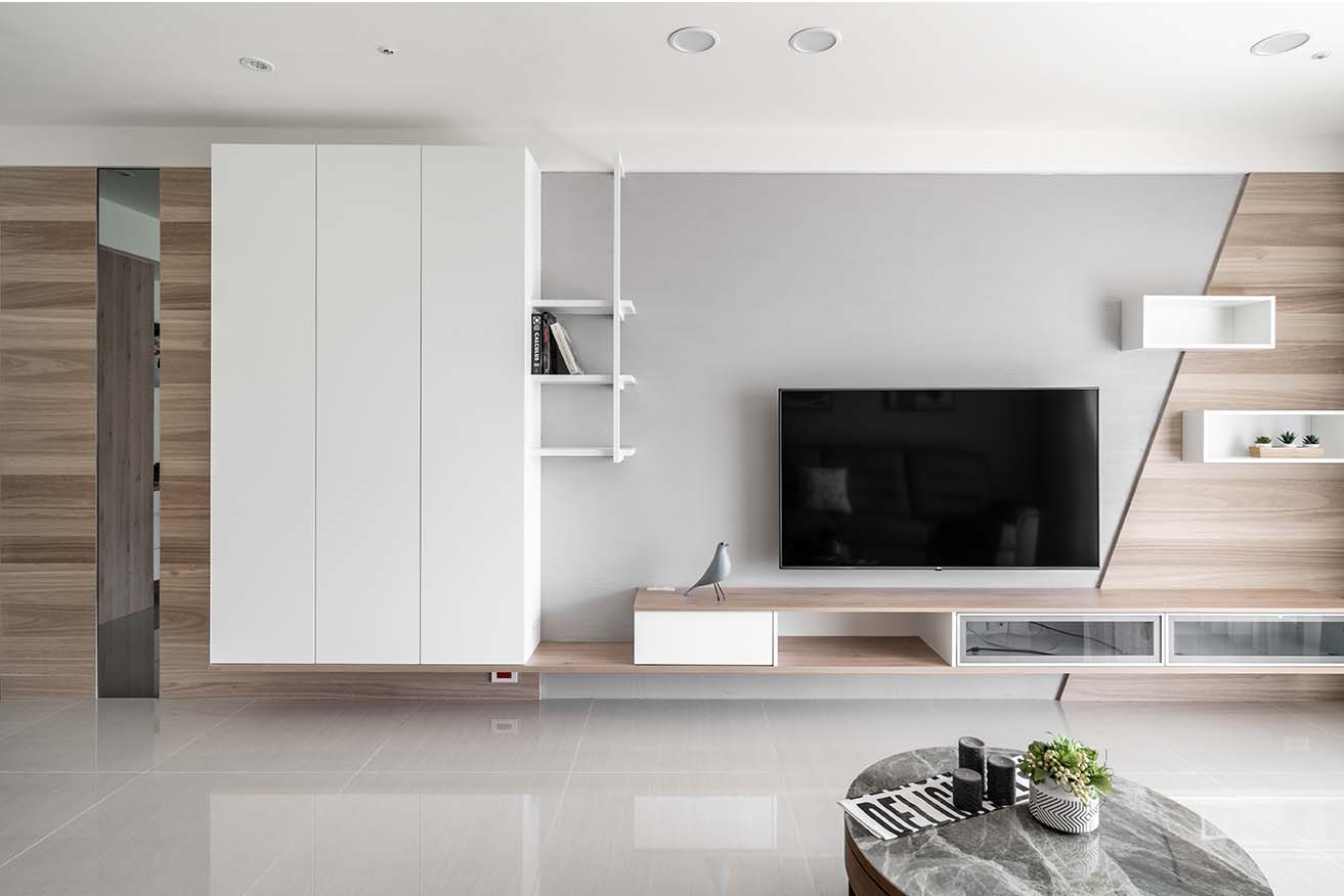 風格演繹上,設計從男主人喜愛的淺色木紋與石材元素為主軸,搭配大理石紋、白色鐵件、簡約現代燈飾及北歐藝術品等材質與軟裝,烘托獨有自然清新氛圍。回到家打開門第一眼就是清爽有序的空間,穿衣鏡結合木作櫃體,營造出充滿便利與明亮的使用效能,且巧妙遮飾後方配電箱。客廳以電視牆為中心的配置規劃,以拼接撞色讓主牆充滿視覺張力,帶有紋理的灰色調珪藻土,輔搭溫潤淺木質,使其在光影折射下富含優雅層次律動,塑造現代意象,活動家具建構出生活重心區域,並以可移動式家具為主,讓客廳更能靈活運用。用餐區延續客廳的木質感,想要來杯咖啡享受悠閒氛圍,也可轉移至此換個地方換個心情。