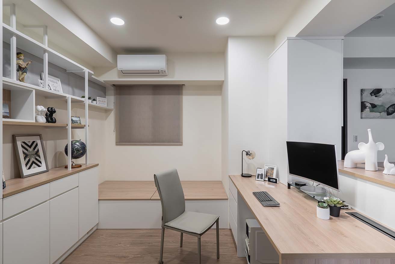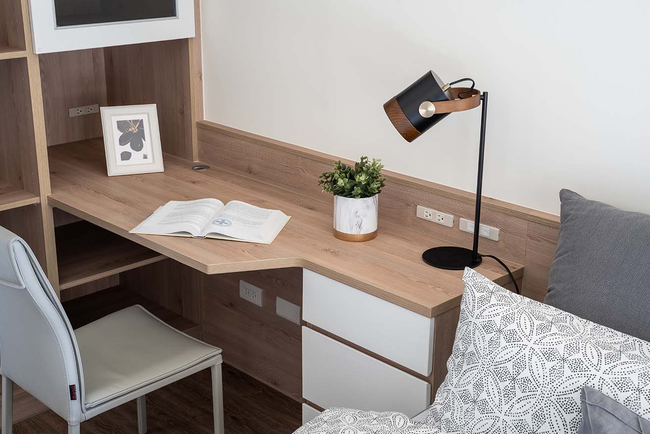 緊鄰著廚房的多功能書房是男主人最常待的空間,利用簡單的三個元素:層板、木紋與系統門片的設計帶出線條感,臥榻搭配掀床設計可收納多餘雜物,也展現歐德系統傢俱為坪數較小的臥室創造最大效用。大量藏書與資料整合就交給後方的木頭櫃,仔細觀望,上端以白色鐵件與橫樑連接的收納區,一併達成收納願望以及樑柱帶來的壓迫感。全室搭配智能家居系統的整合,打造便利性極高的環境,能以聲控或是遙控器調整各項3C 產品,輕鬆為男主人分擔家務事。