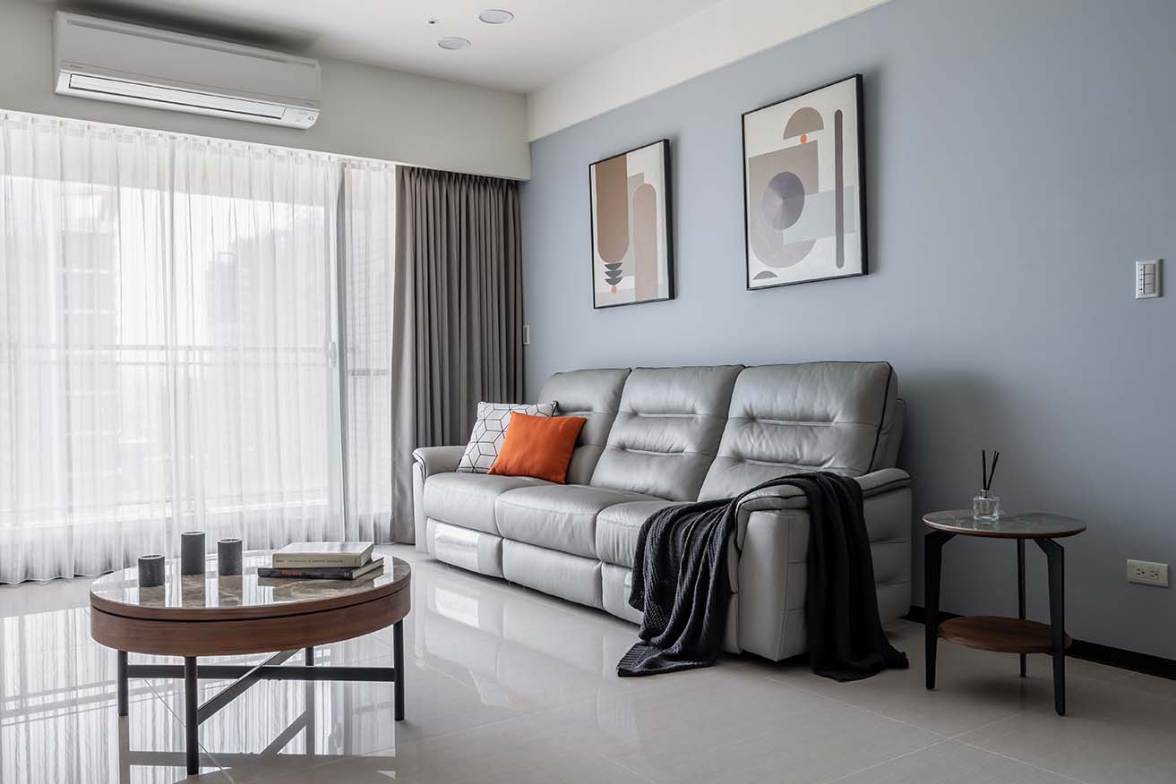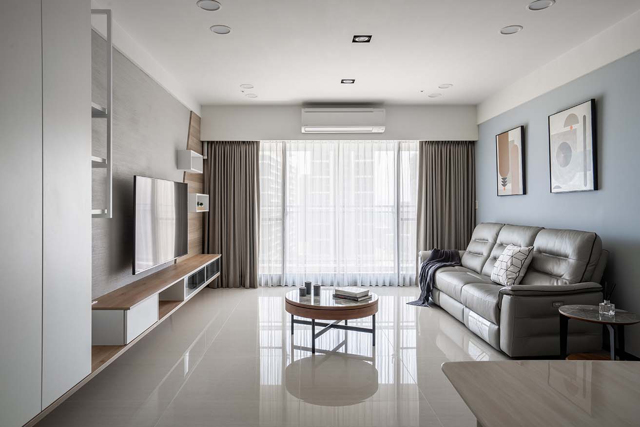 設計師王瑜甄所籌劃的單人住宅,有著50坪的寬綽中大尺度,在屋齡新以及採光條件優異下,為了不壓縮既有的朗闊視野,拆除多功能書房一面隔間牆,僅以櫃體區隔,打造客餐區、休憩區互為景深背景的一體連貫性,並用歐德系統櫃修飾掉一般現成家具遮不住的樑柱,巧妙形塑開敞的生活視野,而環繞通透的落地大窗讓光影恣意穿透大廳,塑造明亮無壓氣息,讓人一眼就愛上如此的絕佳景致。