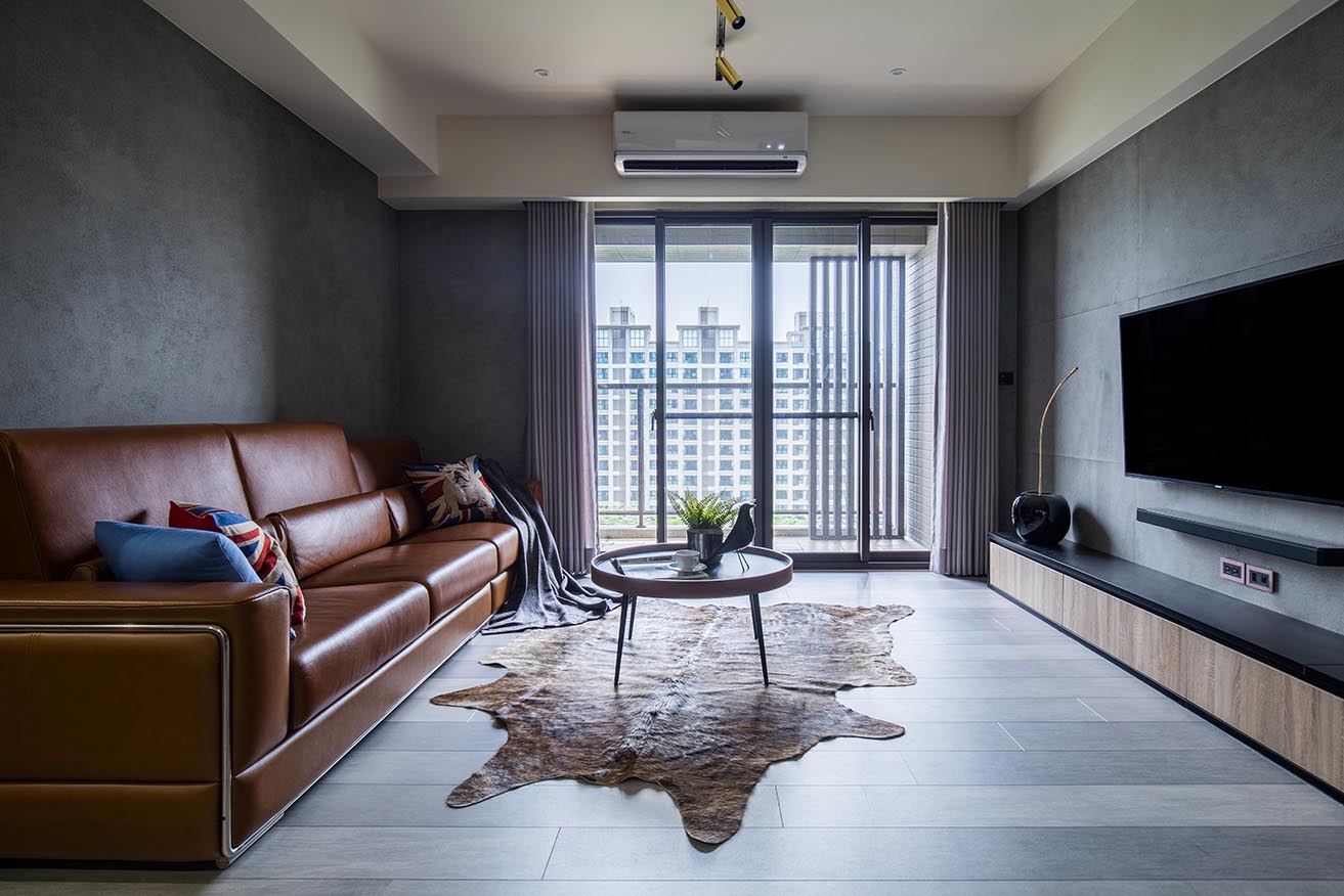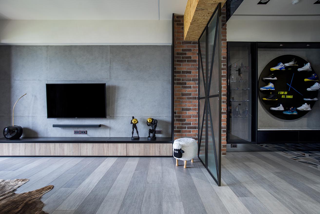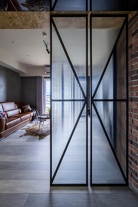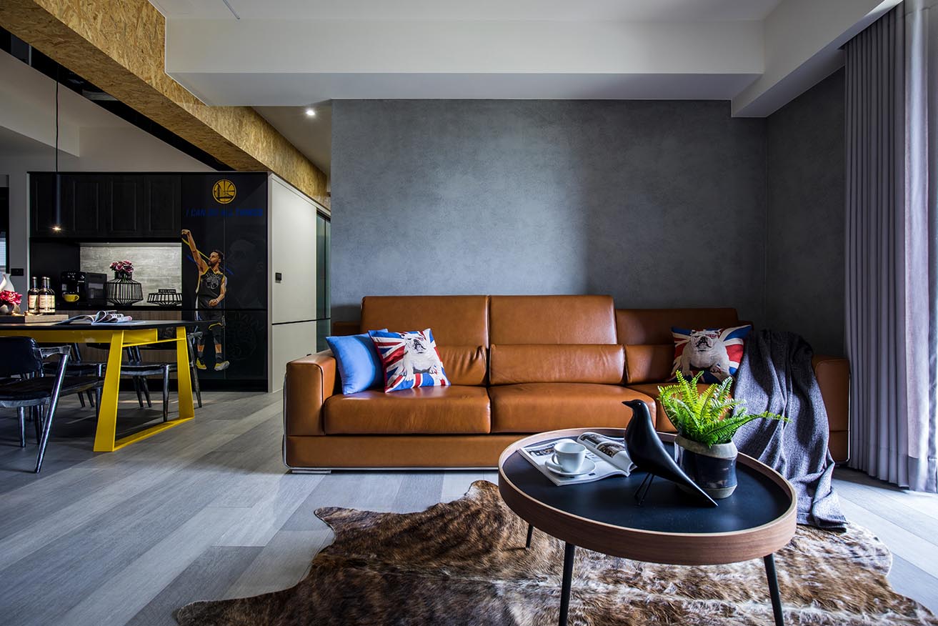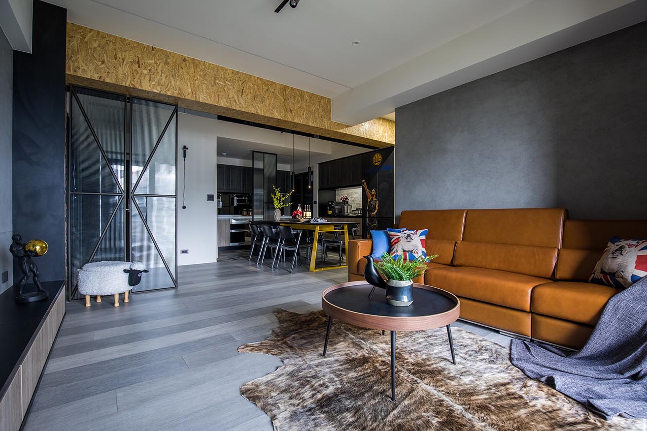 運用大量黑灰素材與系統板材構築全室色調,並以清水模、鐵件、仿紅磚文化石、OSB 板、復古牛皮沙發等元素賦予空間率性工業風基調,為避免風格過於原始粗獷,以點綴手法將鮮黃色、藍色等亮色系運用在局部空間,加上玄關和廚房地面的不規則花磚,讓原先沈穩的空間中跳脫出一絲活潑氣息。