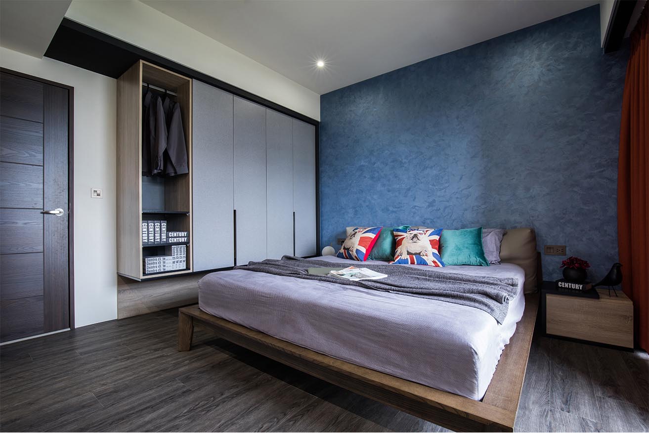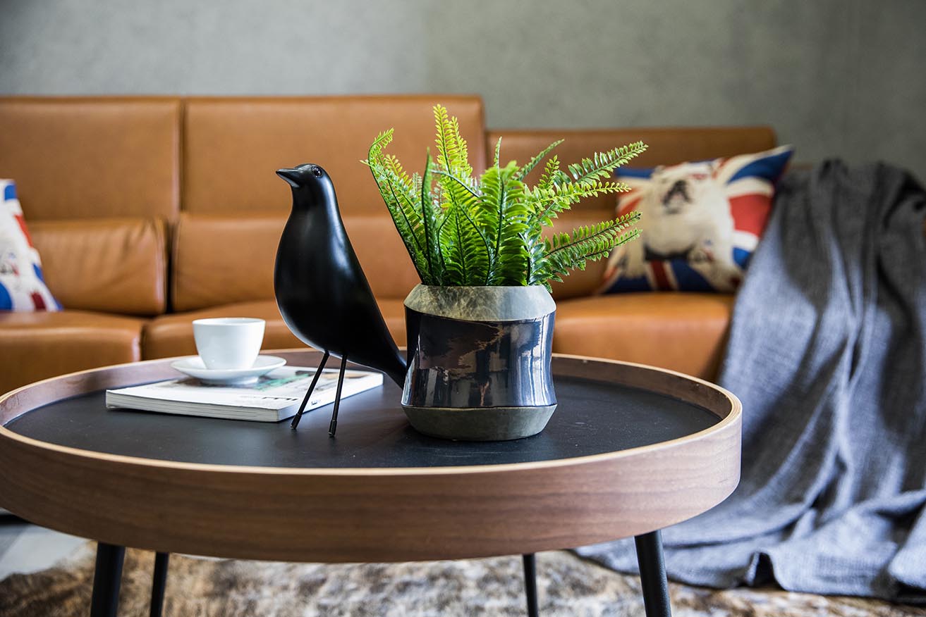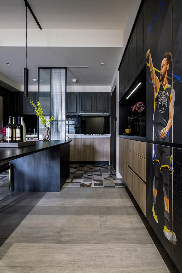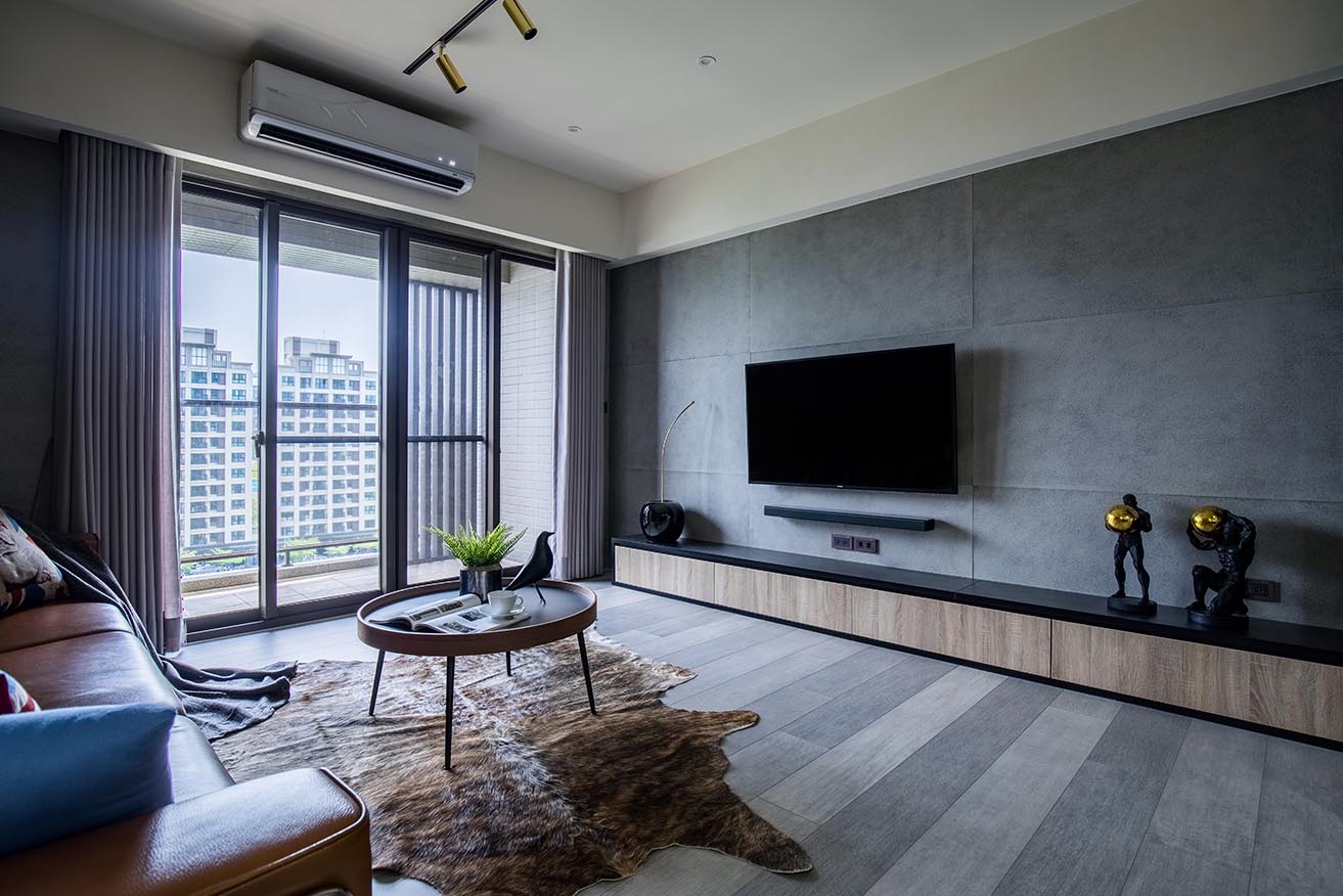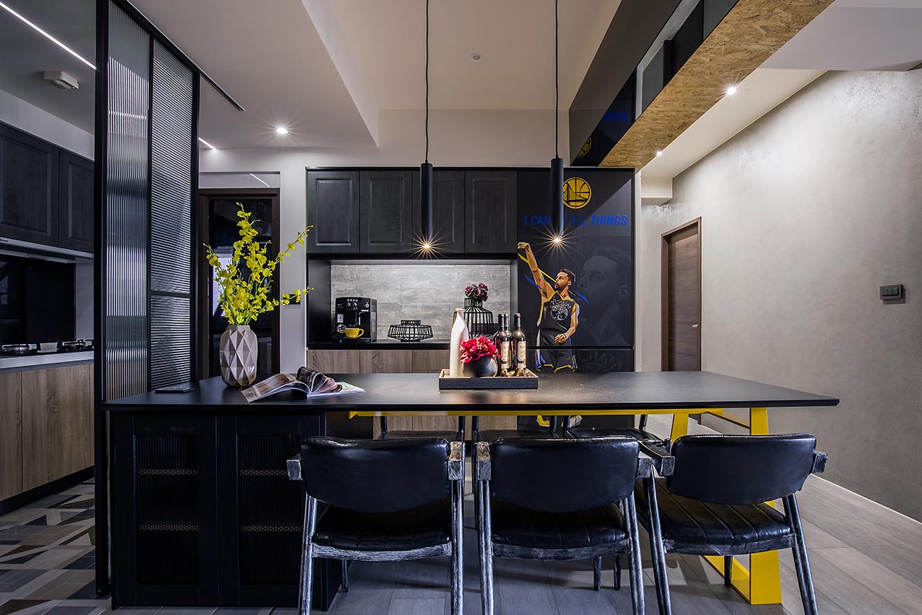 運用大量黑灰素材與系統板材構築全室色調,並以清水模、鐵件、仿紅磚文化石、OSB 板、復古牛皮沙發等元素賦予空間率性工業風基調,為避免風格過於原始粗獷,以點綴手法將鮮黃色、藍色等亮色系運用在局部空間,加上玄關和廚房地面的不規則花磚,讓原先沈穩的空間中跳脫出一絲活潑氣息。