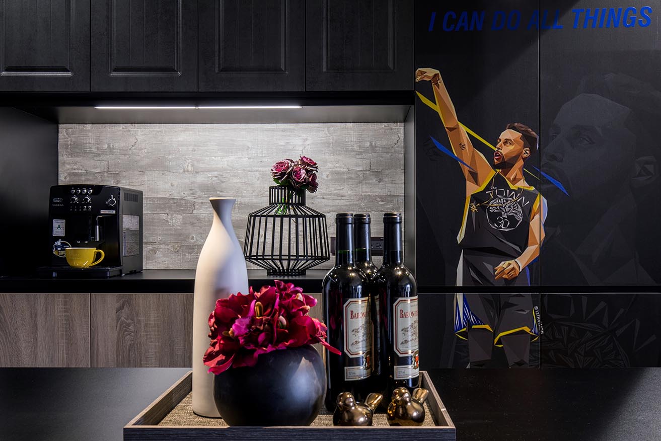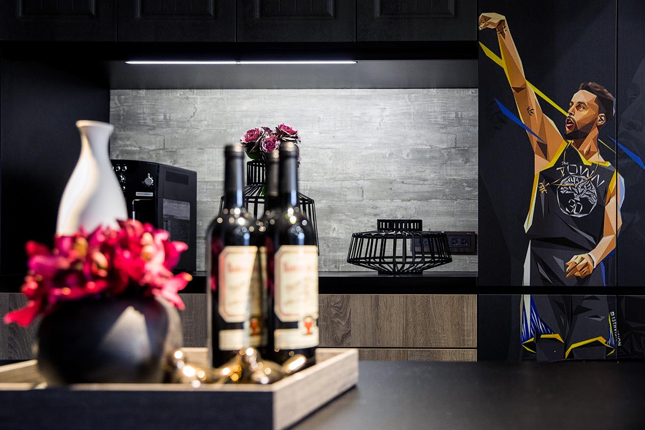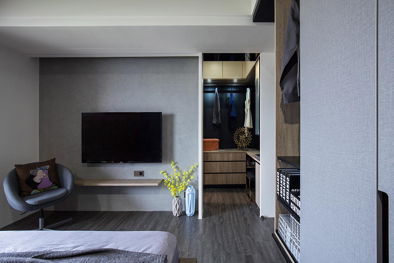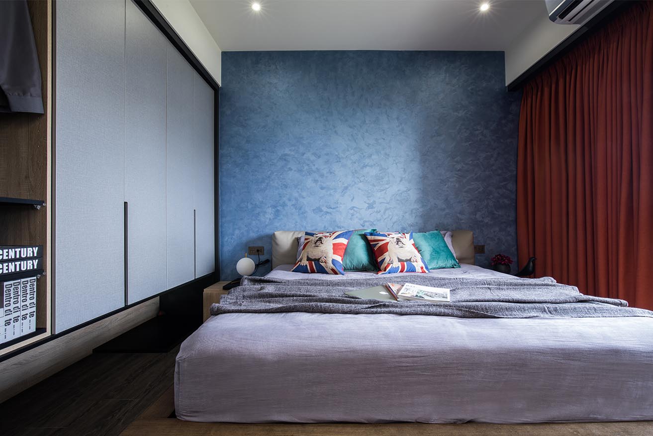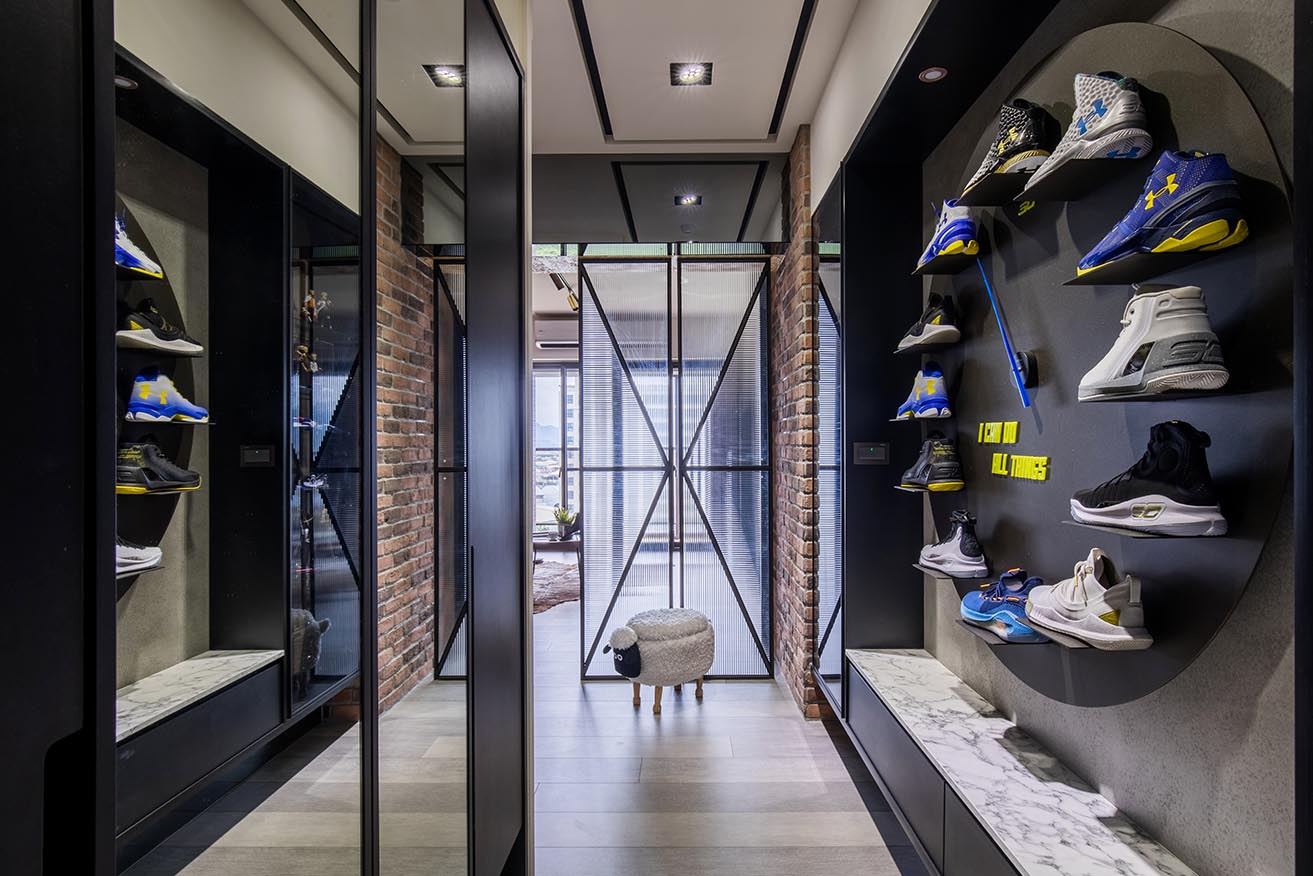 運用大量黑灰素材與系統板材構築全室色調,並以清水模、鐵件、仿紅磚文化石、OSB 板、復古牛皮沙發等元素賦予空間率性工業風基調,為避免風格過於原始粗獷,以點綴手法將鮮黃色、藍色等亮色系運用在局部空間,加上玄關和廚房地面的不規則花磚,讓原先沈穩的空間中跳脫出一絲活潑氣息。