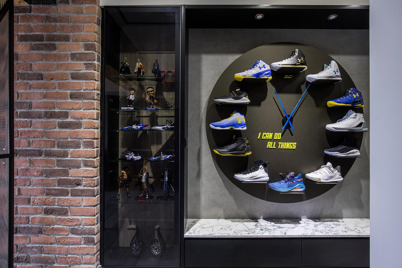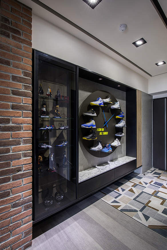 義大利進口花磚、牆面造型、壁面造型、天花板木作造型、木地板、展示櫃、系統收納櫃、玻璃屏風、鐵件、牛皮沙發、梁柱修飾、牆面跳色油漆、系統櫃更衣室。