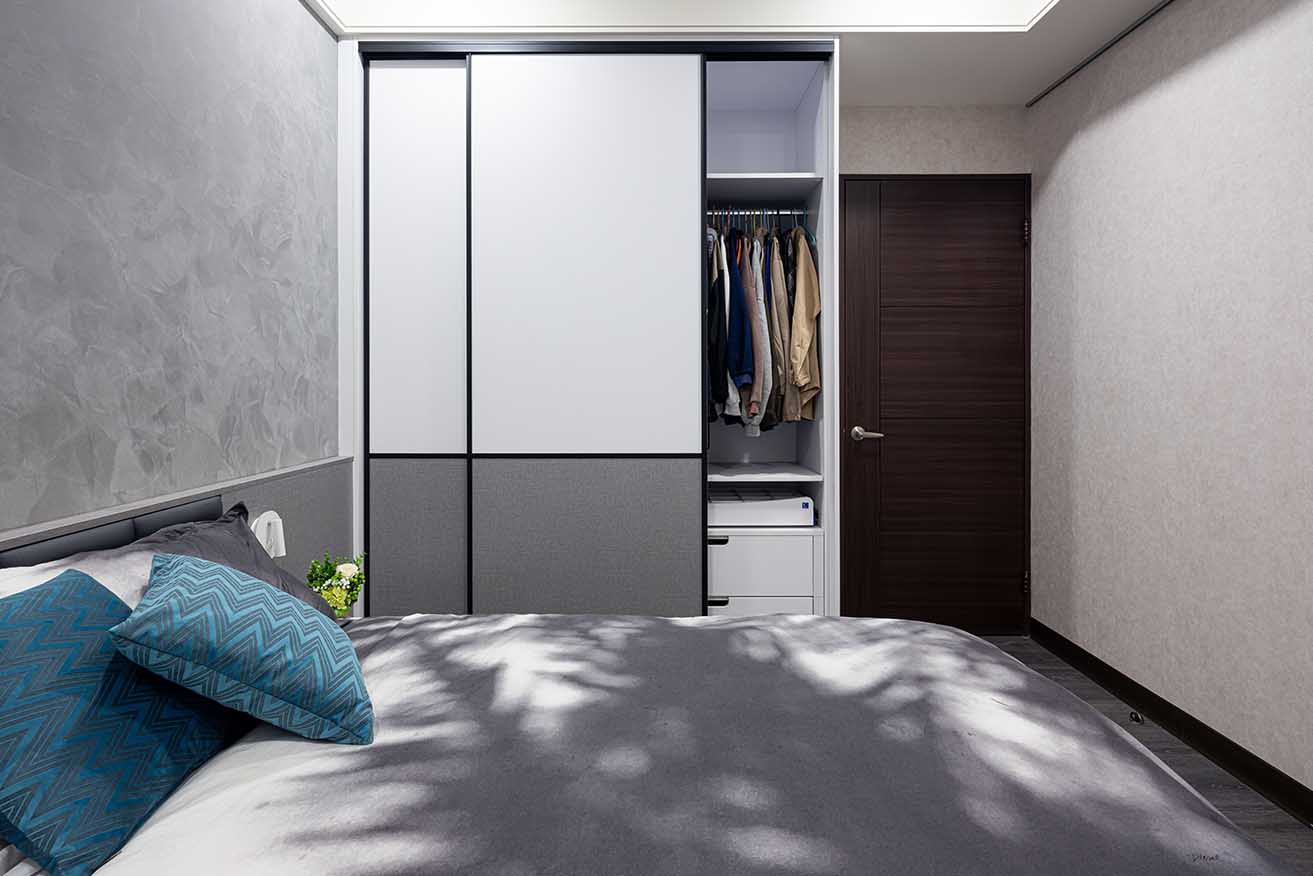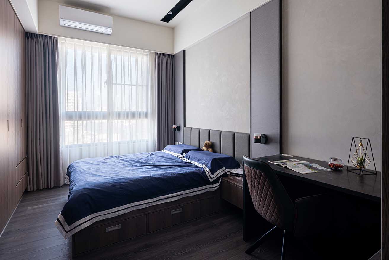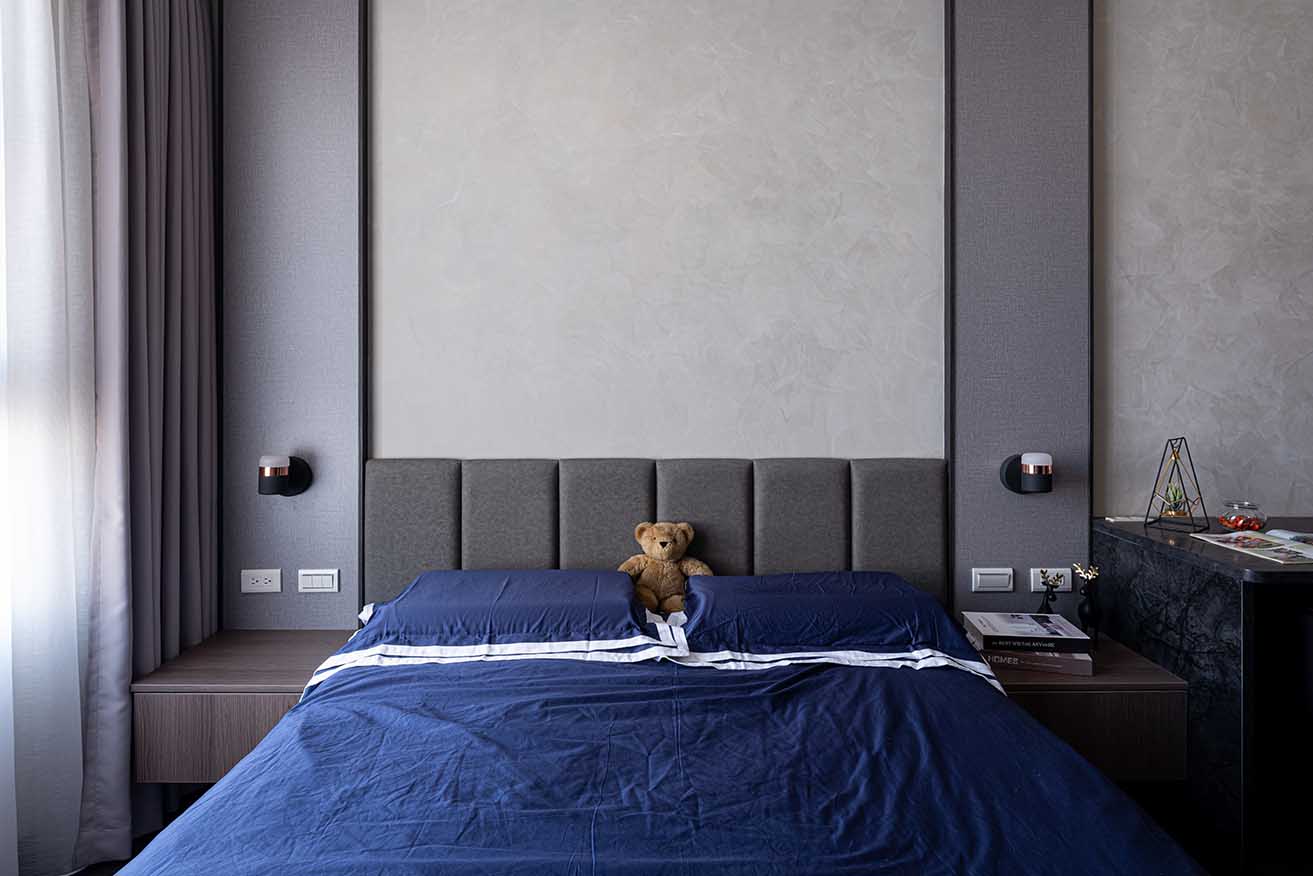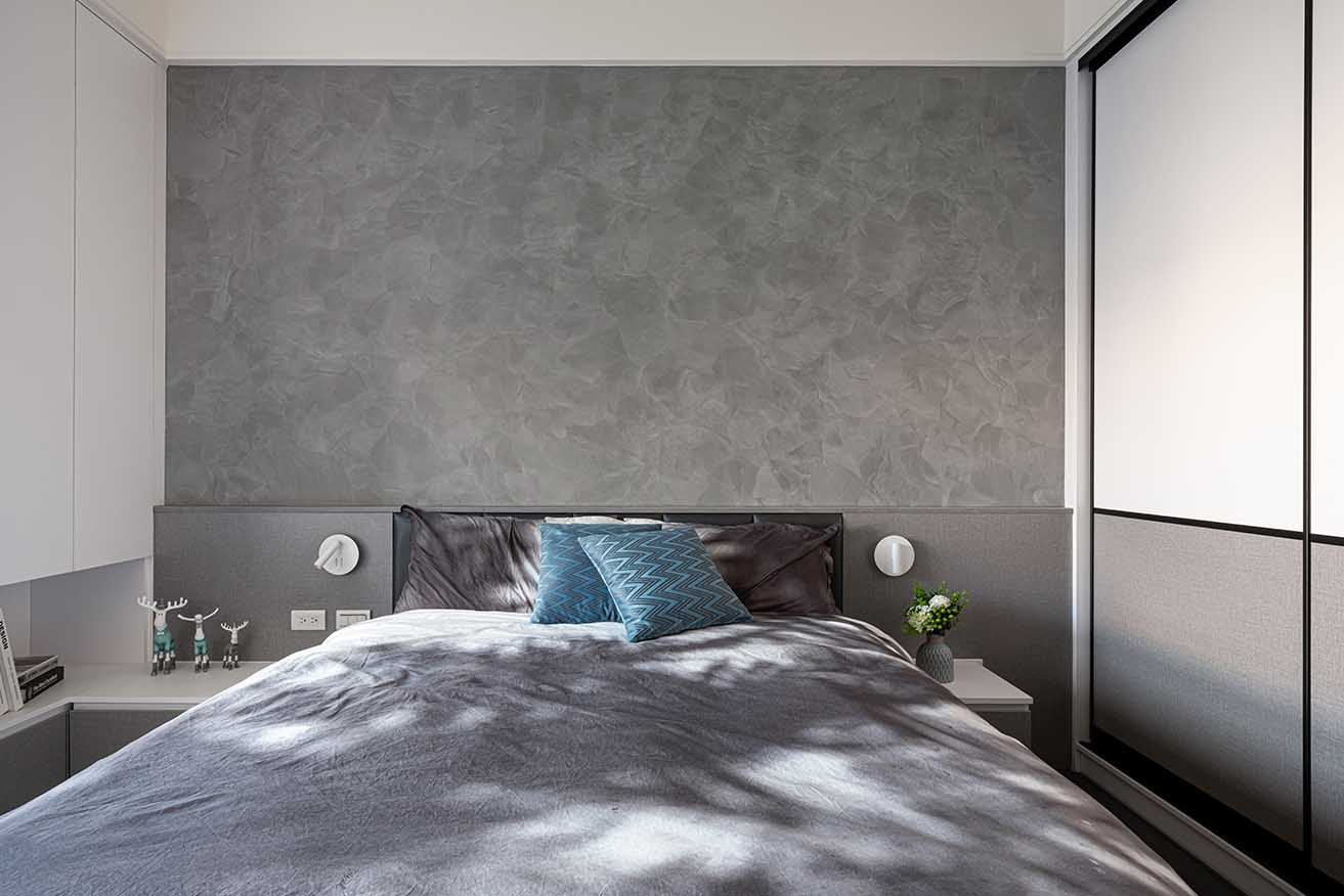 敞朗舒心的寢室氛圍,來自大兒子期望擁有以灰階為主的休眠場域。揮別傳統僅以背板勾勒床頭牆的作法,以藝術塗料鏝抹堆疊出細膩手感痕跡,並依循床架尺度豎立對稱布紋壁板,以簡練熟諳手法呈現洗鍊氛圍。