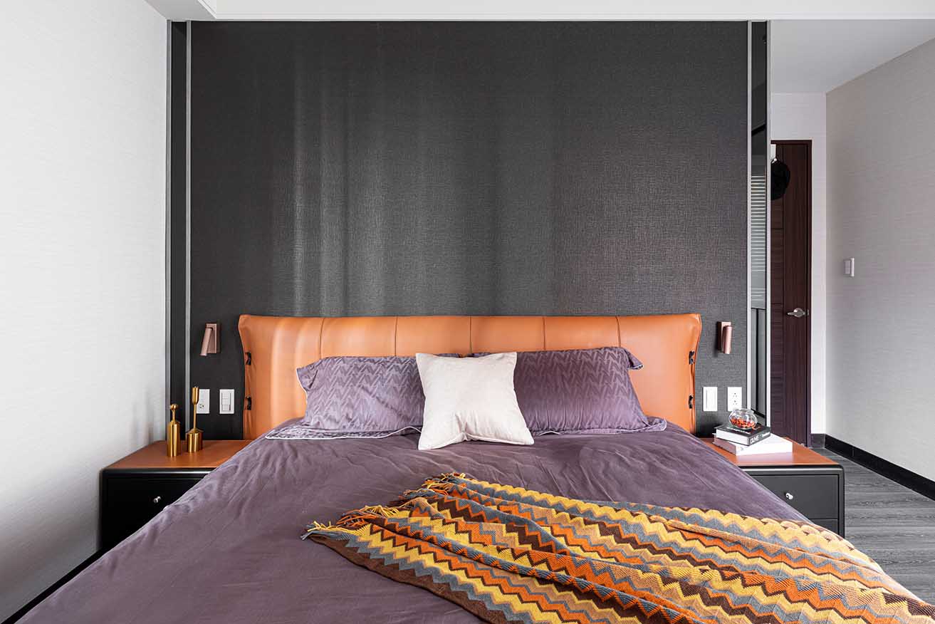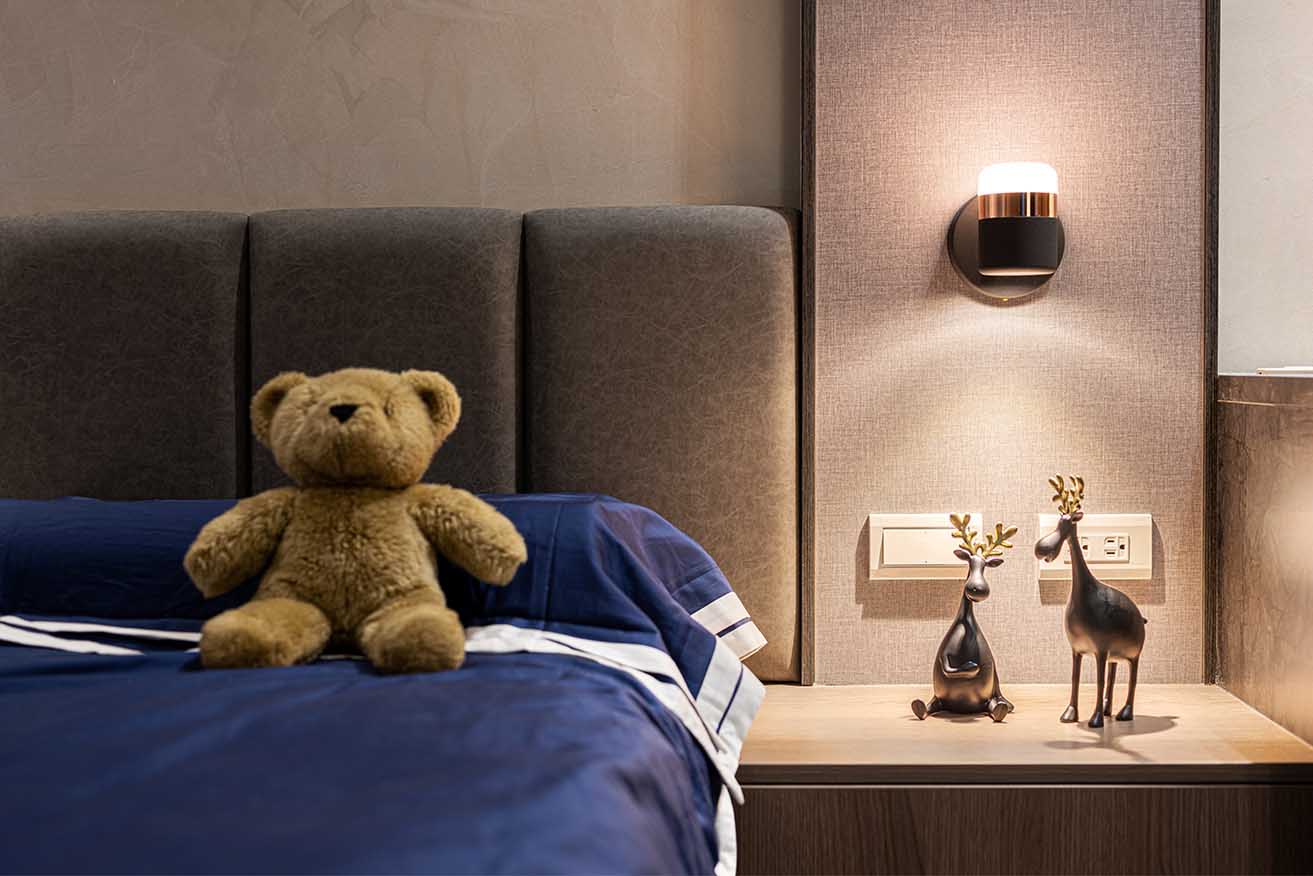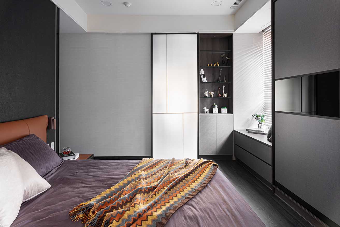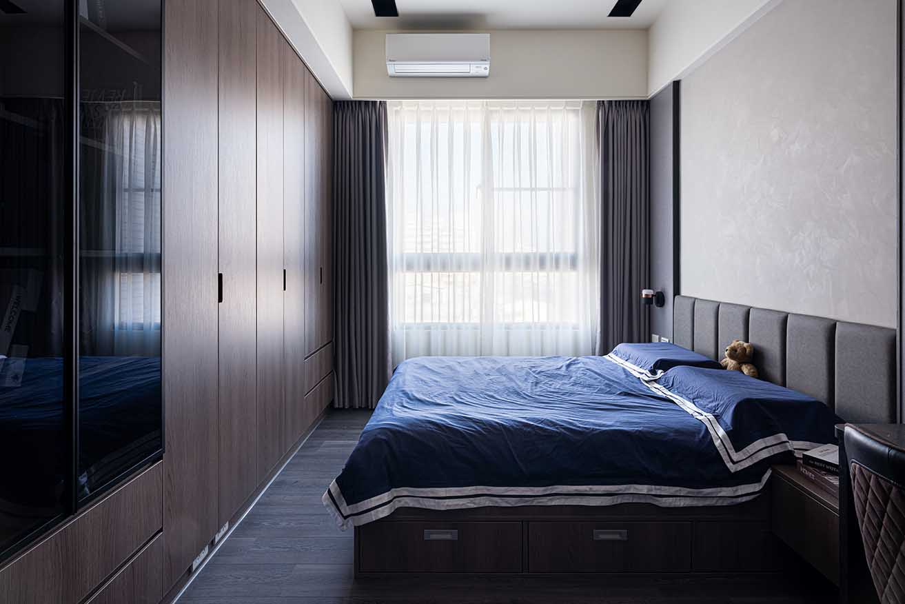 敞朗舒心的寢室氛圍,來自大兒子期望擁有以灰階為主的休眠場域。揮別傳統僅以背板勾勒床頭牆的作法,以藝術塗料鏝抹堆疊出細膩手感痕跡,並依循床架尺度豎立對稱布紋壁板,以簡練熟諳手法呈現洗鍊氛圍。
