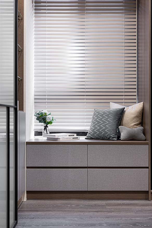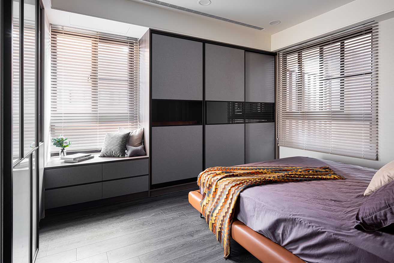 依循橫梁縱深採以布紋板材構築衣櫃,中段則揉入烤漆黑玻形塑視野穿透度,同時達到遮掩衣物效果,接著將高度降緩形成兼具收納機能的窗邊臥榻,既能維持雙向採光優勢、成為夫妻倆閒逸天地外,亦是串接走廊的一抹寫意端景。