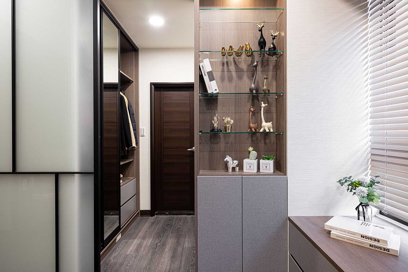鑑於屋主習慣封閉式收納規劃,於是以一道隔牆劃分出獨立更衣室。將分野壁面透過鐵件+噴砂玻璃築起一扇半通透滑門,在若隱若現間穿引光源敞亮內部環境,一旁則嵌入開放層架使珍藏飾品得以妥善陳列。