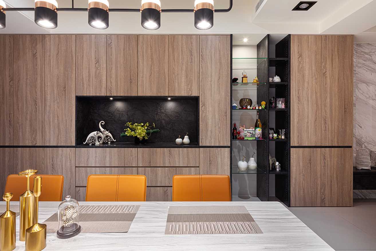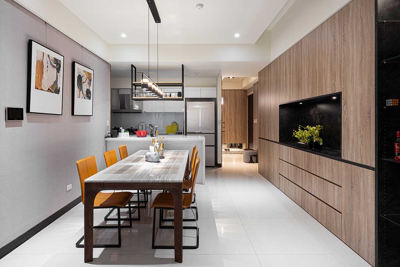 一道典雅櫃體依序串起玄關、餐廚與客廳,將系統櫃挹注木工手法,藉以消弭踢腳板線條,還原簡潔純淨立面,並依據餐廳及走廊位置刻畫展示檯面與層架,錯落有序的壁櫃以溫潤木肌理奠定清雅形象,輔以墨黑大理石板材透散低調奢華風采,框起一幅韻致別具的畫面。