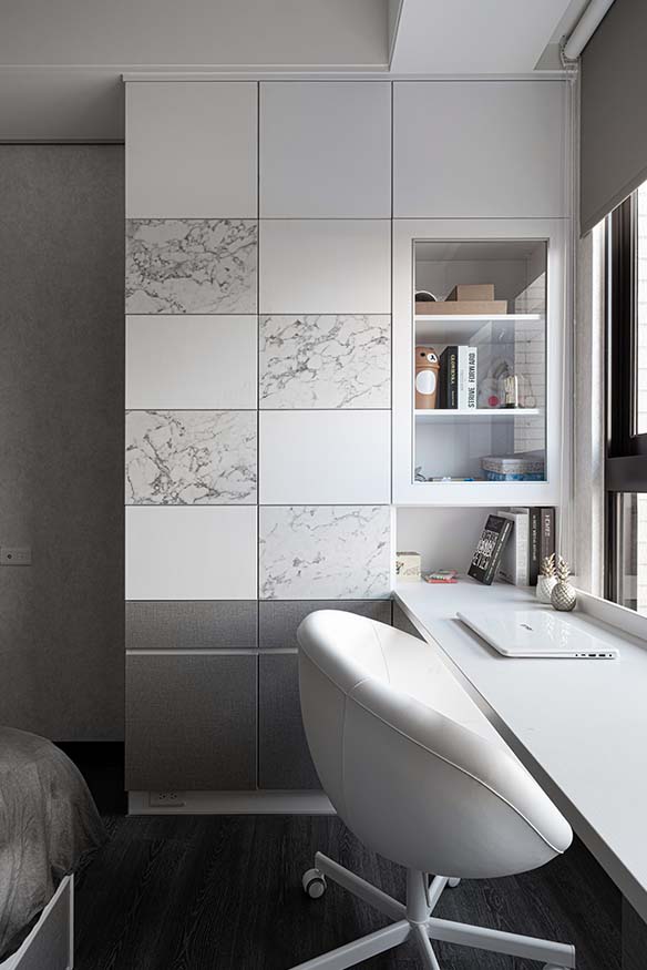 別於哥哥房的沈穩內斂氛圍,目前就讀大學的小女兒,希望將灰階摻揉些許純白色調,呈現溫和澄淨氣息。設計師於床頭牆揮灑大面積藝術漆,經由日光映照,使鏝抹痕跡具備深淺濃淡的紋理變化,為簡淨氛圍注入一絲活潑調性。