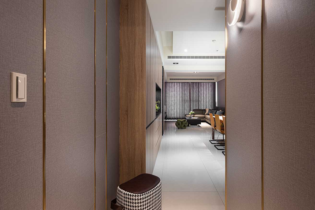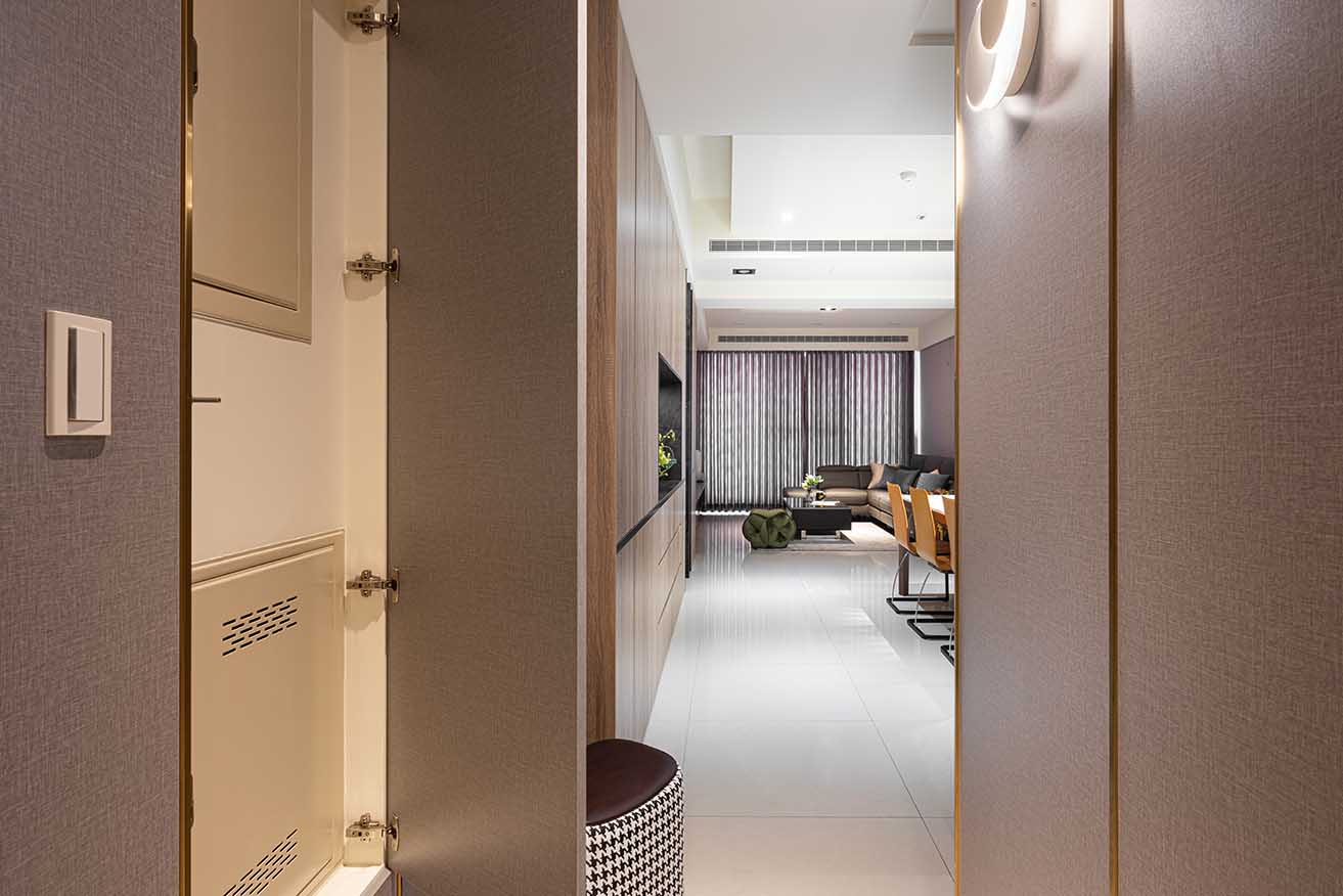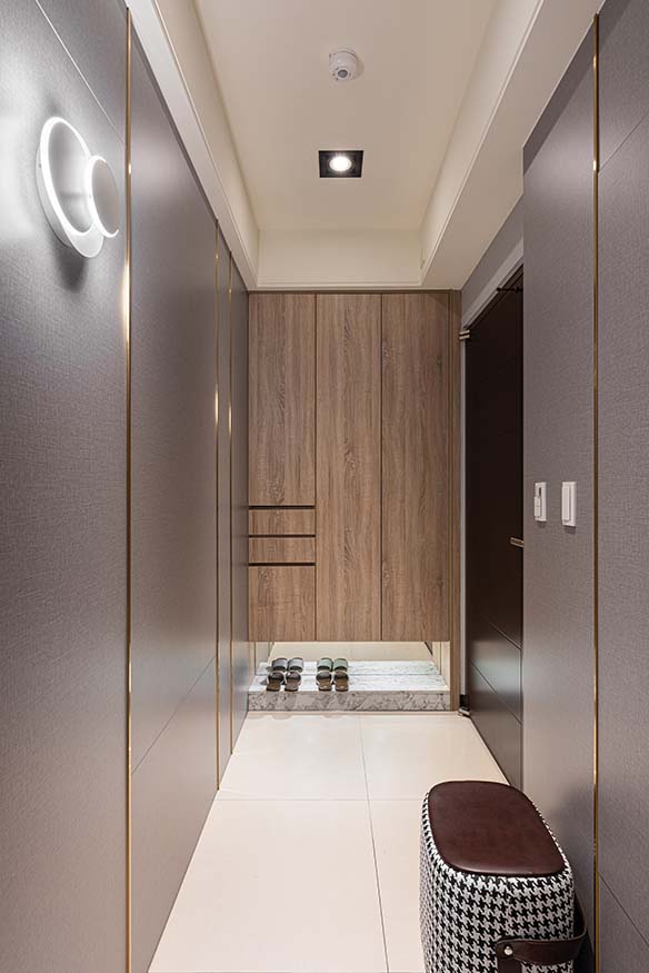 優雅內斂的布紋板材依附壁面水平蔓延,經由細緻橫縱紋理揭開返家序幕,也巧妙遮掩配電箱存在,同時於邊框揉入鍍鈦金屬,透過微潤光澤增添奢雅韻味,並藉由沈穩木紋板材砌築置頂鞋櫃收齊門後空間,發揮坪效最大值。