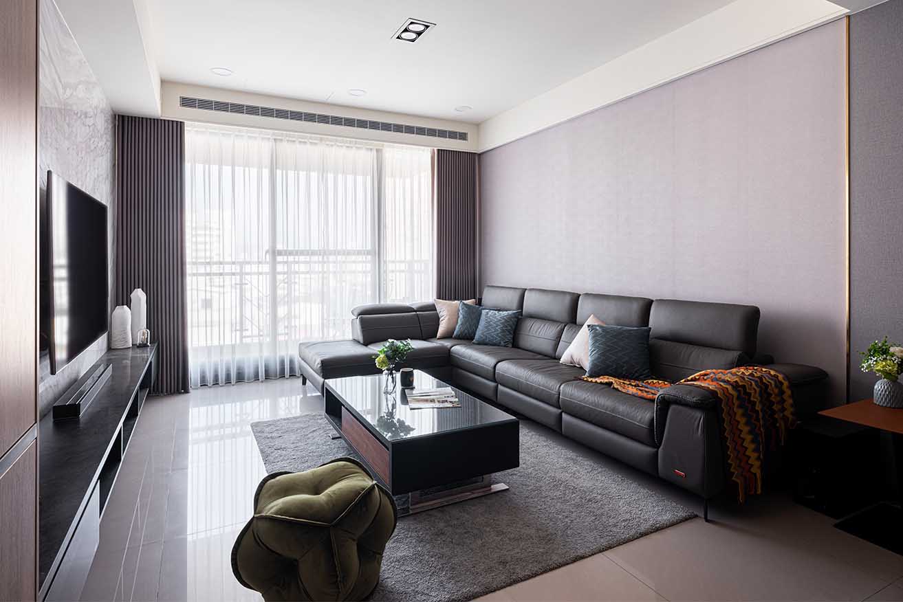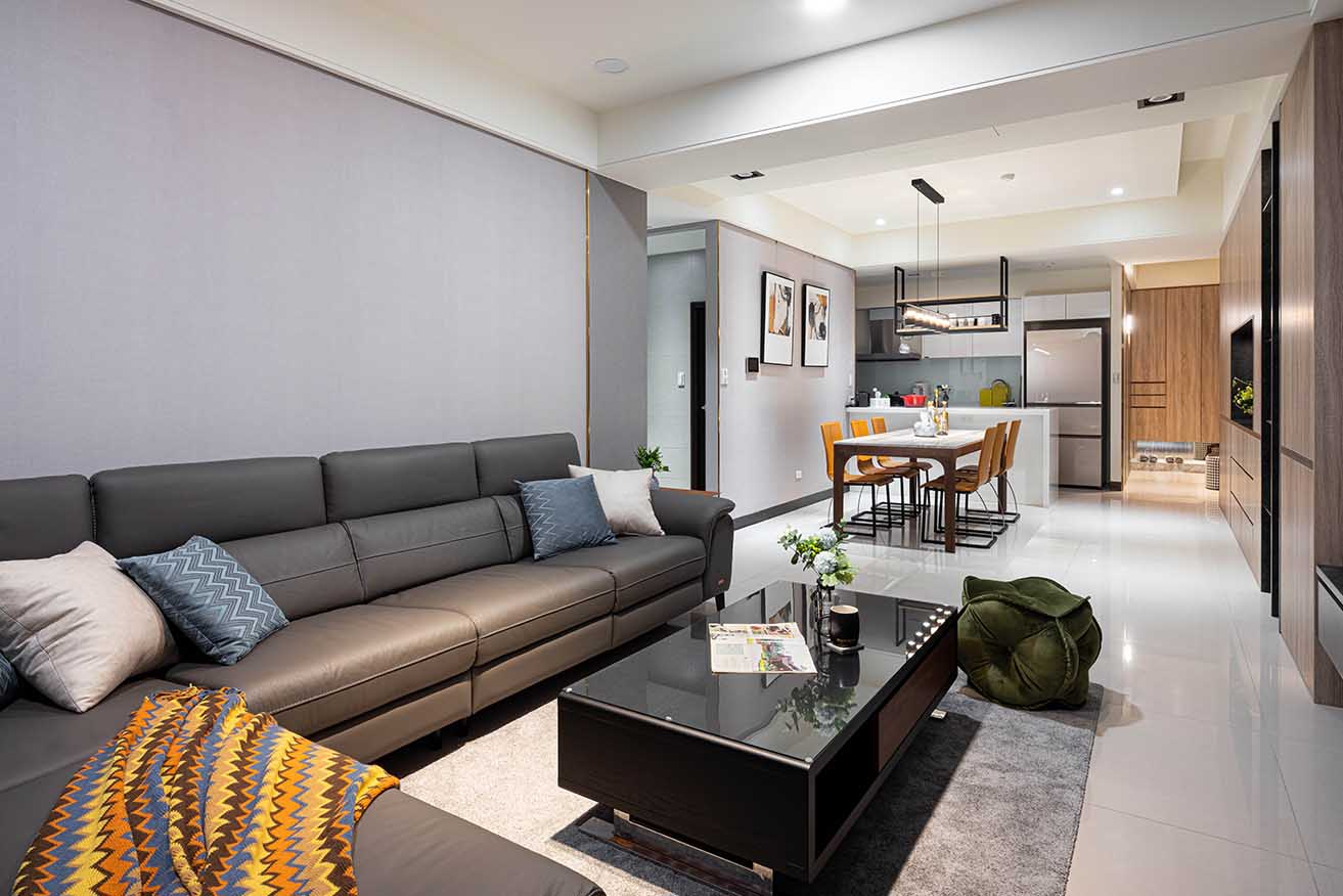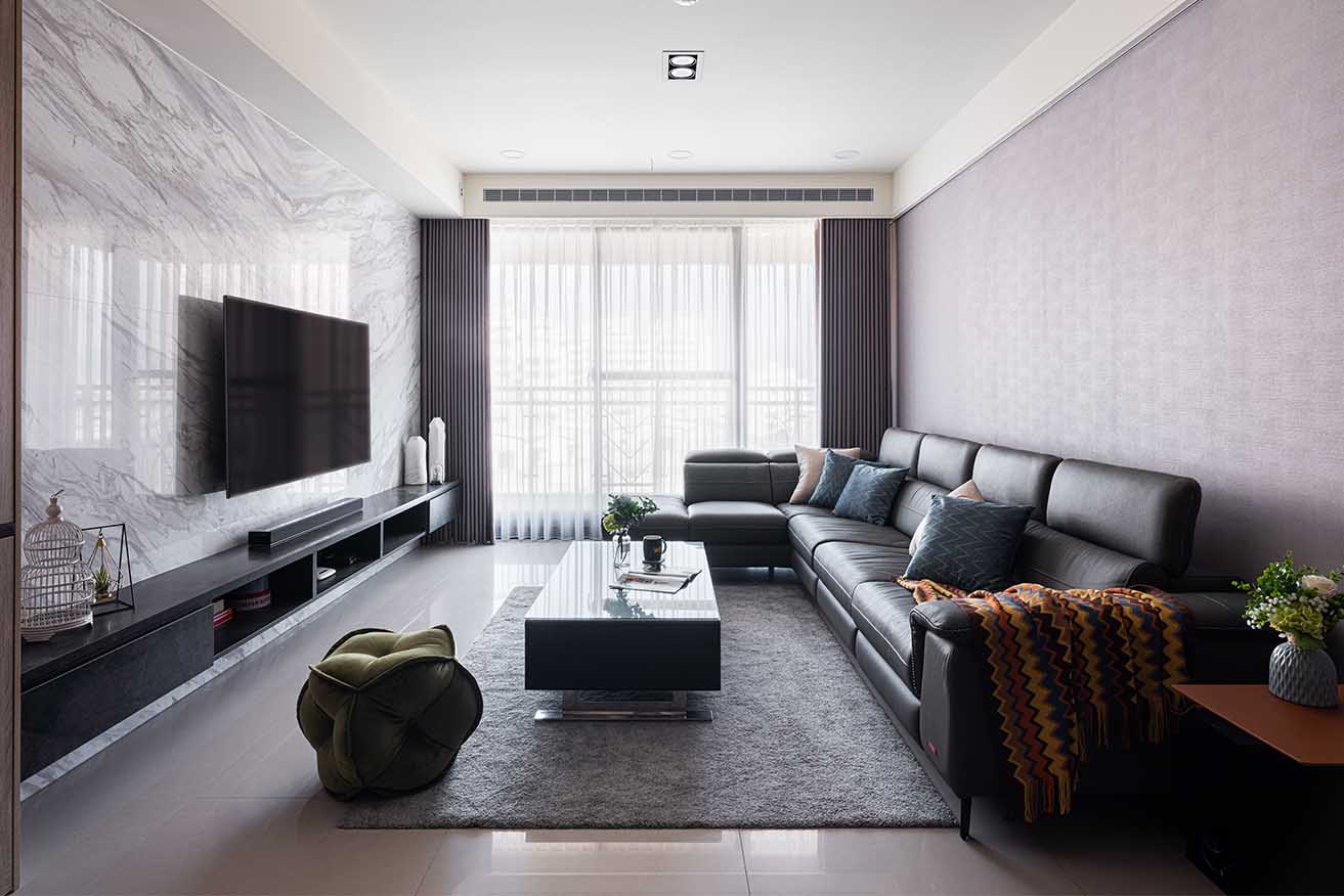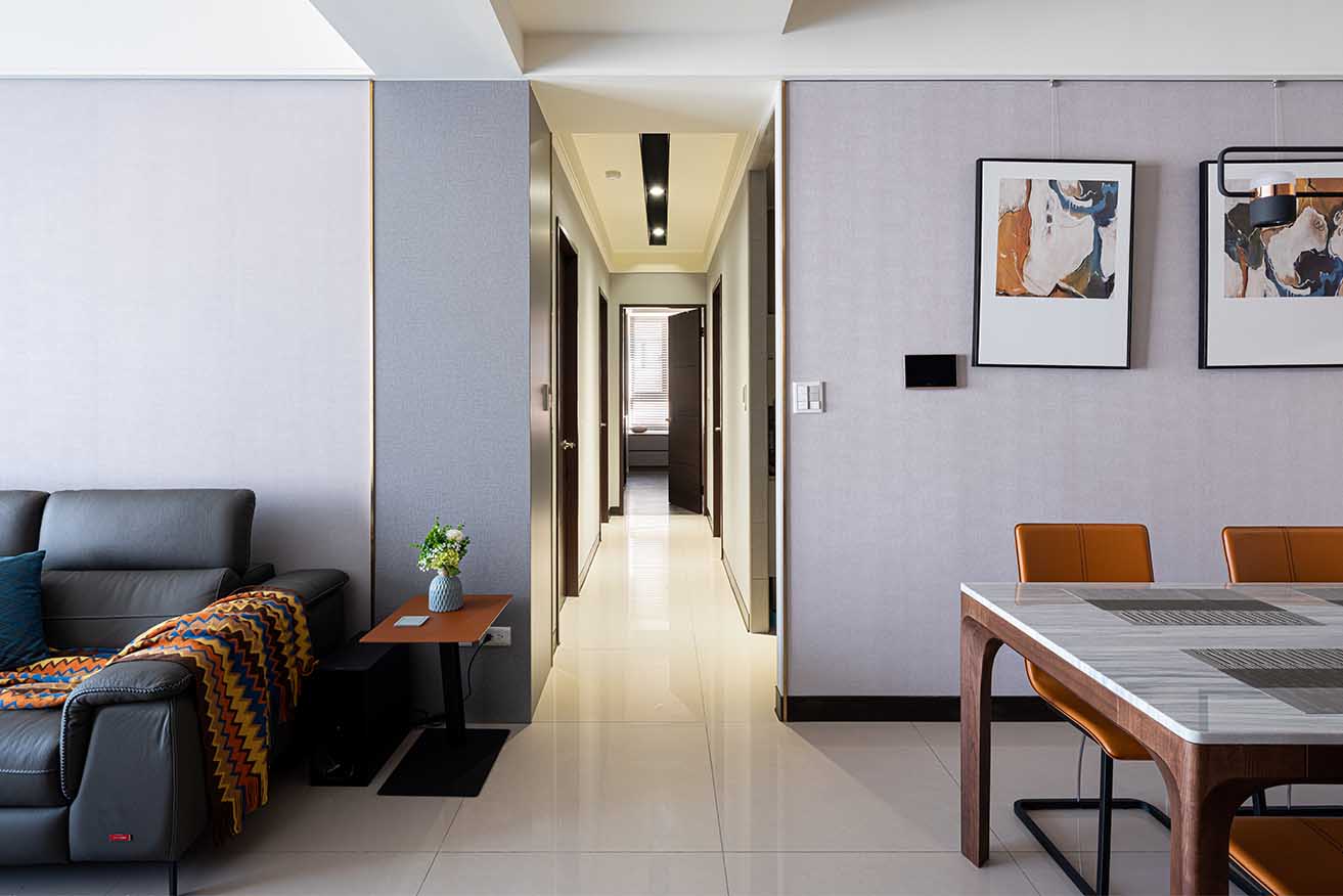簡約大氣,是男主人盼望的住家氛圍,因此全室以純粹黑白灰做為主色調,透過淺灰調進口壁紙與布紋板材,使沈穩原木肌理與天然大理石紋路脫穎而出,流露洗鍊奢雅韻味,並適時穿插點綴鍍鈦金屬、玻璃與鐵件,從細節彰顯雍雅品味。