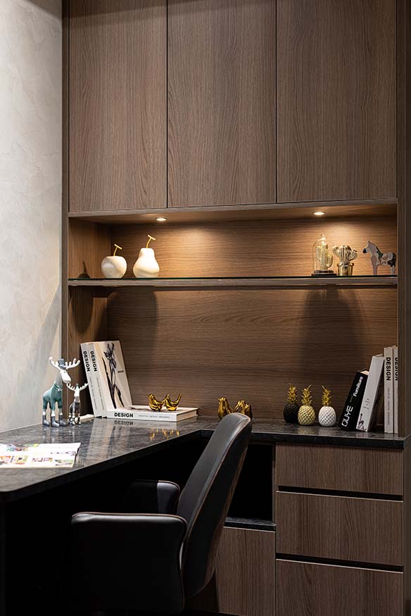 同步連結至左側平直書櫃,將玻璃與大理石紋板材揉合其中,勾繪出純淨且靈動的立面設計,一筆流暢的收納規劃,符合實際使用習慣外,使每寸空間絲毫不浪費,展現高度機能性。