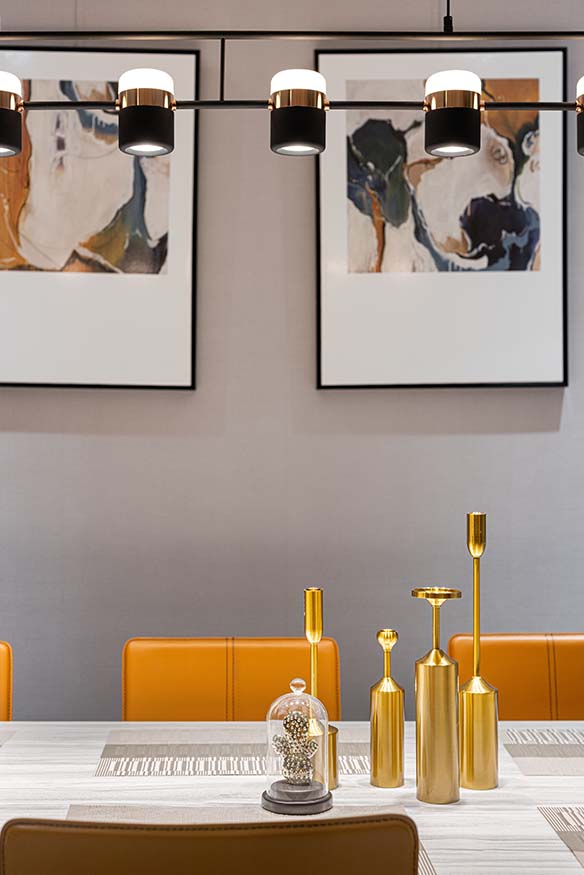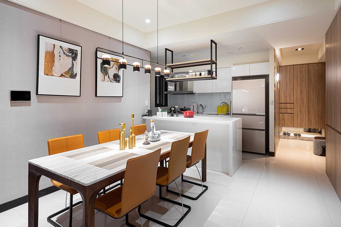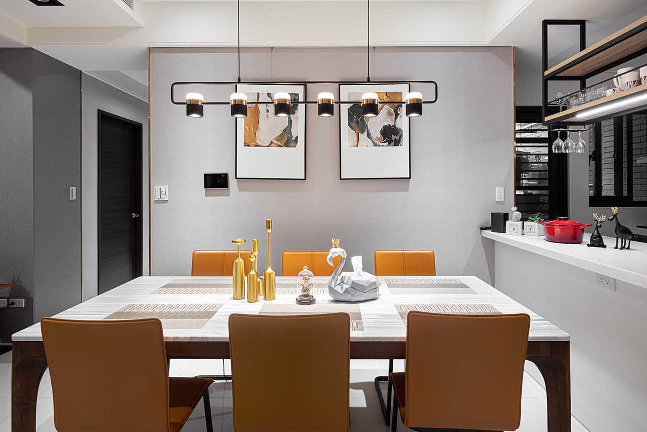 經過縝密調整後,讓渡出放置一桌六椅的敞朗環境,同時顧及屋主不願有白牆的心思,將壁面貼覆溫和沈靜的淺灰調壁紙渲染舒心用餐氛圍,同步綴以鍍鈦金屬收邊,從細節增添高雅精品格調。