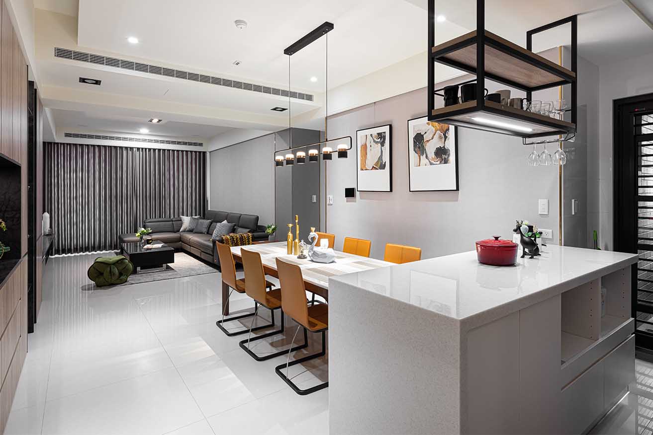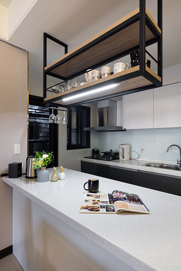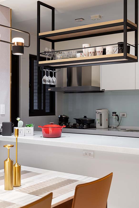 基於男主人希望擺放一張長達 220 公分的餐桌,幾經思量後,以一座中島劃分餐廚領域,並將廚具延展尺度,擴增出寬敞且順手的料理動線,亦規劃鐵件吊櫃增添視感層次,補足廚房收納機能,也使常用食器成為美好餐敘風景。