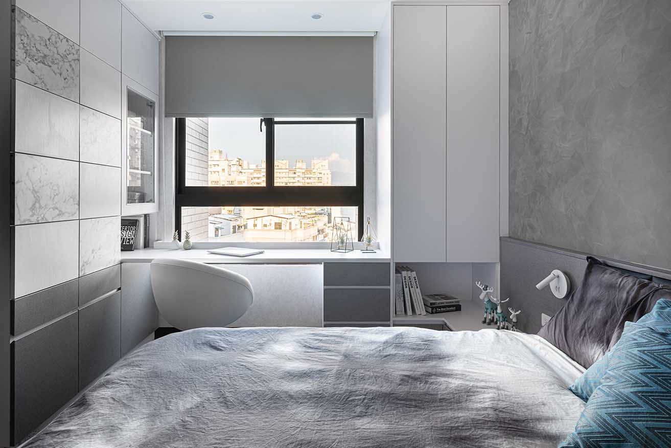 運用量身訂製方式,砌築簡約淨白的抽屜式床箱,並於抽屜門板輔以淺灰布紋增添溫潤視感,對稱的床頭櫃於左側銜接掛放衣物與擺放書籍的高櫃,接續至窗前化成一道書桌串接,細節上將檯面採以內縮設計,使窗簾也能無礙垂放。