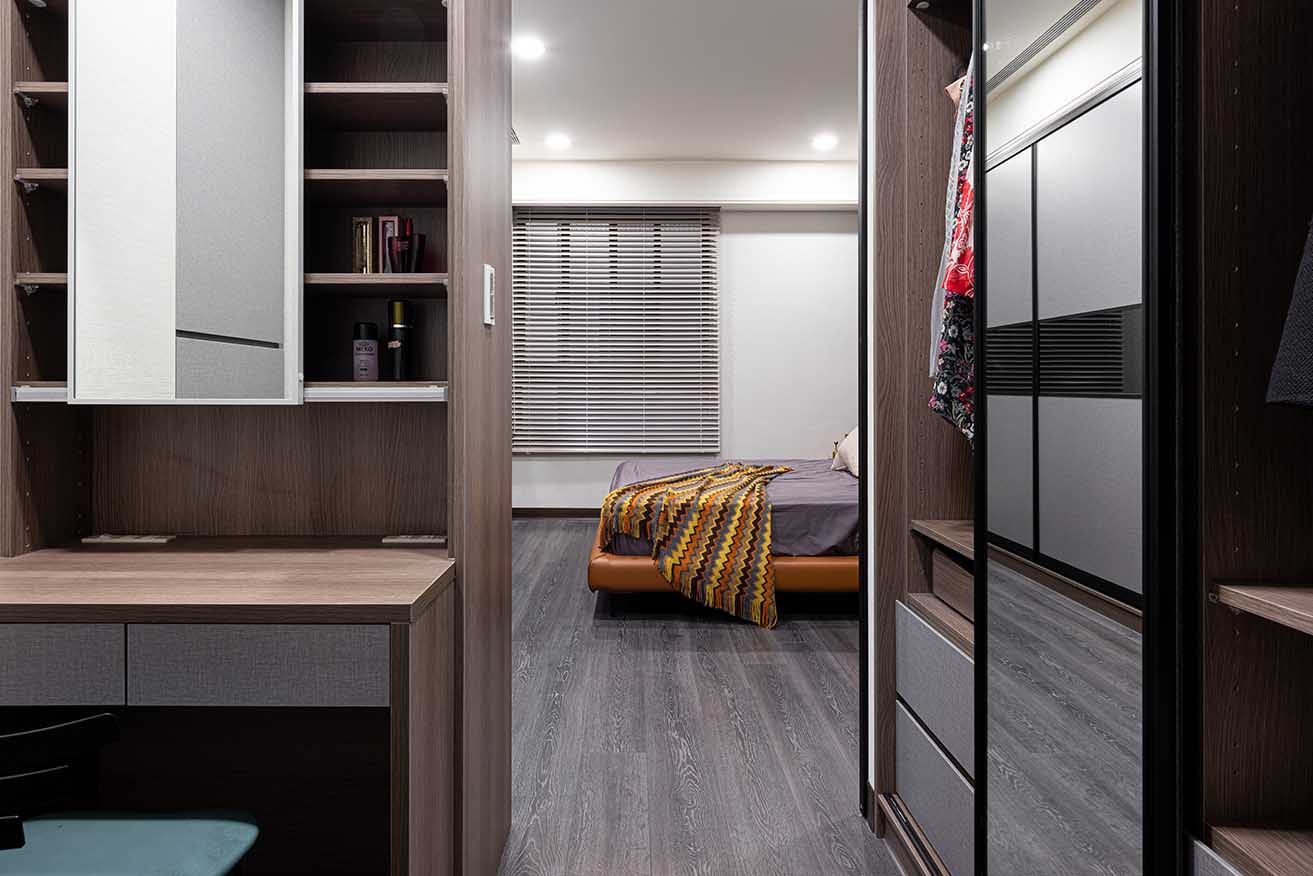 沿用布紋+溫潤木質板材構成敞闊衣物櫃,使精巧空間具備充裕收納機能,並活用零碎角落構起梳妝台,善用系統傢俱的高度彈性,以滑鏡櫃方式使女主人的化妝瓶罐皆能井然有序放置,提升梳化時的愉悅心情。