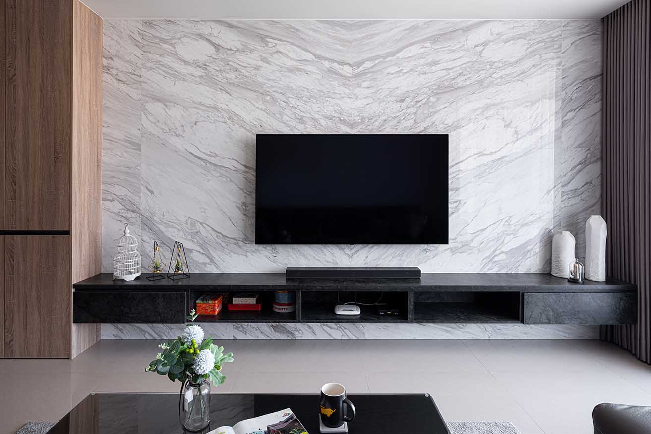 天然大理石紋絡猶如雲霧般綻放,經由日光映照呈現富有視覺張力的簡練電視牆,佐上一道由墨黑大理石板材砌成的電視矮櫃,於此呼應奔放的石材紋理,實現男主人嚮往的內斂大氣底蘊。