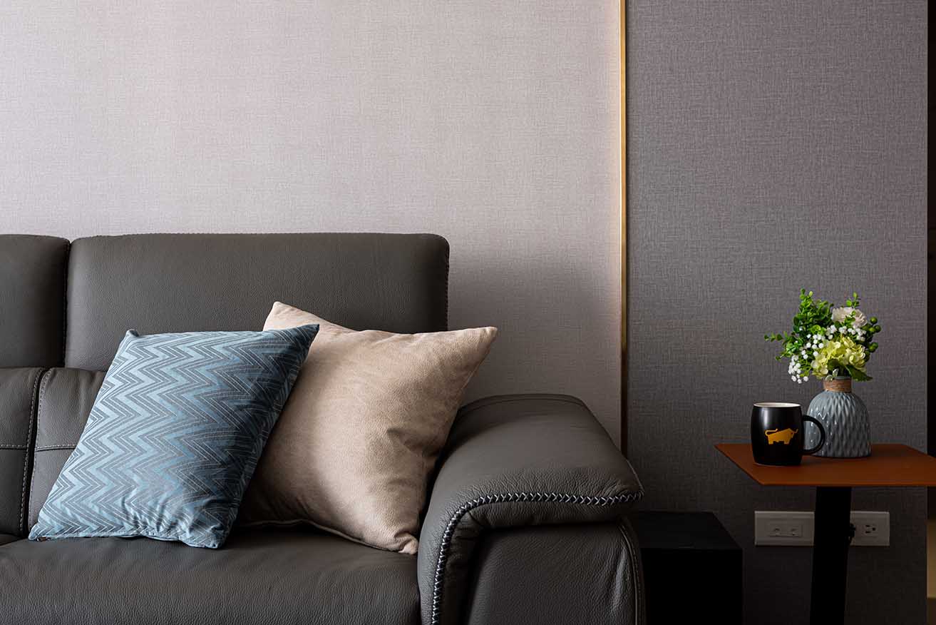 看似簡淨素雅的客廳蘊藏細膩設計手法,運用一道布紋板材承接柔和淺灰壁紙,透過深一階的色調,使開放空間劃分於無形,對向以壁櫃形成流暢銜接,使公領域不著痕跡地相互牽引,勾勒出相依有序的寧靜畫面。