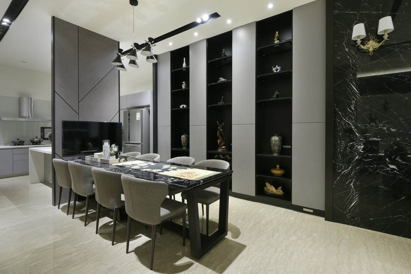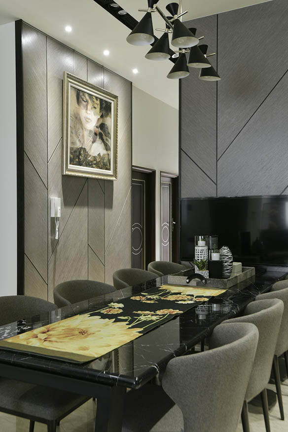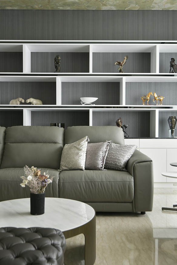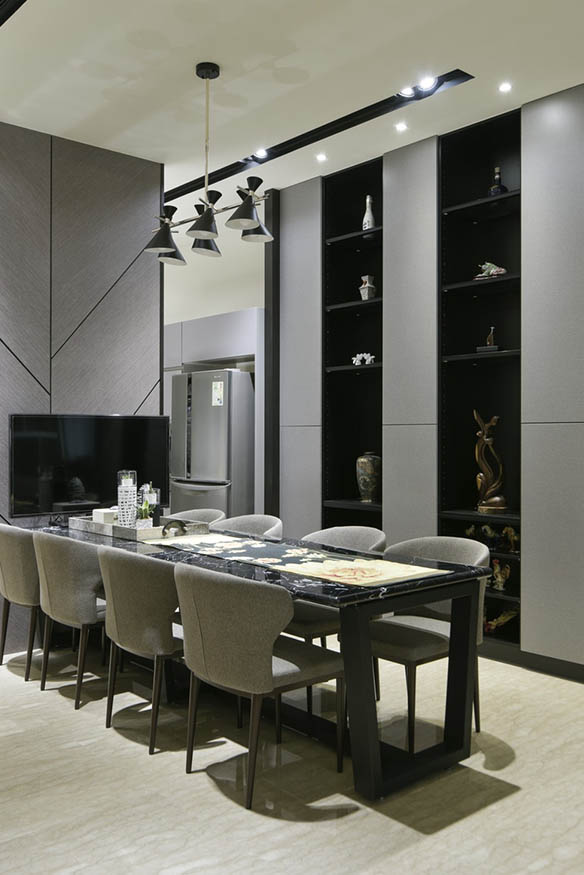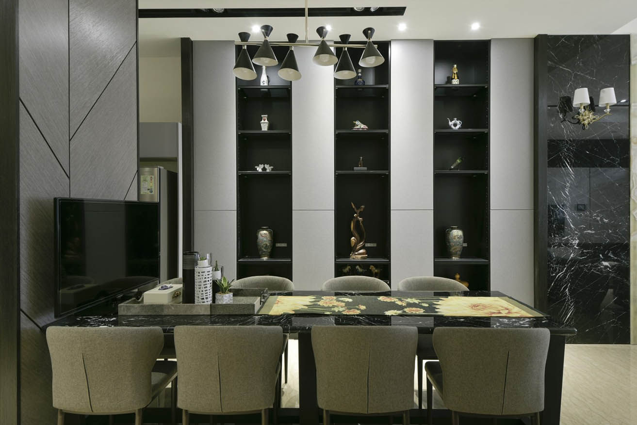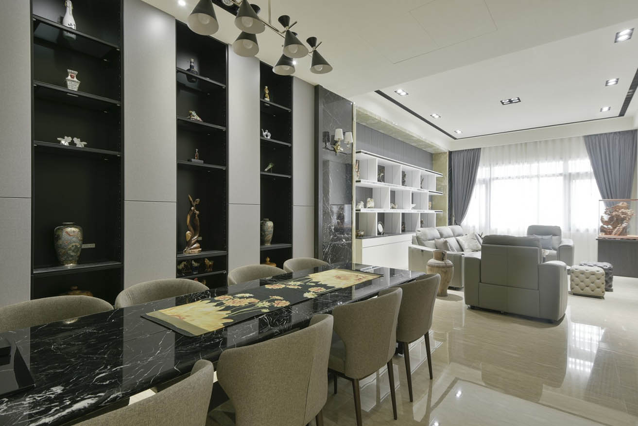 屋主擁有非凡的藝術品味,沙發背牆利用開放層板打造展示機能,讓雕塑品、風格器皿展示其中,增添人文氣息;餐廳的主視覺牆上,同樣嵌入黑色層板,擺設金屬光澤的藝術品,創造出優雅的背景牆;除了展示機能的活用,讓公領域增添藝術氣息,靠近電視牆的牆面,更利用特殊玻璃創作出一面中式圖騰,形塑端景造型,相互呼應。