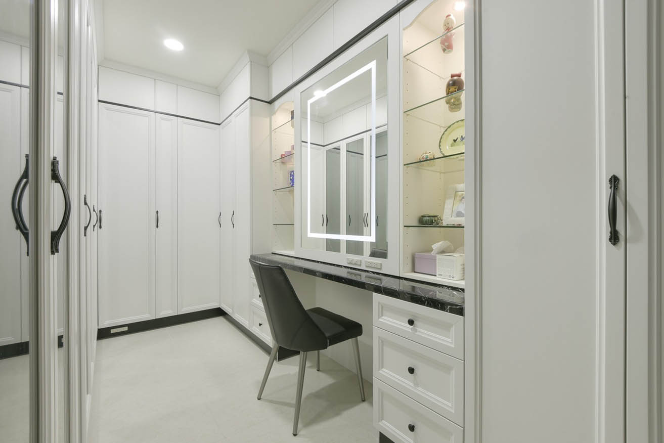 主臥床頭以紫色繃布結合線條分割,床尾以白色線板勾勒出收納櫃造型,展現簡約、明亮的味道,展示兼收納的安排,強化實用機能;更衣室裡,鏡子以噴砂手法並結合燈條設計,光映照在臉上,臉部線條更顯柔和美麗。女兒房裡則考量女兒學設計的特質,使用大膽的藍灰色調,書桌與臥榻機能以系統板材串連,讓空間坪效發揮到最大。