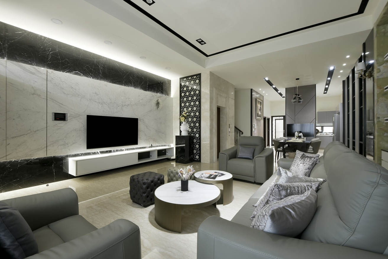 公領域的地坪與部分壁面以大理石鋪陳,加上客廳的天花板挑高3米6,更加彰顯簡約大器之感。空間遇大樑問題,透過漸層的手法將冷氣出風口隱藏其中,並以深色溝槽描繪出層次視感;電視牆以兩層深淺色調的石材安排,側邊設計一道隱藏門,成為懸掛外出衣物的收納空間,兼具美型設計與強化實用功能。