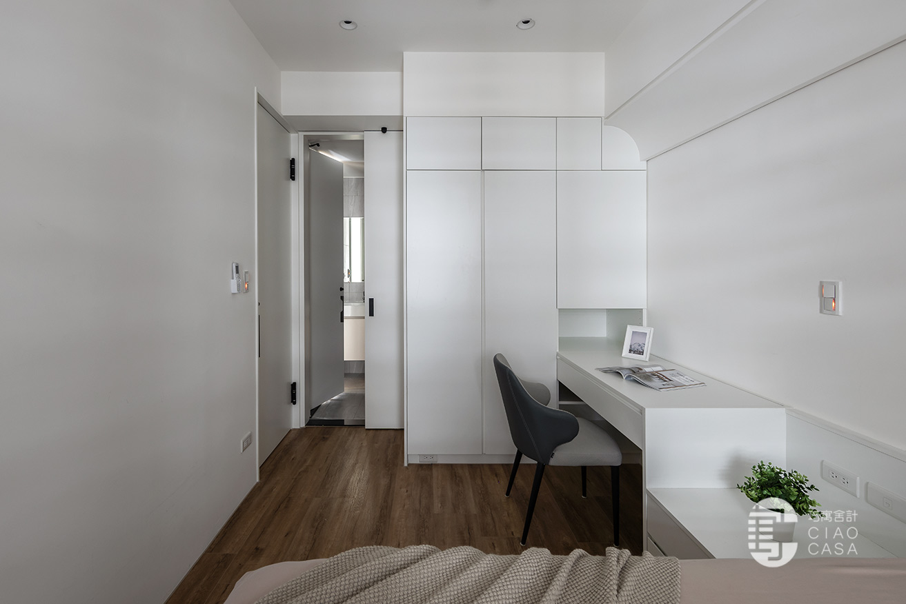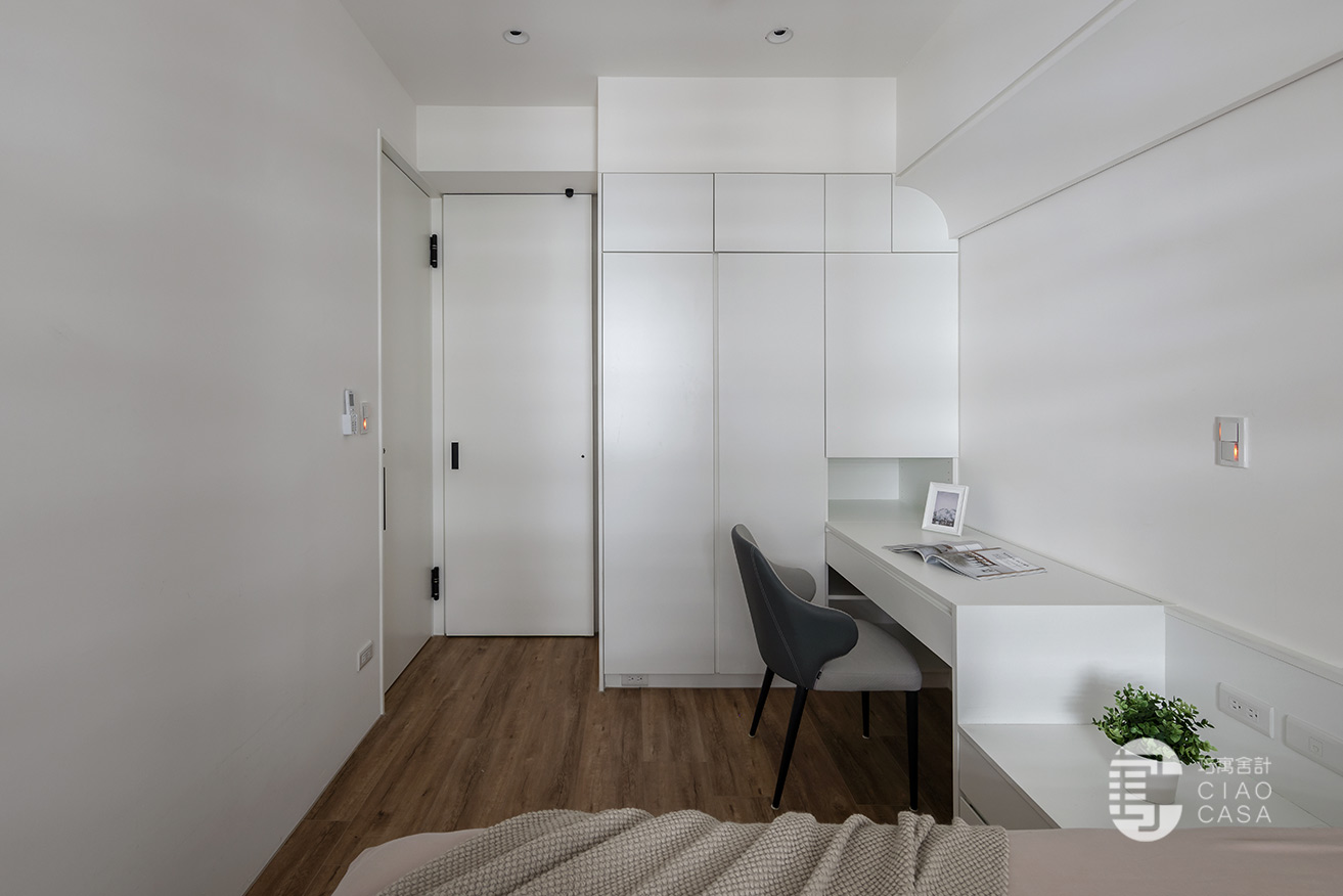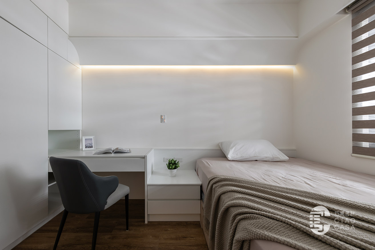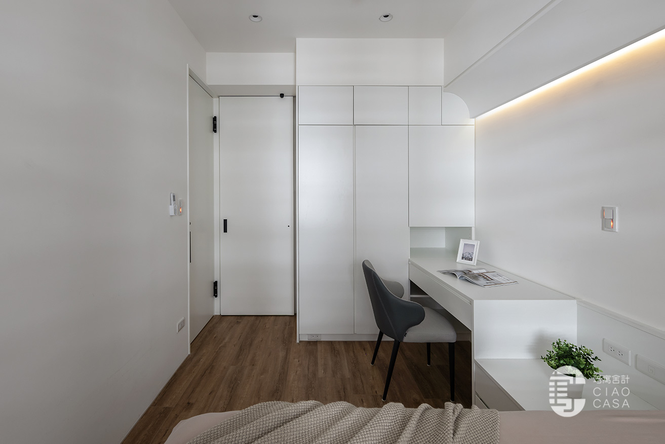 白潤的光底,是過濾熱鬧社交後,一塊忠於自我的靜謐角落,天花橫梁在輕薄微彎的邊緣勾勒下,與光帶發散的和緩詩意,共譜優美曲線。順著圓角而成的置頂衣櫃,循著低緩的音階律動,構織起上掀式梳妝台和床邊櫃。