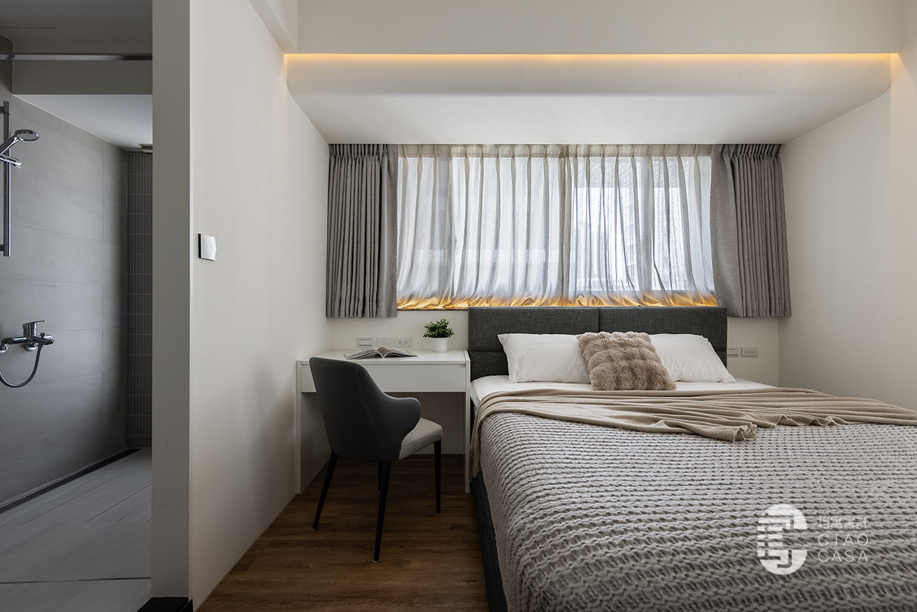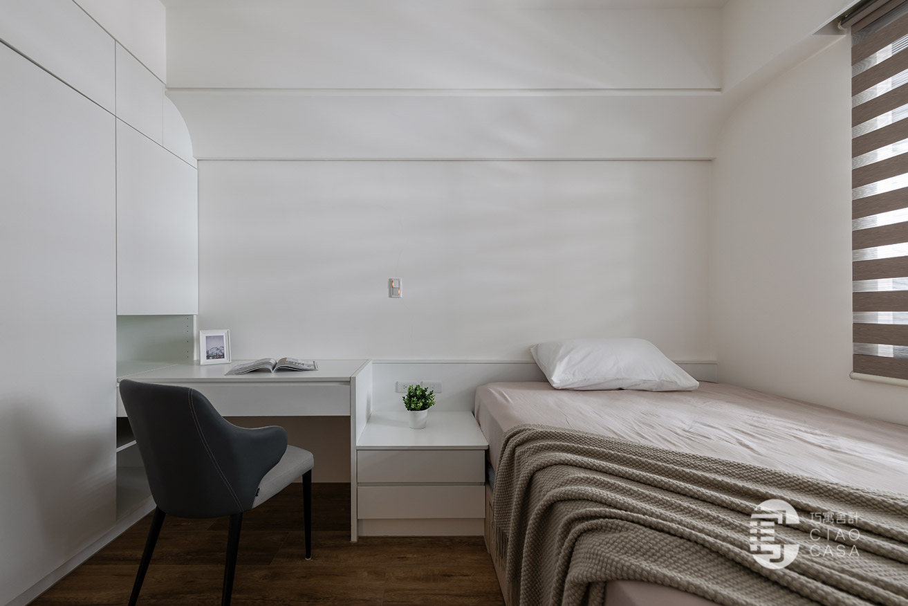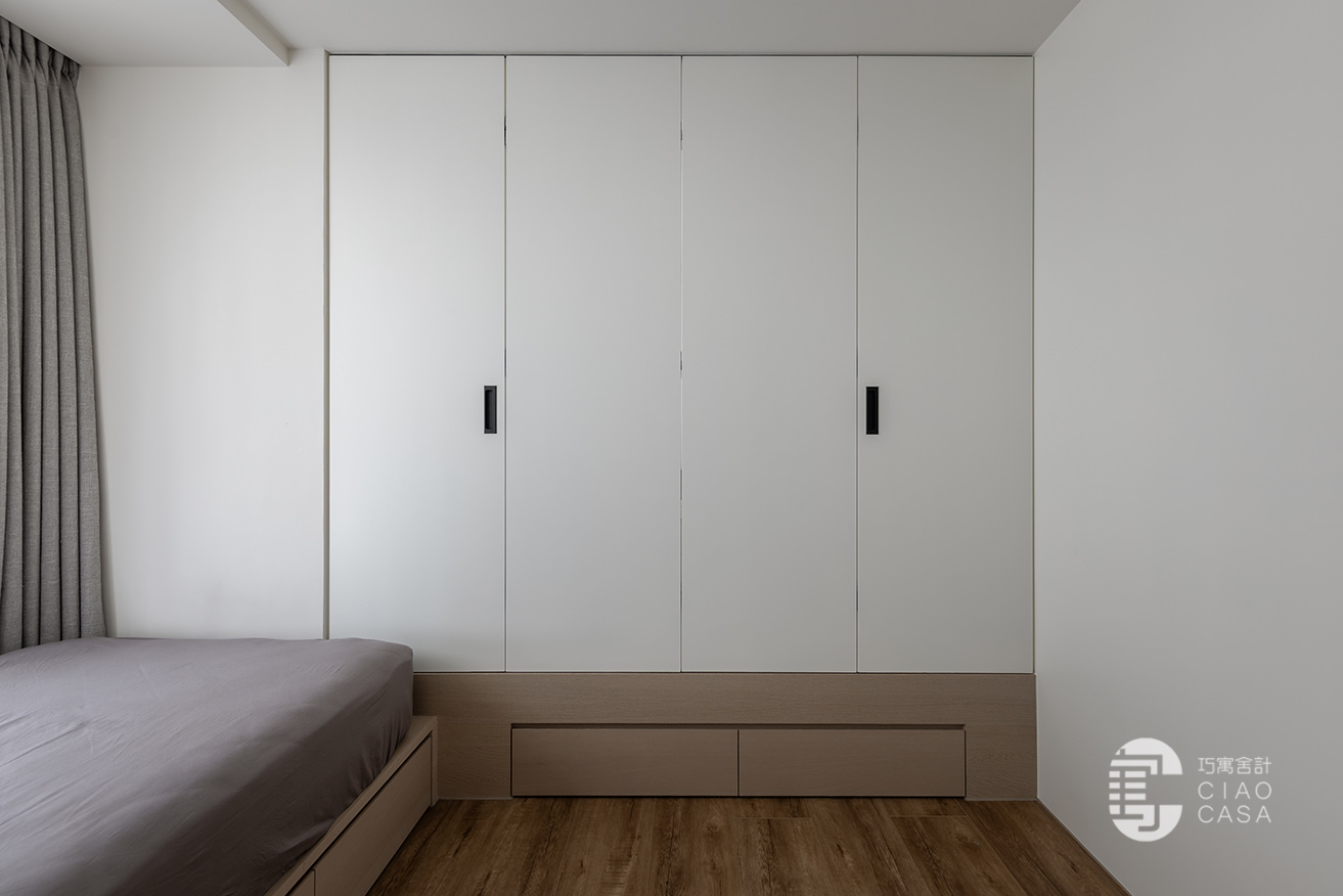 白潤的光底,是過濾熱鬧社交後,一塊忠於自我的靜謐角落,天花橫梁在輕薄微彎的邊緣勾勒下,與光帶發散的和緩詩意,共譜優美曲線。順著圓角而成的置頂衣櫃,循著低緩的音階律動,構織起上掀式梳妝台和床邊櫃。