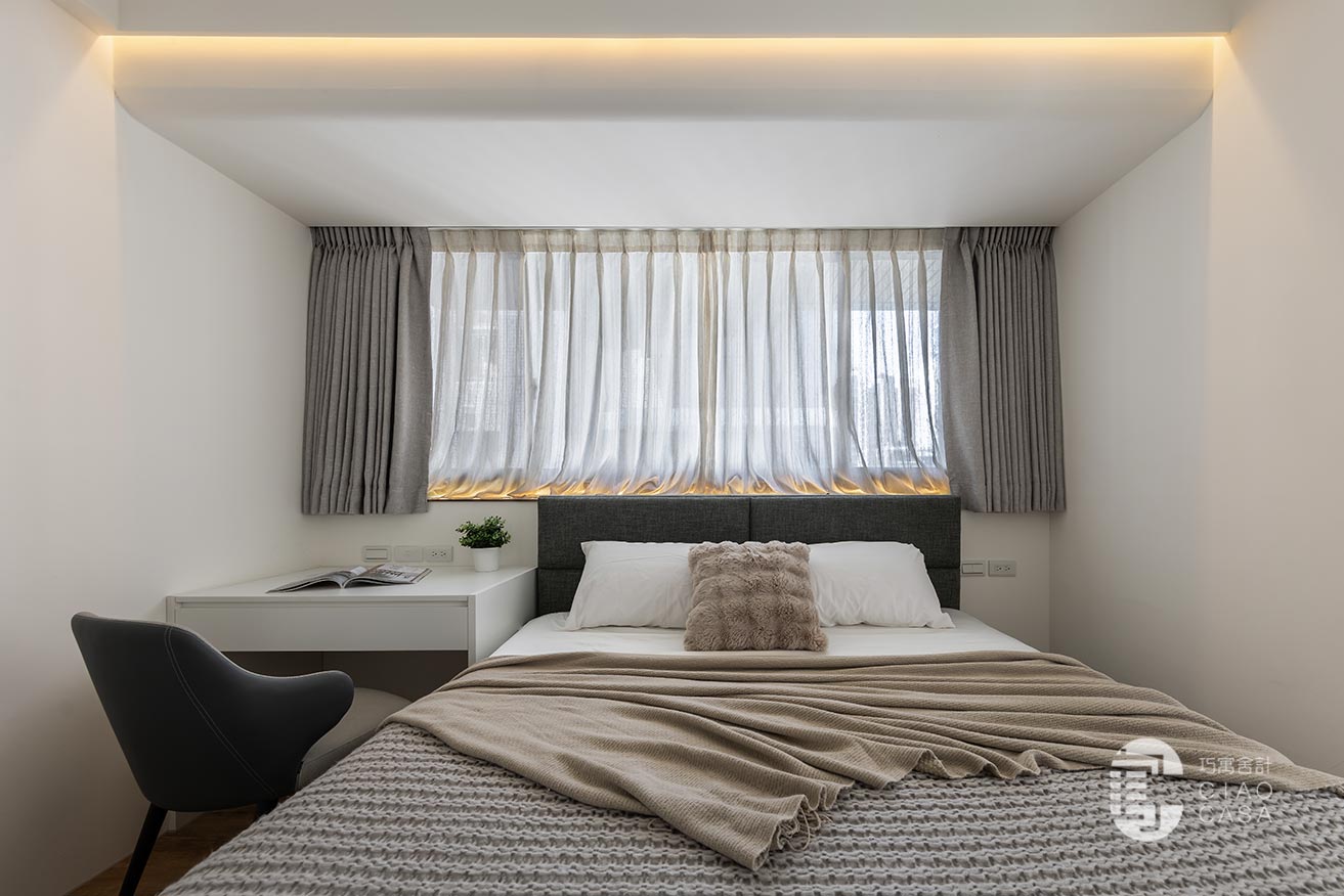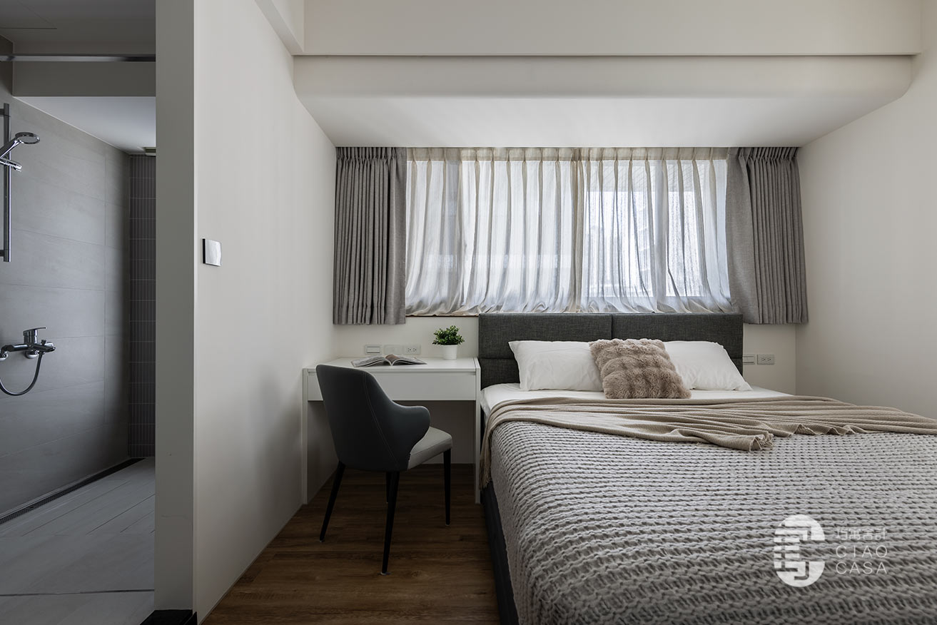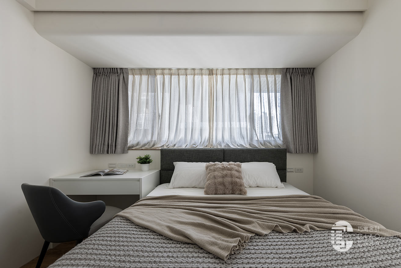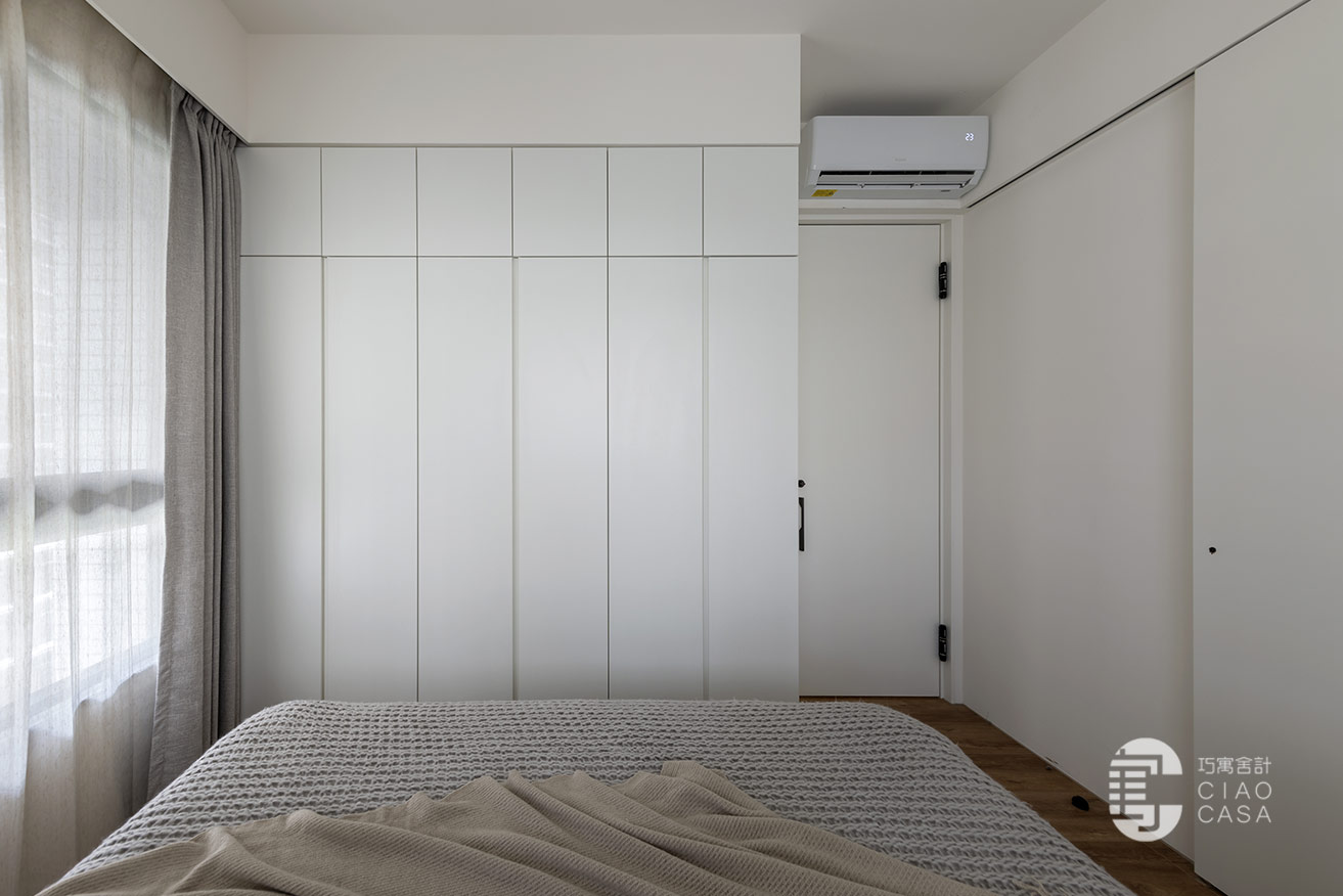白潤的光底,是過濾熱鬧社交後,一塊忠於自我的靜謐角落,天花橫梁在輕薄微彎的邊緣勾勒下,與光帶發散的和緩詩意,共譜優美曲線。順著圓角而成的置頂衣櫃,循著低緩的音階律動,構織起上掀式梳妝台和床邊櫃。