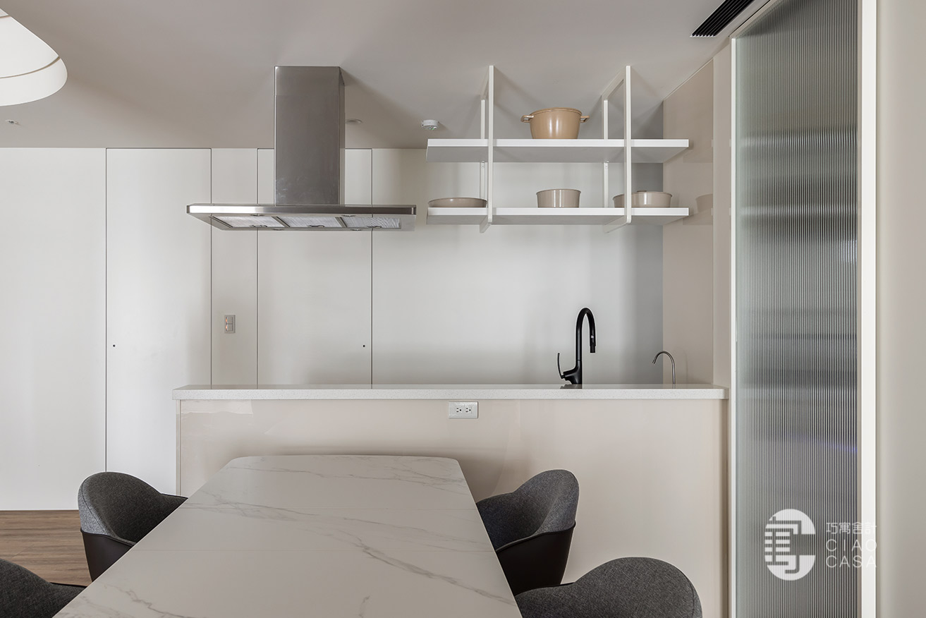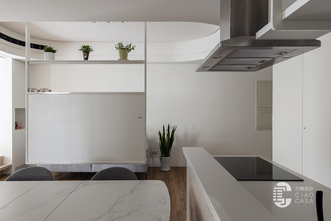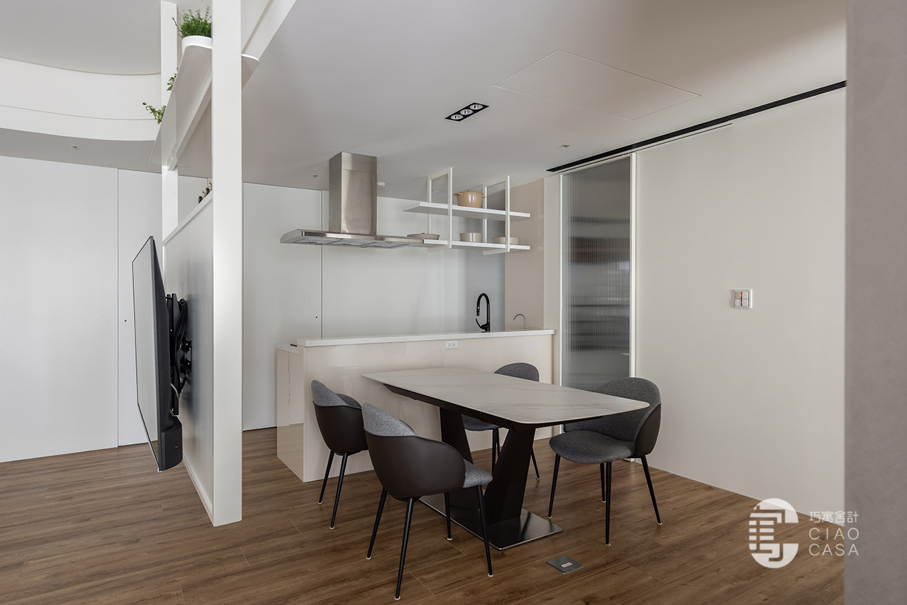 繞過電視牆後,便是寬敞舒適的美式餐廚區,恰如精彩的轉場,訴說著隨性而自由的慢活步調,而純白的層架上擺放著綠植盆栽,捎來清新鮮活的氣息,為空間挹注一抹自然之韻。廚具一隅高起的平台,增添了酒吧機能,輾轉在黑與白的色調之間,幻化出輕鬆愜意的微醺氛圍。