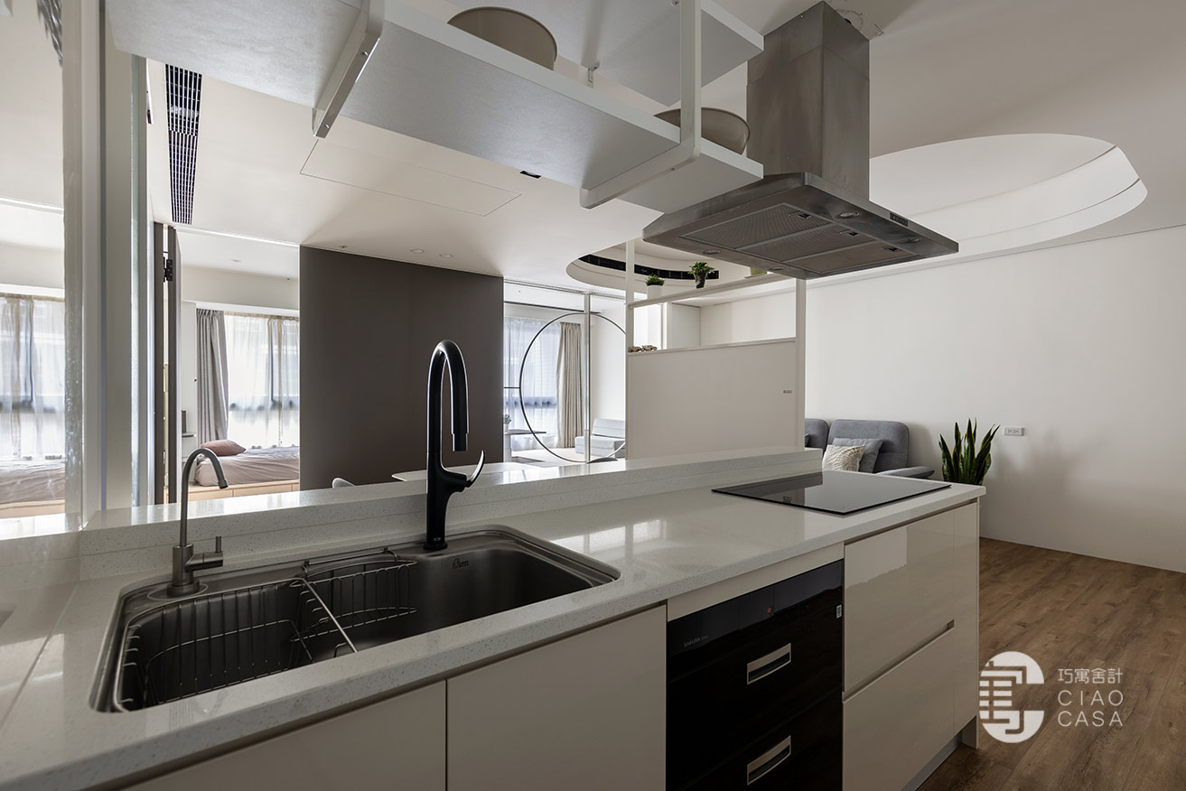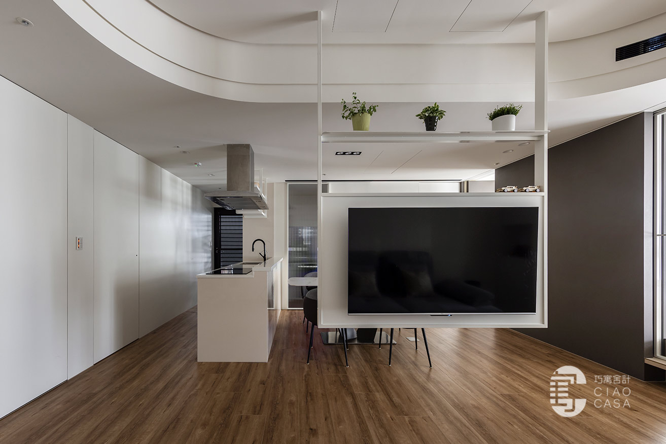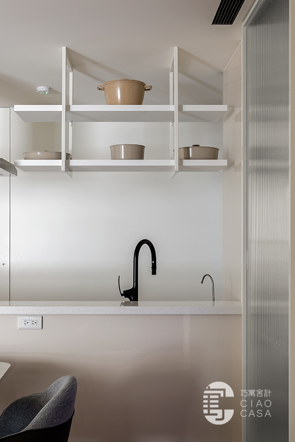繞過電視牆後,便是寬敞舒適的美式餐廚區,恰如精彩的轉場,訴說著隨性而自由的慢活步調,而純白的層架上擺放著綠植盆栽,捎來清新鮮活的氣息,為空間挹注一抹自然之韻。廚具一隅高起的平台,增添了酒吧機能,輾轉在黑與白的色調之間,幻化出輕鬆愜意的微醺氛圍。