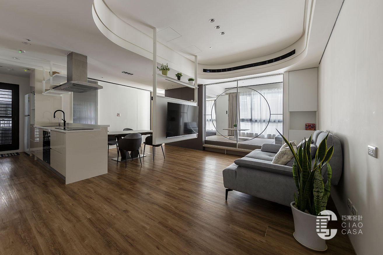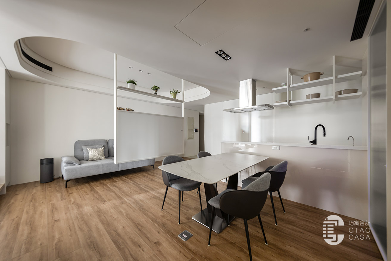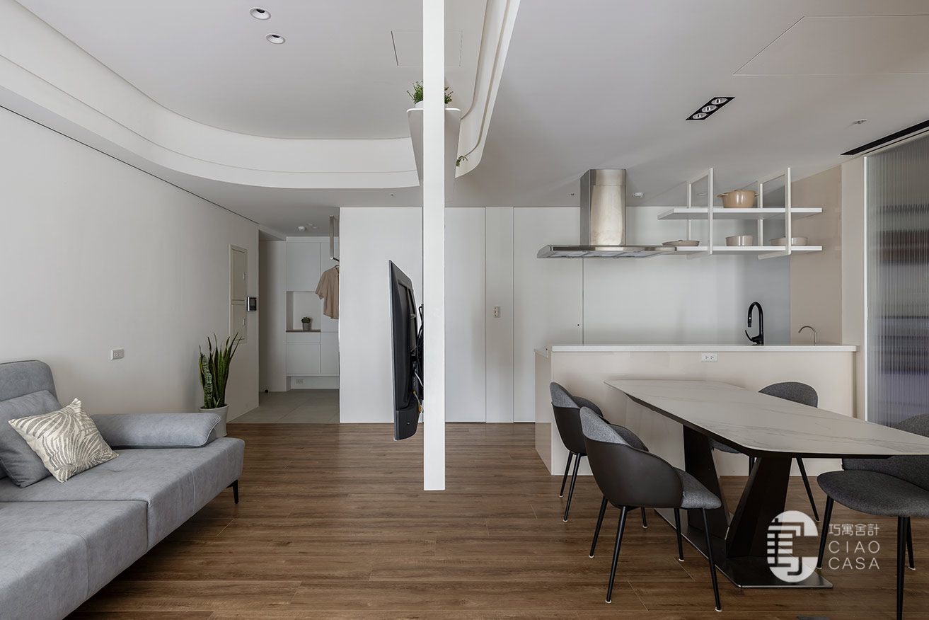 簡約的色調、俐落的線條、模糊的邊界,不拘形式也不被定義,由暖白與木質調和的底蘊,如水溫潤,自在流淌。設計師跳脫常規制式的格局定勢,降低區域的隔閡,極致放大公領域活動範圍,並妙用優雅婉轉的「圓」連袂天地壁,帶出迂迴流通的圓融感受,把屋主與家人細膩的情感,透過純粹簡潔的畫面傳遞。