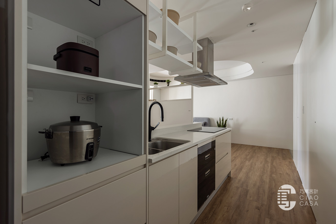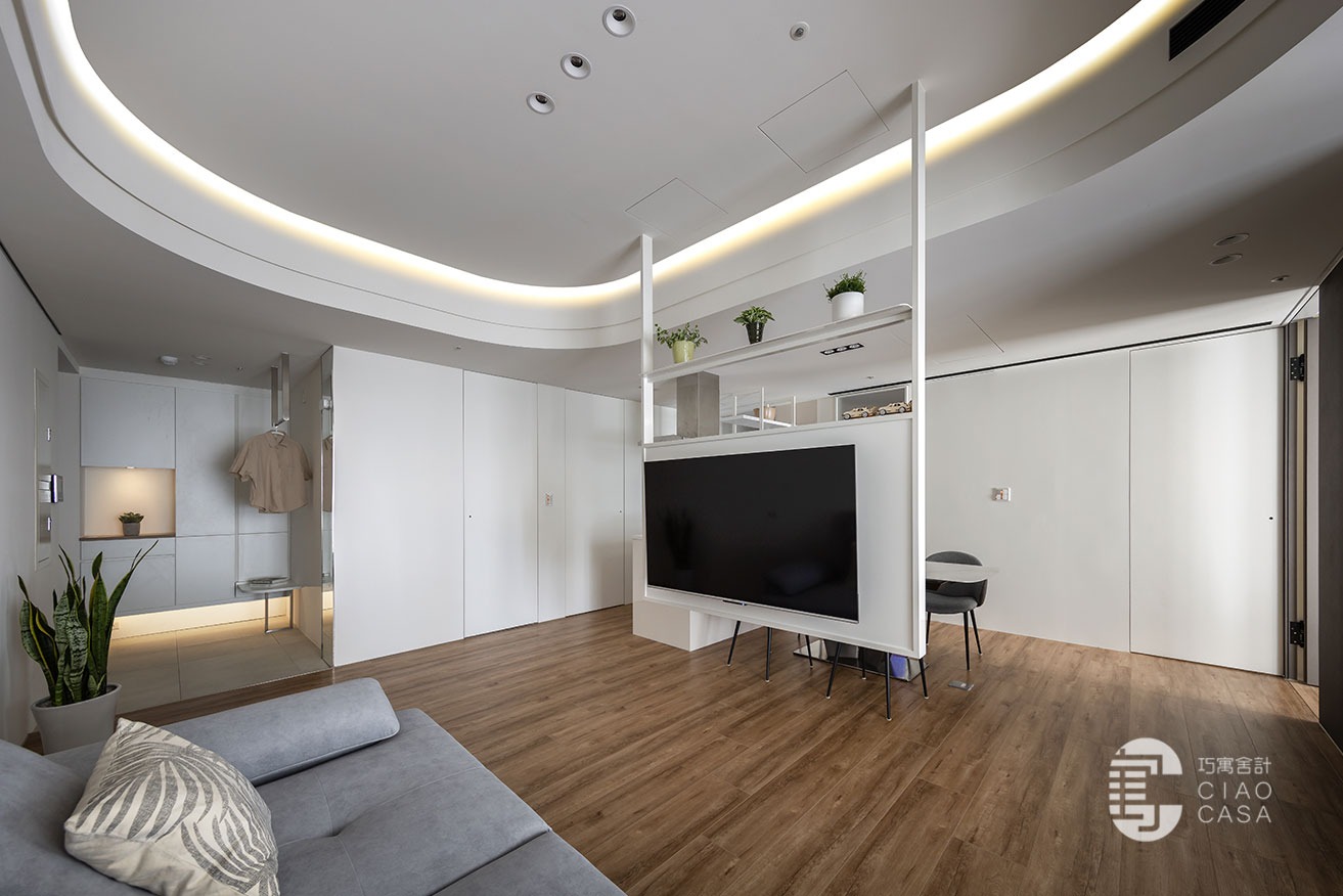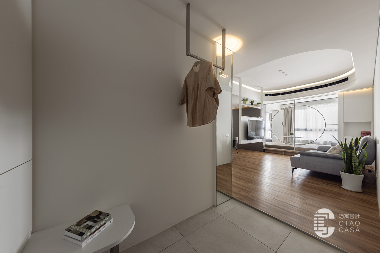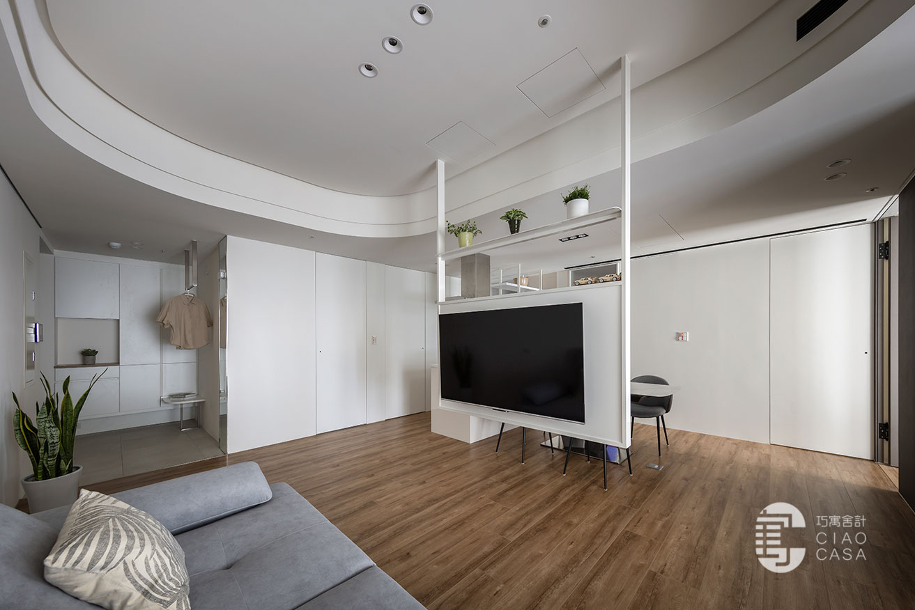簡約的色調、俐落的線條、模糊的邊界,不拘形式也不被定義,由暖白與木質調和的底蘊,如水溫潤,自在流淌。設計師跳脫常規制式的格局定勢,降低區域的隔閡,極致放大公領域活動範圍,並妙用優雅婉轉的「圓」連袂天地壁,帶出迂迴流通的圓融感受,把屋主與家人細膩的情感,透過純粹簡潔的畫面傳遞。