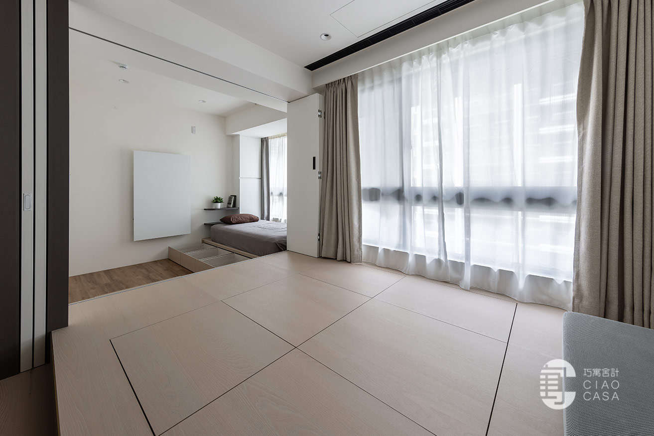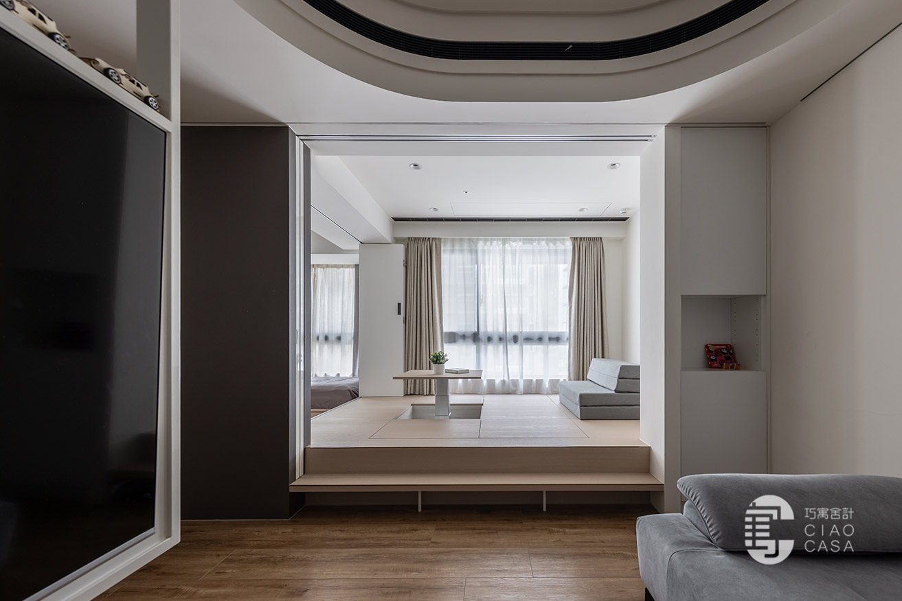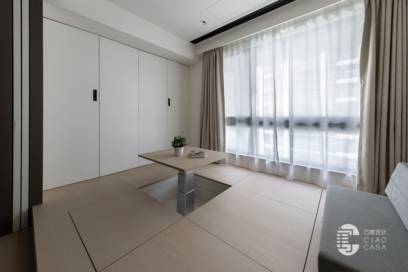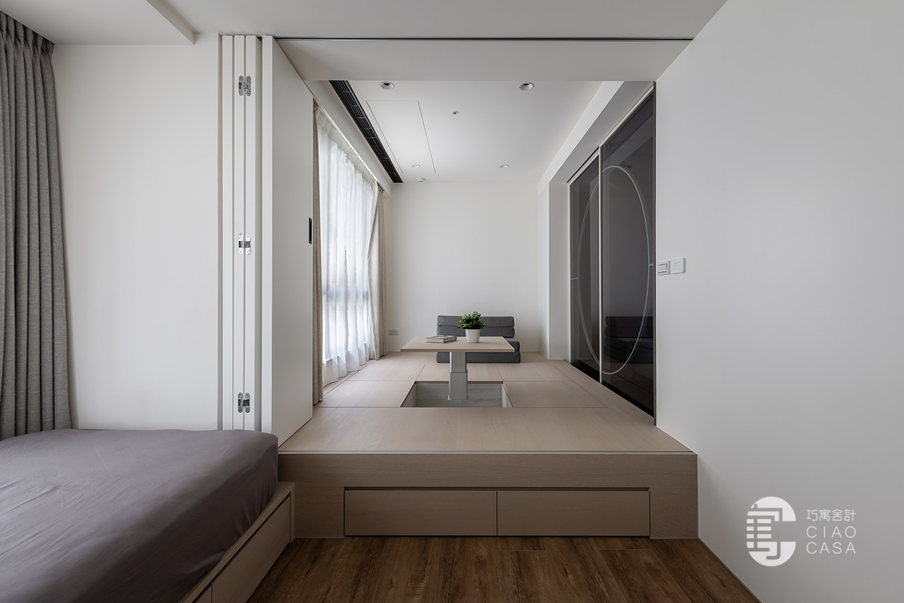 和室利用架高木地板,將豐富的收納化為一方疊蓆,並配置升降桌,多維呈現社交生活場景的可能;而兩域之間也以彈性折門,締結空間的交流與聚合。