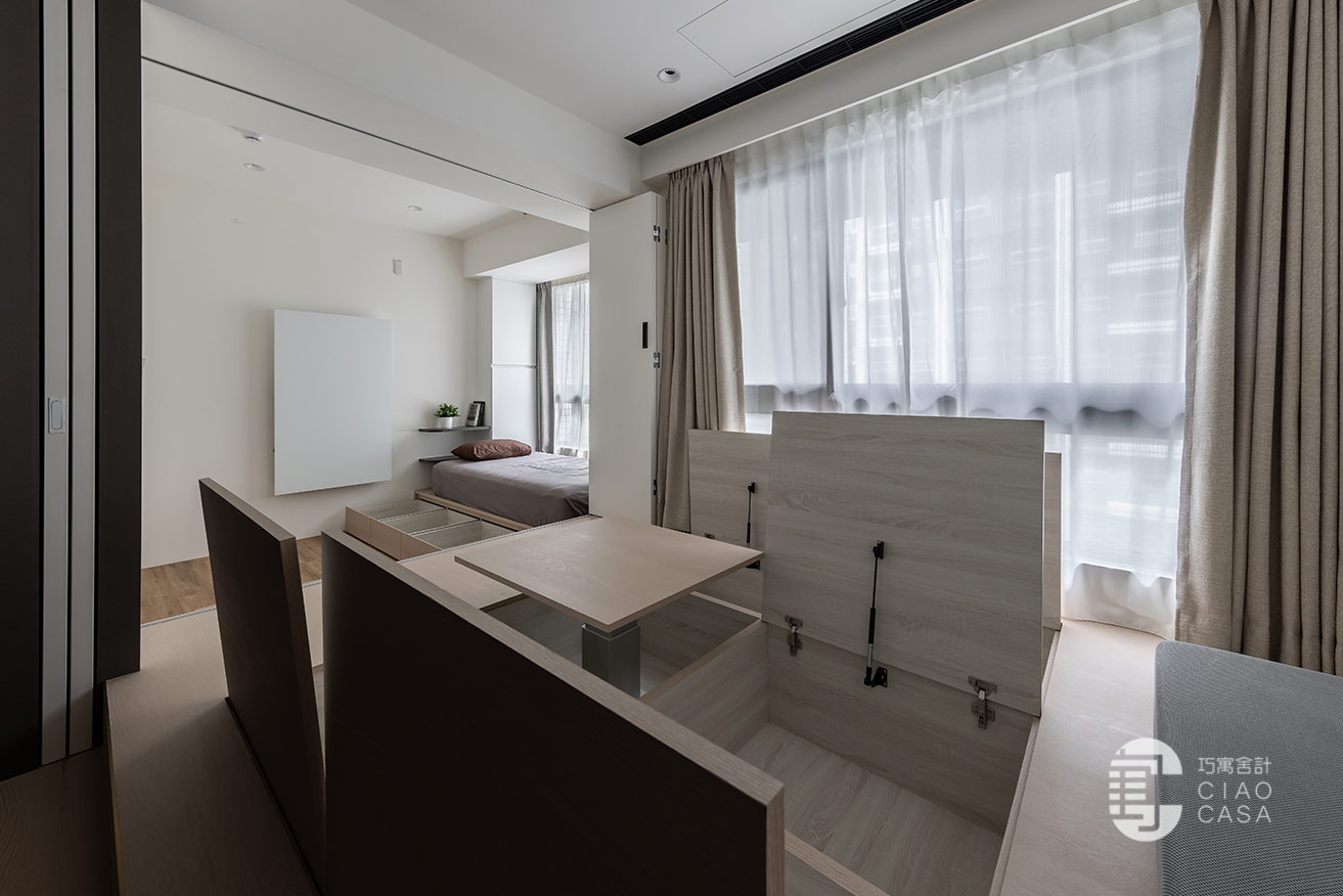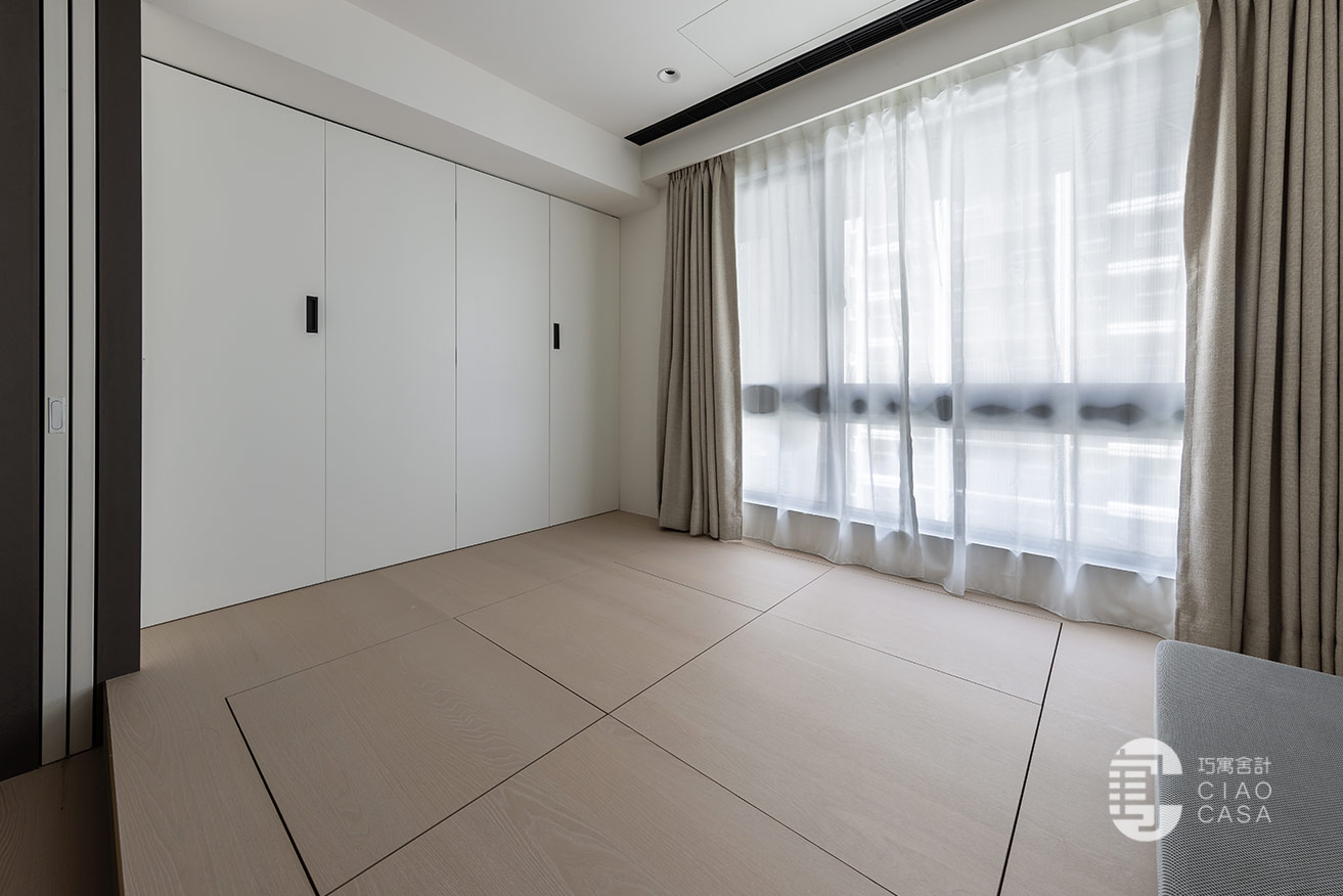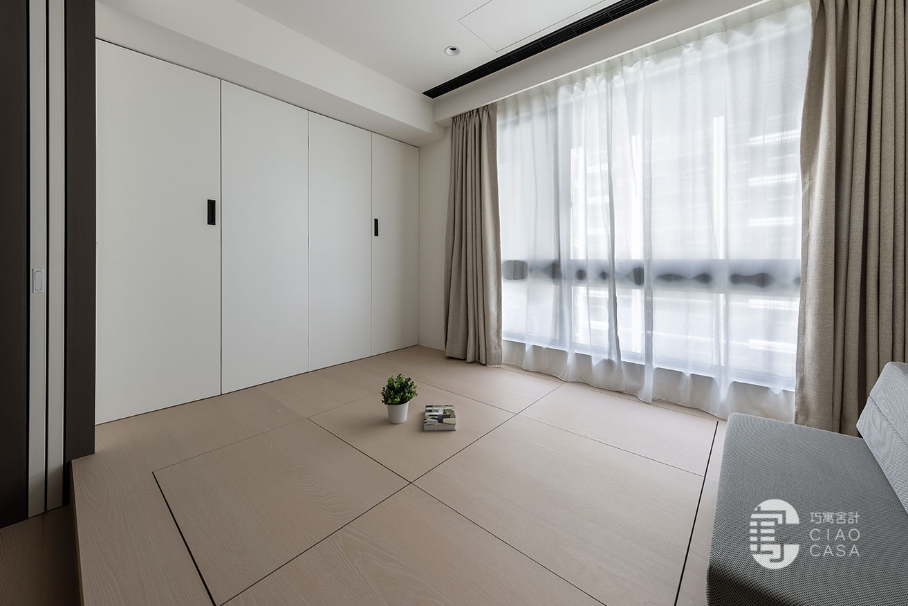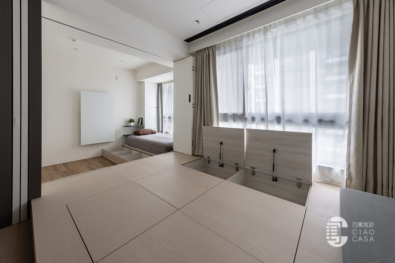 和室利用架高木地板,將豐富的收納化為一方疊蓆,並配置升降桌,多維呈現社交生活場景的可能;而兩域之間也以彈性折門,締結空間的交流與聚合。