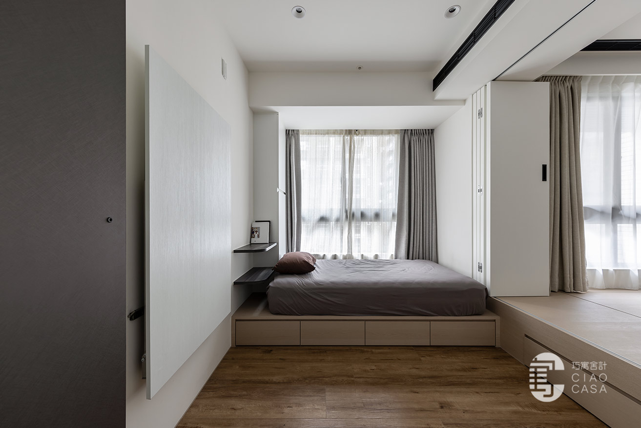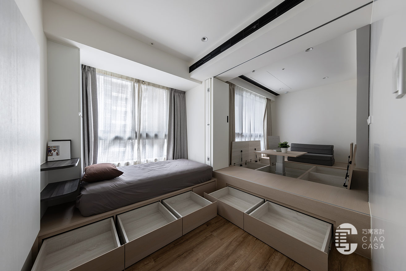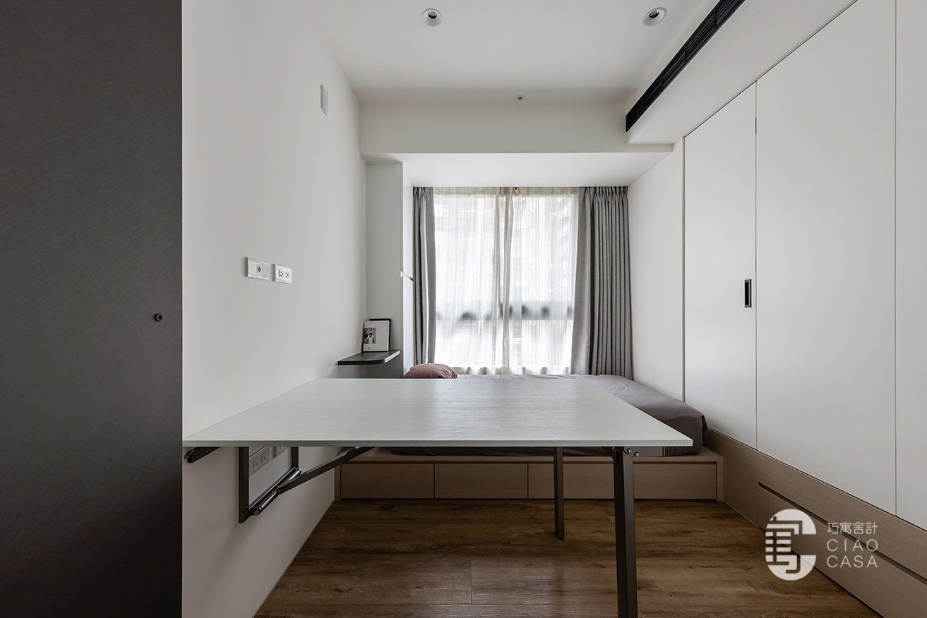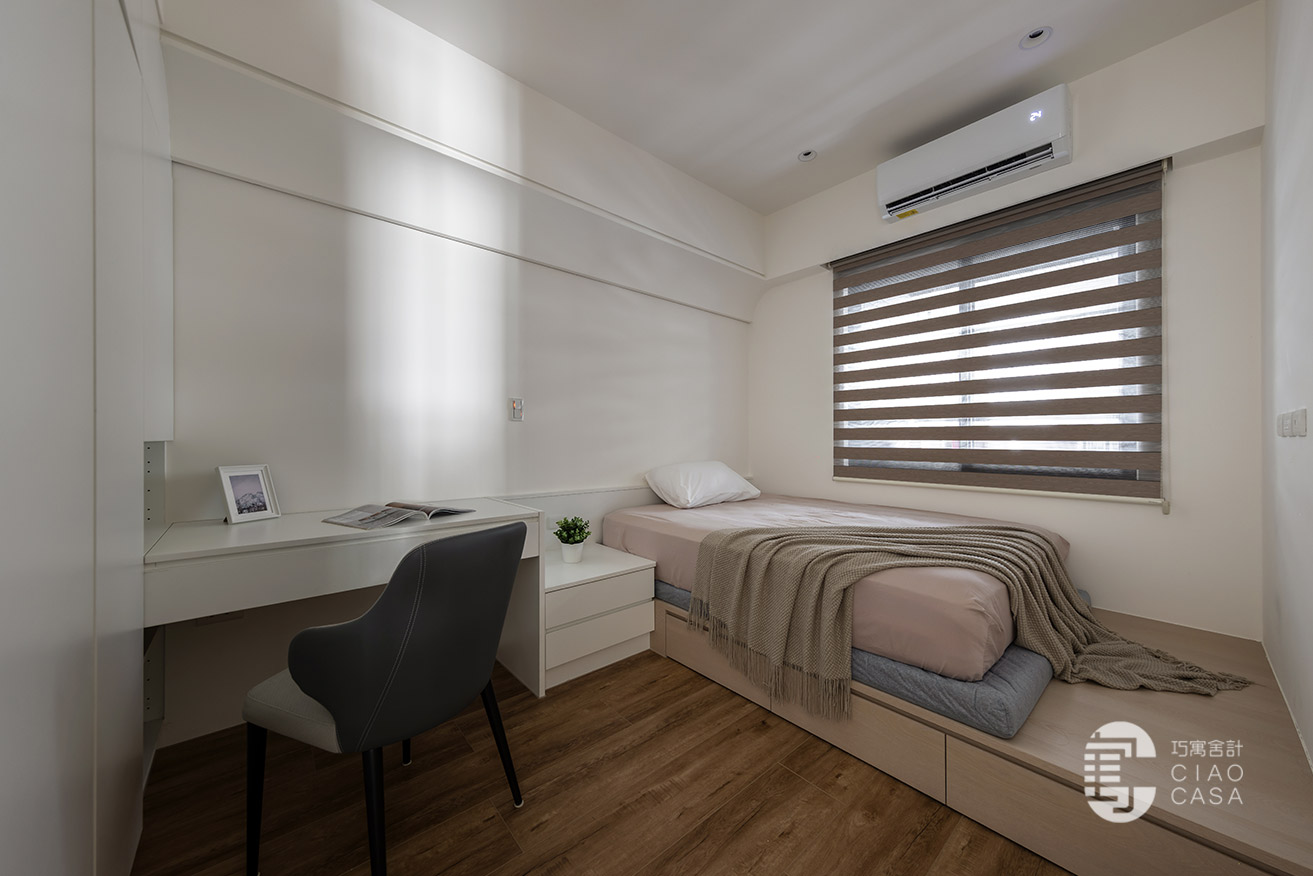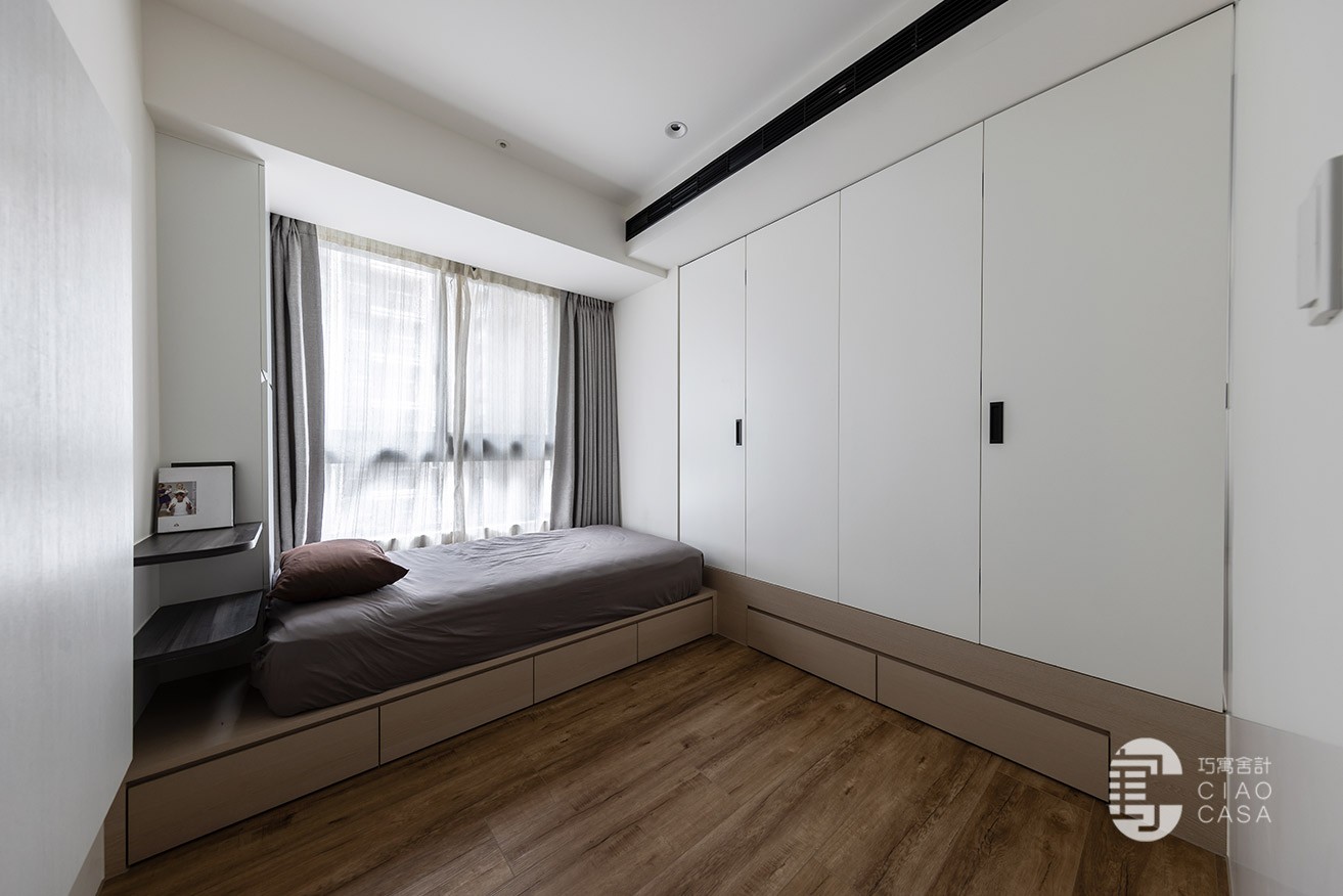 客房作為兒子回臺暫居時的房間,諸如折疊式的工作桌、臥榻床及架高木地板側邊的抽屜收納,以及把結構大柱轉成床頭機能等,隨著盈盈暖光流入,規整的細節與人文的溫度俱存,將休憩領地溫馨的歸屬感逐一刻繪。