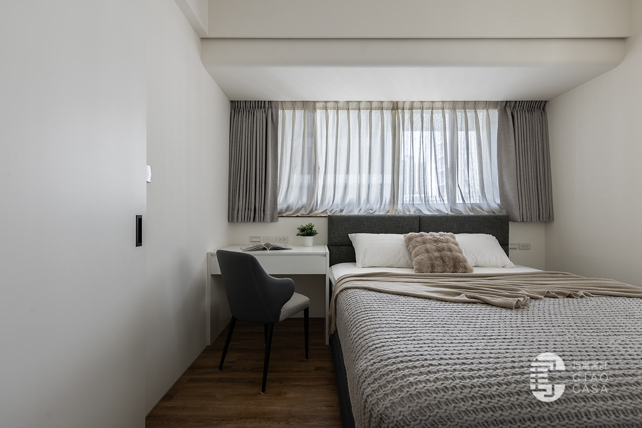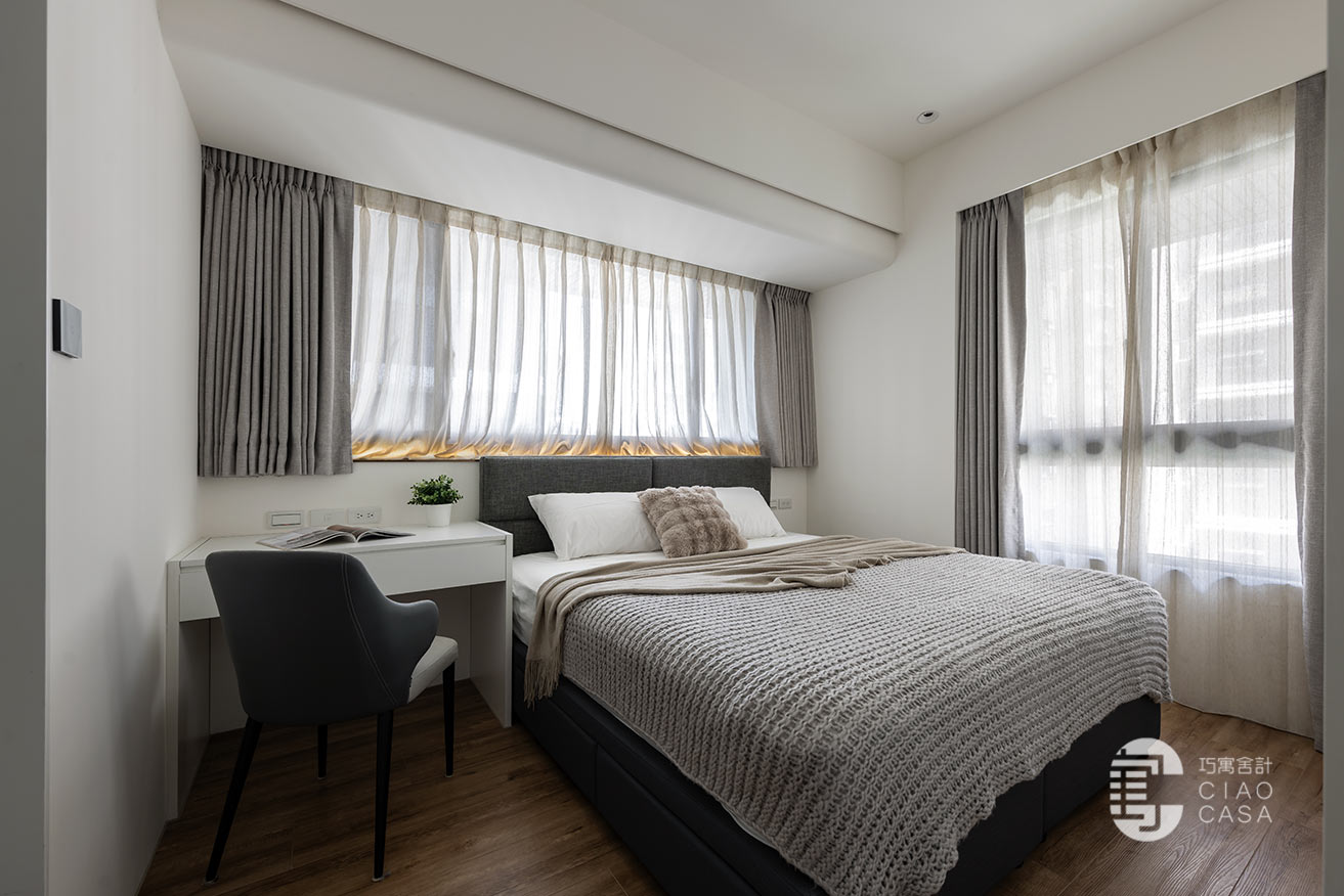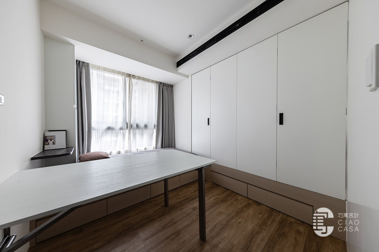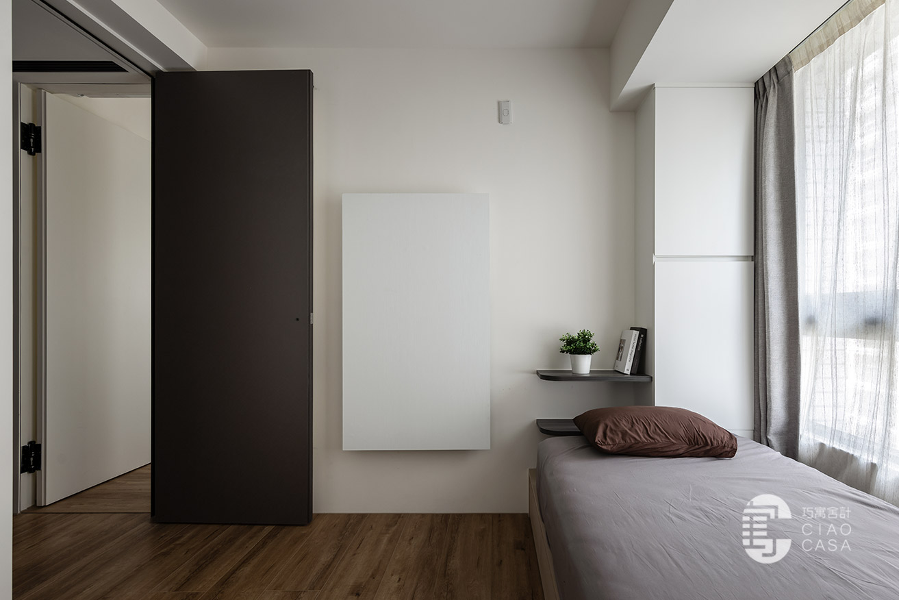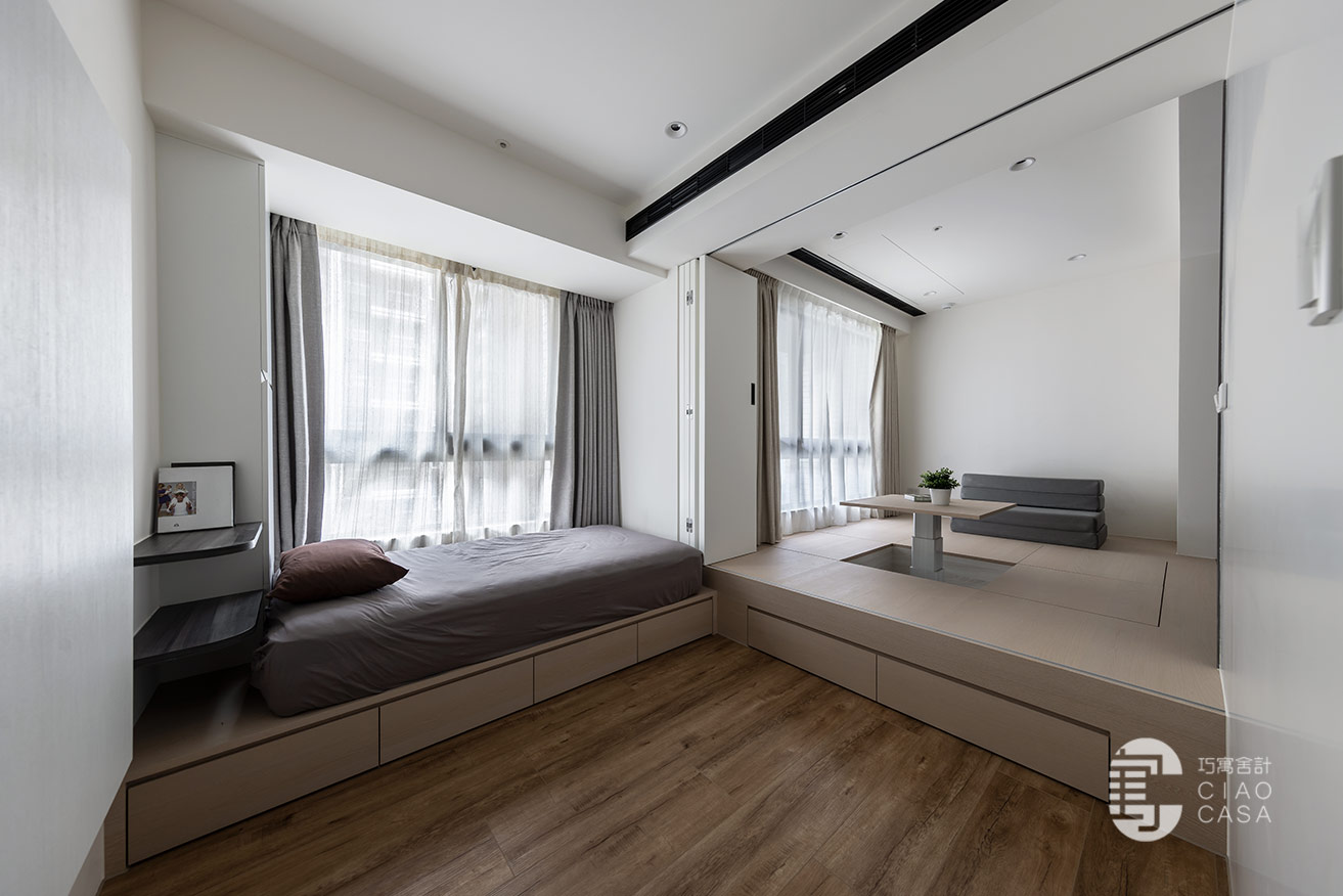 客房作為兒子回臺暫居時的房間,諸如折疊式的工作桌、臥榻床及架高木地板側邊的抽屜收納,以及把結構大柱轉成床頭機能等,隨著盈盈暖光流入,規整的細節與人文的溫度俱存,將休憩領地溫馨的歸屬感逐一刻繪。