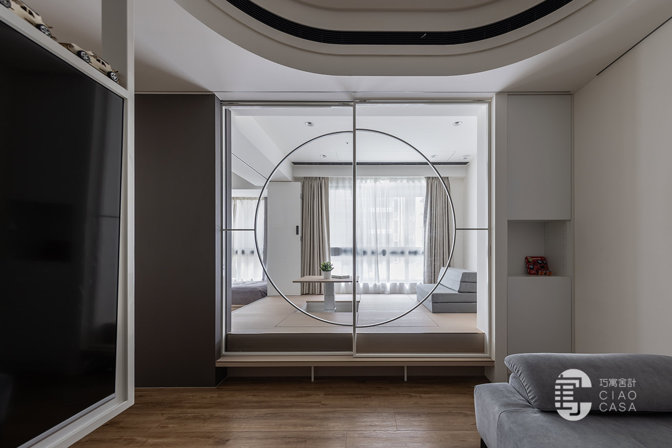 正如休閒區的玻璃門上的圓,形成如嵌入鏡框中的景色,透散著瑩瑩如月的光氛,亦昭示著家恆久的溫暖、團圓的意義。設計師對內打通全局,攤開空間尺幅,迎來敞闊舒心的一方悠境,對外則以虛實併合的立面、高低錯落的地坪,隱喻界分和室與客房的機能屬性。