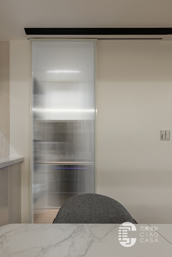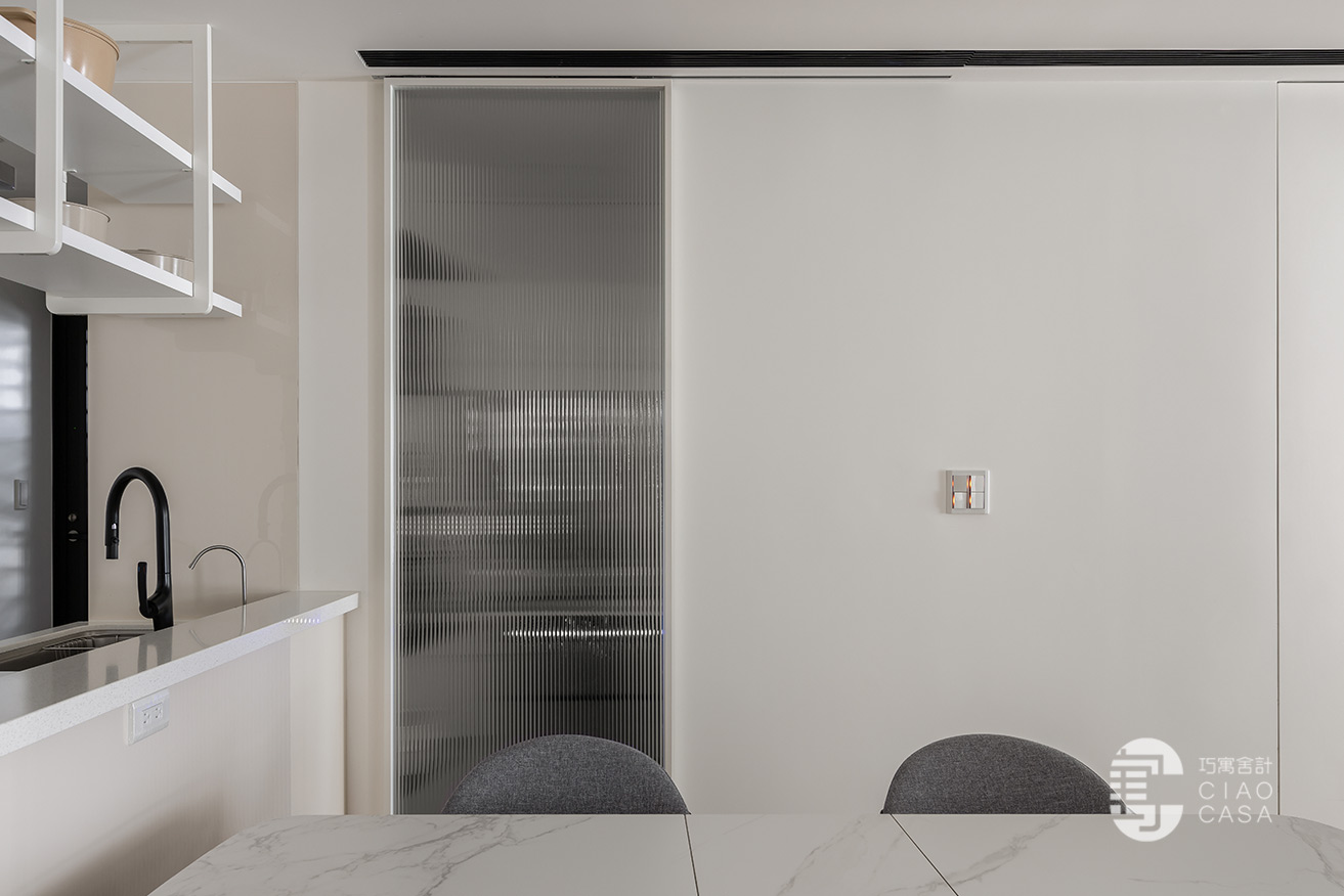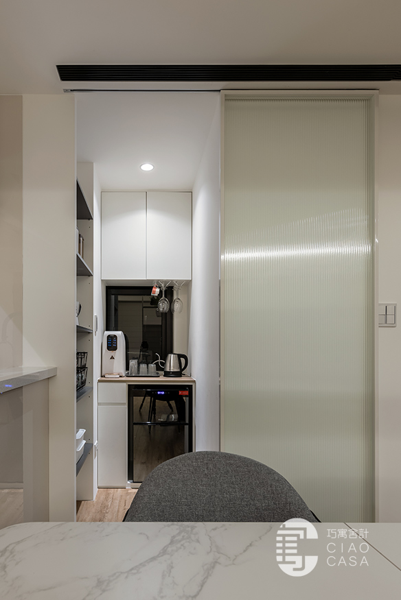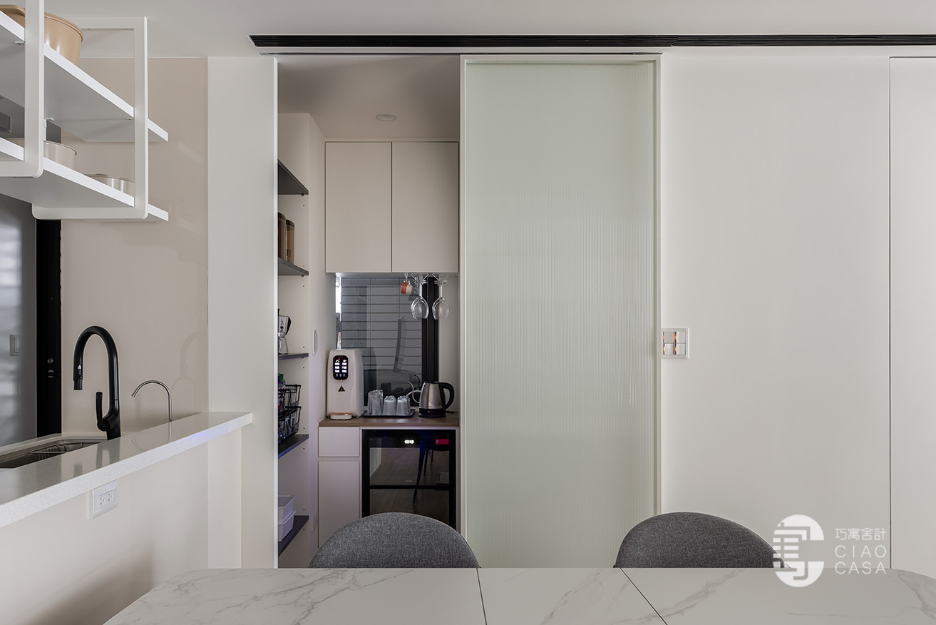 重塑後的格局,除了為廚房拓增電器櫃收納,更透過玻璃滑門將餐廳後方難以利用的畸零一角,改造成西方家庭必備的Snack Pantry,透過化零為整的精密構思,植入紅酒櫃、零食區、擺放咖啡機的餐邊櫃,讓小巧的空間兼容茶水間和調酒室等複合機能。