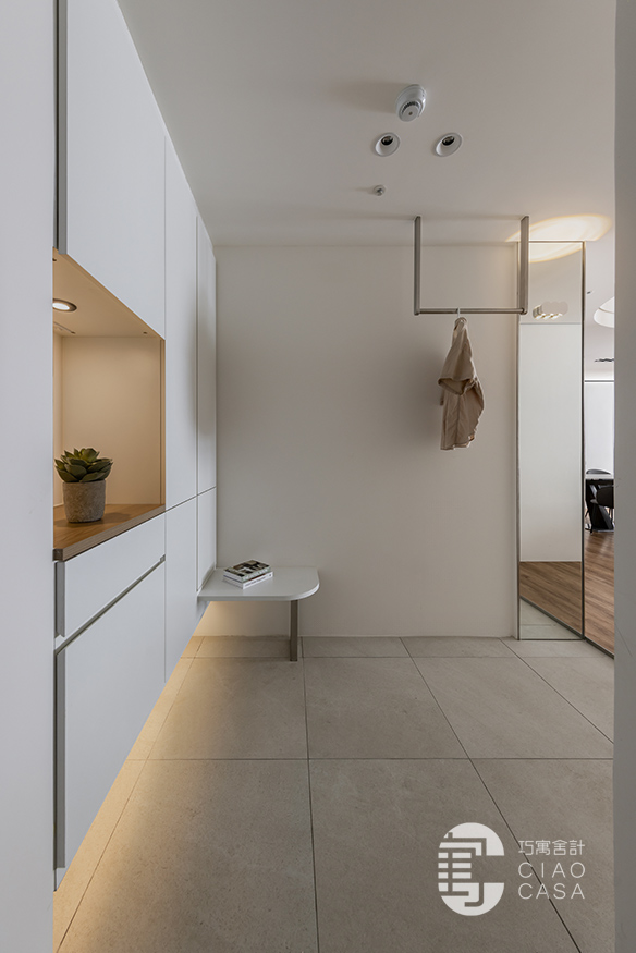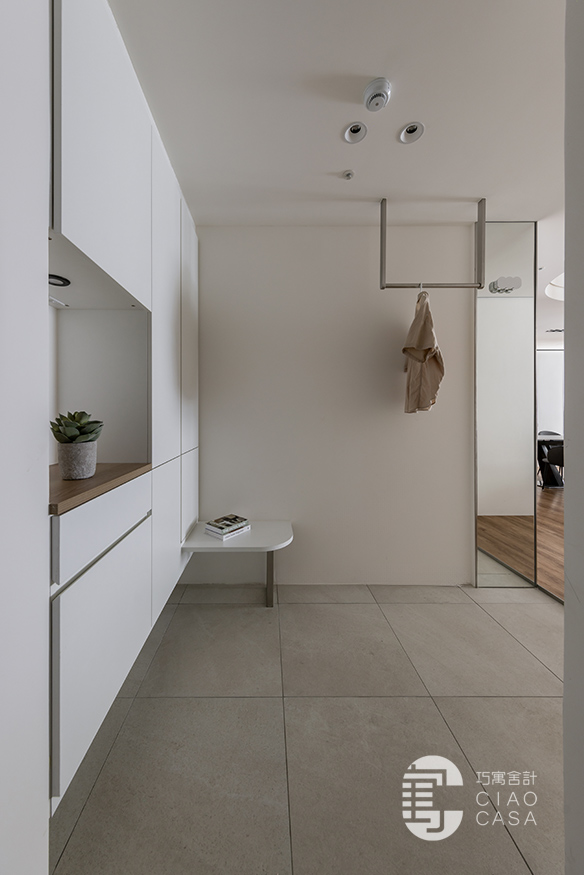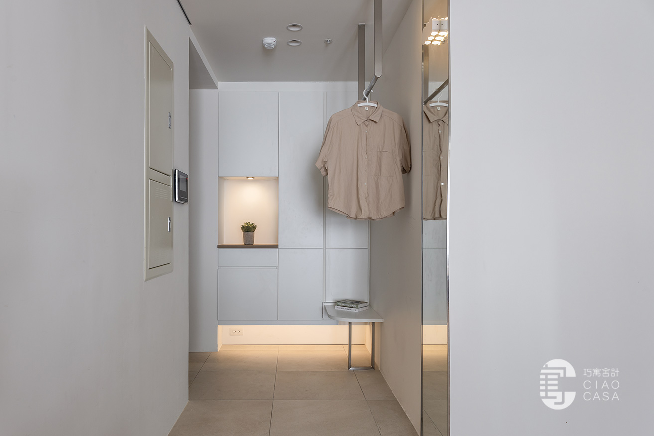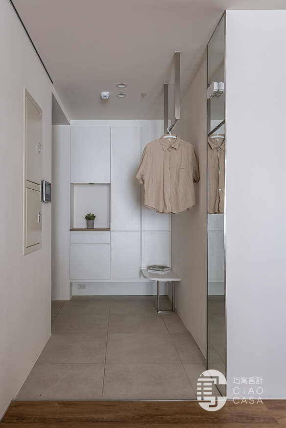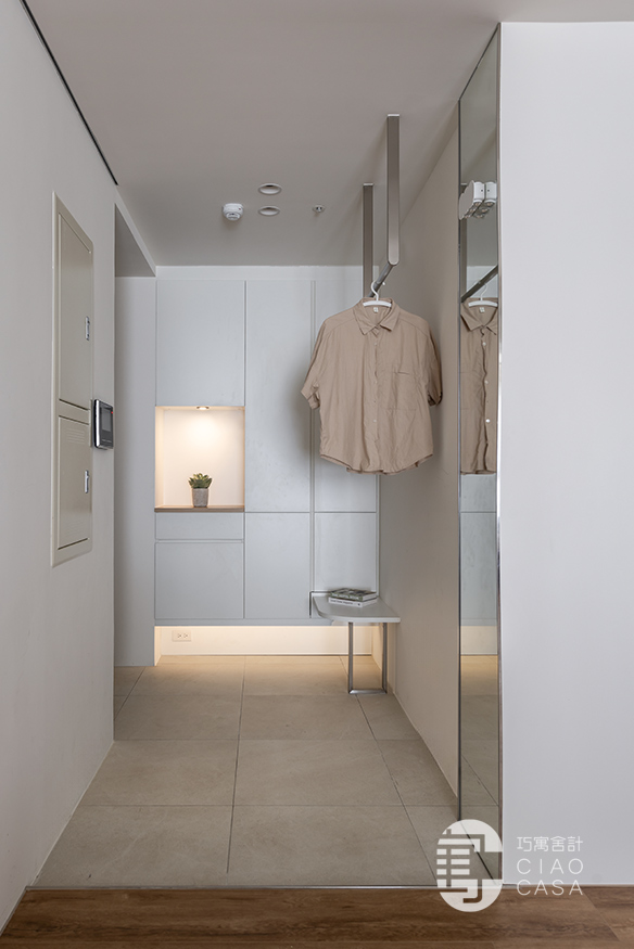 一方境地比照美式生活注重機能的概念,透過簡練的吊衣桿及穿衣鏡引領日常的出入動線,順理出流暢的空間邏輯。立鏡與地坪落差交界巧以不銹鋼邊條修飾,清晰框塑出內外分野。
