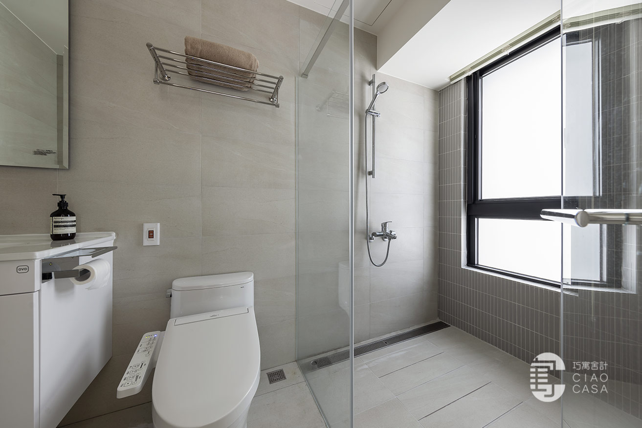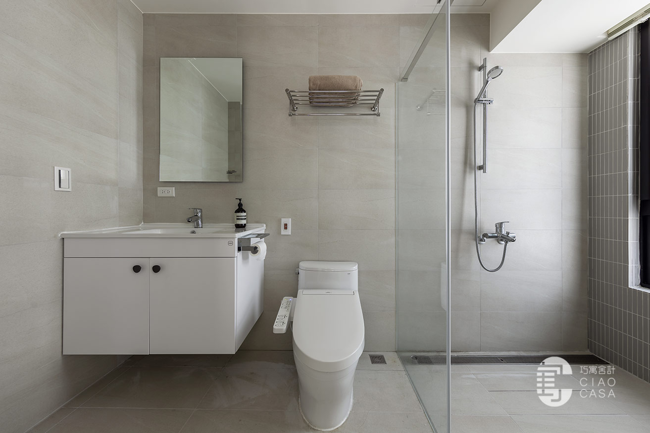 顧及外國女婿高大的身形,以及一家人使用上的便利性,主臥衛浴微調格局擴大尺幅,創造出寬適舒放的生活場域,同時以淡雅的灰質磁磚、密密鋪排的馬賽克磚平添細節,昇華空間的豐富層次。