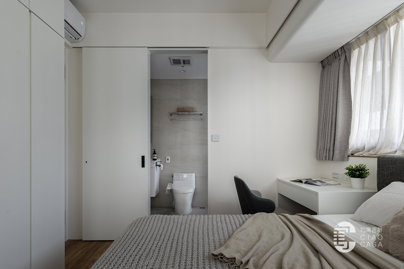 由光景、雅白編織的柔潤基底,輔以簡潔無痕的構面,呈現出渾然統一的恬適感。藏於隱藏門之後的次臥房,主要為屋主平時所居,考量日常使用的便利性與個人隱私,設計師以客浴為軸,採用穿引內外的雙動線鏈結公領域與次臥。