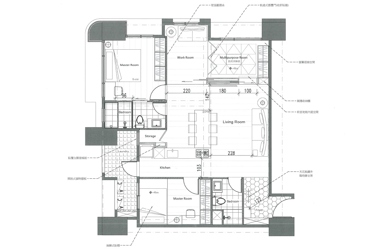 本案新成屋設計,平時為屋主一人所居的退休宅,亦是在異國成家立業的兒女回臺暫居的歸巢,江柄融設計師將空間以講究互動、交流的美式家庭生活為基礎,揉入全齡化的概念,藉著軒敞開闊的公領域、多元化的社交場景,讓洋溢著情感與記憶的家宅故事,有著一人獨居時的清寧自在、有著與子女們的歡聚時光、有著和孫子們的溫馨互動,一幕幕溫暖多樣的生活圖景皆悉數呈現。